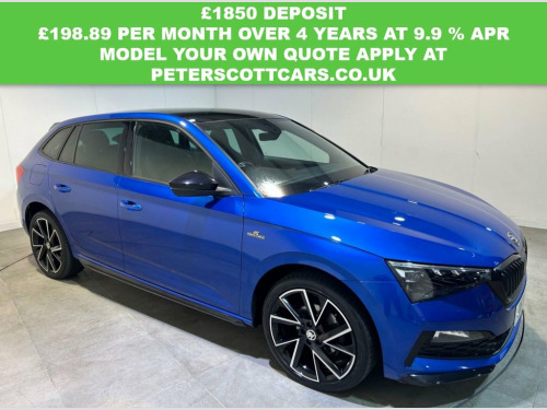 Stunning, high specification Skoda Scala Monte Carlo with Panoramic sunroof, Rear View Camera, Satellite navigation, Bluetooth audio and much more. Lovingly cared for example with service history, including just recently serviced less than 200 miles ago. Full set of premium branded Goodyear tyres gives an indication of the level of care and maintenance afforded to this high specification Skoda. We have uploaded a full Hd walkaround video to show the quality both inside and out of this Skoda Scala. Visit www.peterscottcars.co.uk, to reserve this car and apply for finance. Low rate finance available. Please ask for a personal quote or use the finance calculators on our website before submitting a full application. All finance can be arranged and signed remotely. Comes with both keys, service history all documentation full clear Gold HPI Report, 128 point AA Inspection Report carried out by AA engineers including a 5 mile test drive before issuing the 'Pass' certificate and the 5 page inspection report. AA History Check Reprt and 12 months AA Breakdown Cover included. Please call or message if you require further information or to make an arrangement to view. 12V Socket on Central Console, 18in Alloy Wheels - Vega in Black, 2 USB-C Ports, 3-Spoke Sports Leather Multi-Function St, ABS - Anti-Lock Braking System, Alarm, Aluminium Pedals, Ambient Lighting White, Amundsen Satellite Navigation with 9.2in, Anti-Theft Locking Wheel Bolts, Automatic Headlight Control, Basic LED Headlights with LED Daytime Ru, Black Roof Spoiler, Bluetooth, Bolero Radio with 8in Touchscreen Displa, Carbon Effect Decorative Inserts, Care Connect and Infotainment Online 1 Y, Chrome Interior Door Handles, Cruise Control, Curtain Airbags, DAB Radio, Door Handles - Body Coloured, Door Mirrors - Black, Door Mirrors - Electrically Folding, Drivers and Front Passenger Air Bag, Em