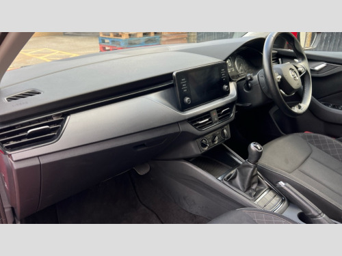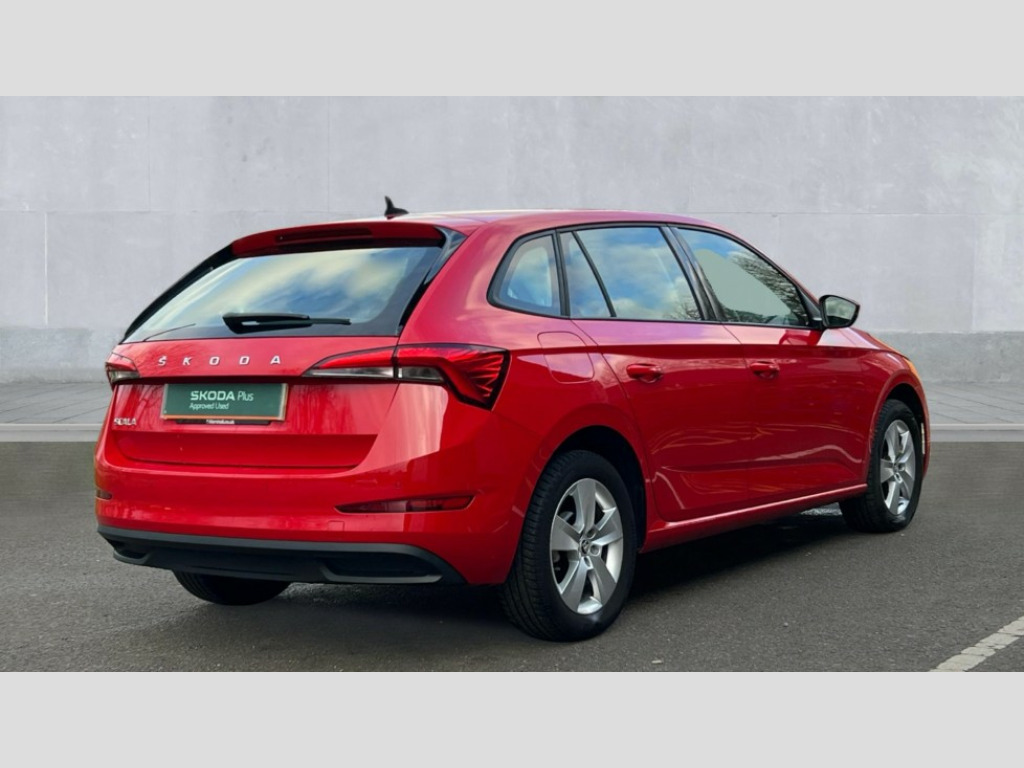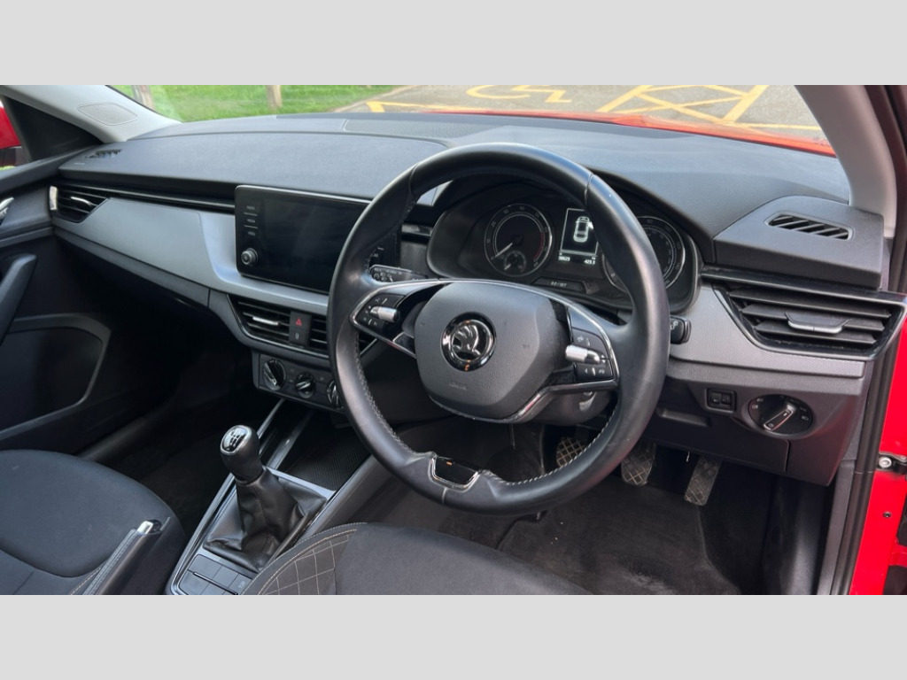 Skoda Scala 1.0 TSI 110 SE 5dr Bluetooth system, Easy light assist, Front assist system, Lane assist, PAS, Rain and light assist with auto dimming rear view mirror, Speed limiter, 2 USB - C ports, 8 loudspeakers, Bolero radio with 8" touchscreen display, DAB Digital radio, Body colour door mirrors and handles, Chrome grille surround, Electrically adjustable and heated door mirrors, Front and rear electric windows, Tinted windows, 12V Accessory socket in centre console, Chrome inner door handles, Cloth upholstery, Decor strip on dashboard and door panel, Front centre armrest with stitching, Front head restraints, Glasses storage in roof liner, Height adjustable passenger seat, Instrument cluster with chrome painted decor ring, ISOFIX for rear passenger seat, Leather gearknob and handbrake lever, Manual lumbar support for front seats, Reading lights for driver and front passenger, Sun visor with make up mirror for front passenger, Third rear headrest, Umbrella, 3x3 point rear seatbelts, Curtain airbags, Emergency call and proactive services, Front head and side airbags, Hill hold control, One tone horn, Passenger airbag switch off function, Seat belt reminder for all seats, Alarm, Anti-theft wheel bolts, Remote central locking with 2 remote folding keys, SAFE function for remote central locking, Temporary space saver wheel