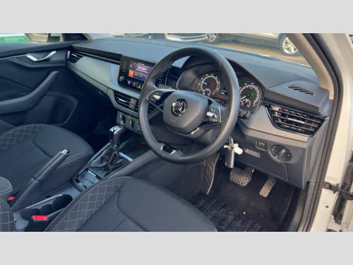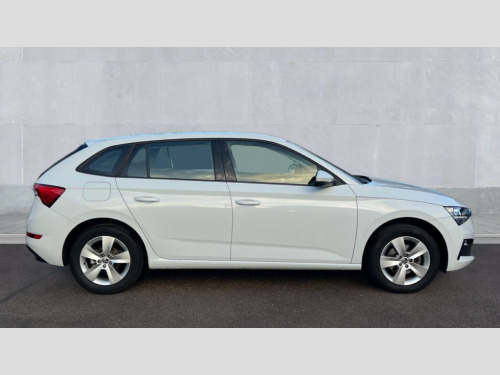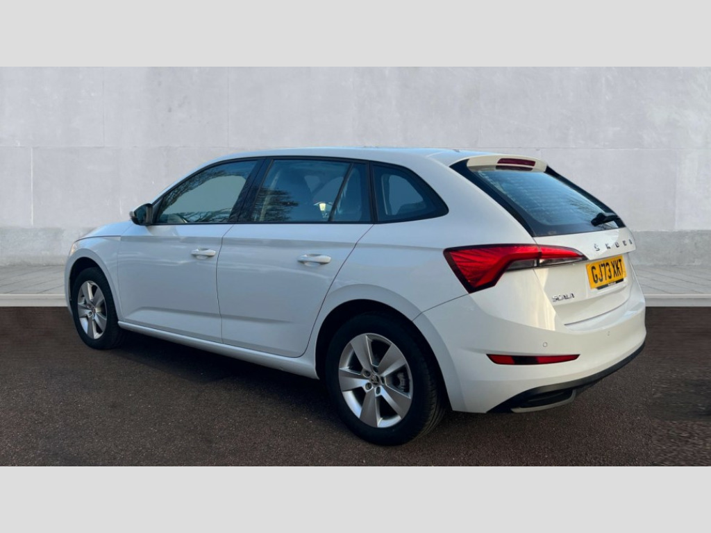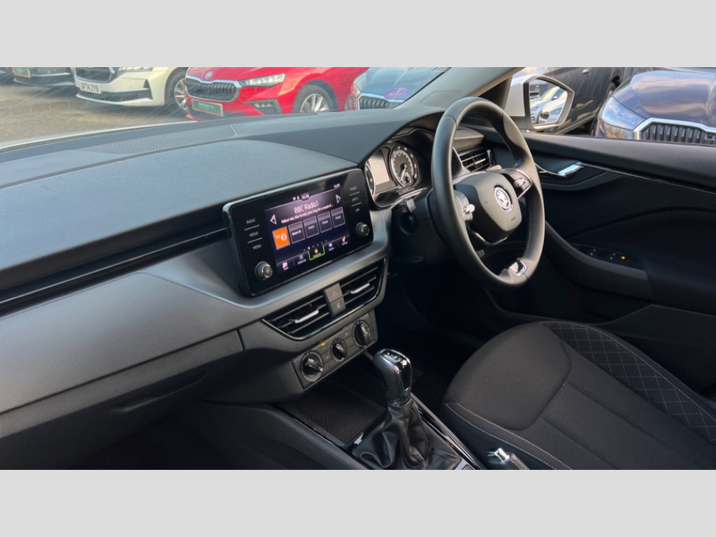 Skoda Scala 1.0 TSI 110 SE 5dr DSG Bluetooth system, eCall emergency system, PAS, Rain and light assist with auto dimming rear view mirror, Speed limiter, Tailgate, 2 USB - C ports, 8 loudspeakers, Bolero radio with 8" touchscreen display, DAB Digital radio, 3rd brake light, Automatic headlamp activation with Coming home and Leaving home feature, Body colour door mirrors and handles, Chrome grille surround, Dimming rear view mirror with black frame, Electrically adjustable and heated door mirrors, Front and rear electric windows, LED rear lights, Rear side wing doors, Rear wiper, Tinted windows, 12V Accessory socket in centre console, 3 seat bench in 2nd row, Chrome inner door handles, Cloth upholstery, Front head restraints, Glasses storage in roof liner, Height adjustable drivers seat, Height adjustable passenger seat, Instrument cluster with chrome painted decor ring, ISOFIX for rear passenger seat, Leather gearknob and handbrake lever, Manual lumbar support for front seats, Reading lights for driver and front passenger, Single front passenger seat, Sun visor with make up mirror for front passenger, Third rear headrest, Umbrella, 3x3 point rear seatbelts, Curtain airbags, Emergency call and proactive services, Front head and side airbags, Hill hold control, Manual rear child locks, One tone horn, Passenger airbag switch off function, Seat belt reminder for all seats, Alarm, Anti-theft wheel bolts, Remote central locking with 2 remote folding keys, SAFE function for remote central locking, Temporary space saver wheel