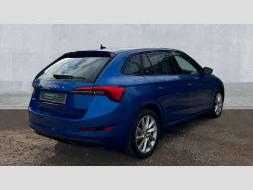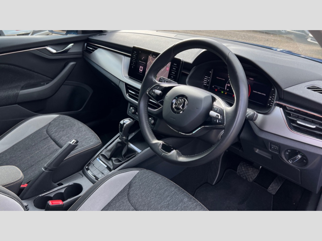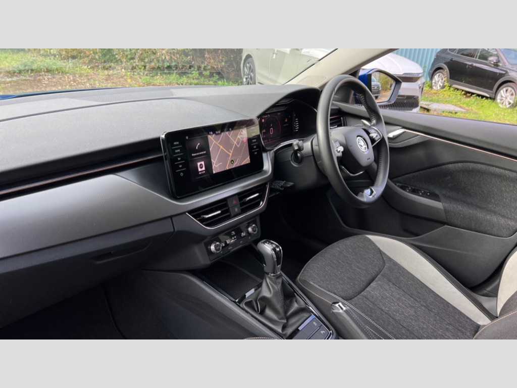 Skoda Scala 1.0 TSI 110 SE L 5dr DSG Amundsen satellite navigation with 9.2" glass colour touchscreen with virtual cockpit, web radio, Android Auto, Bluetooth system, Colour multifunction trip computer, eCall emergency system, PAS, Rain and light assist with auto dimming rear view mirror, Rear view camera, Speed limiter, Tailgate, Traffic sign recognition, Virtual cockpit, Voice control system, Wireless SmartLink for Apple Car Play, 2 USB - C ports, 8 loudspeakers, DAB Digital radio, 3rd brake light, Automatic headlamp activation with Coming home and Leaving home feature, Body colour door mirrors and handles, Chrome grille surround, Dimming rear view mirror with black frame, Electric folding door mirrors, Electrically adjustable and heated door mirrors, Front and rear electric windows, Front fog lights with cornering function, LED rear tail lights with dynamic indicators, Privacy glass, Rear side wing doors, Rear wiper, Tinted windows, 12V Accessory socket in centre console, 3 seat bench in 2nd row, Chrome inner door handles, Chrome on gear and handbrake lever, Chrome strip on the dash and door panel, Dual zone climate control, Front head restraints, Glasses storage in roof liner, Instrument cluster with chrome painted decor ring, ISOFIX for rear passenger seat, Leather gearknob and handbrake lever, Manual lumbar support for front seats, Net in centre console, Reading lights for driver and front passenger, Single front passenger seat, Sun visor with make up mirror for front passenger, Textile floor mats, Third rear headrest, Umbrella, 3x3 point rear seatbelts, Curtain airbags, Emergency call and proactive services, Front head and side airbags, Hill hold control, Manual rear child locks, One tone horn, Passenger airbag switch off function, Seat belt reminder for all seats, Alarm, Anti-theft wheel bolts, Keyless entry with start/stop button, Remote central locking with 2 remote folding keys, SAFE function for remote central locking, Latice grey decorative insert with copper hot stamping, Temporary space saver wheel