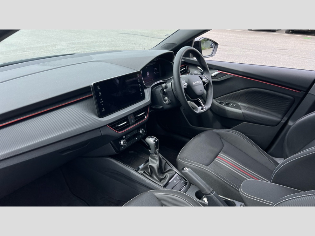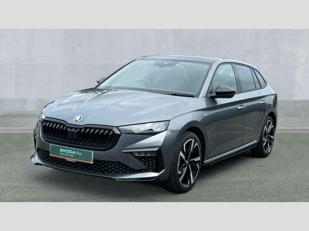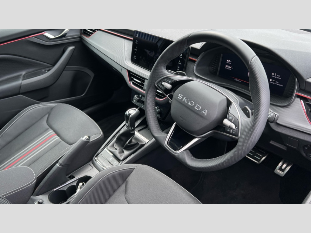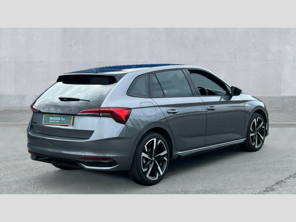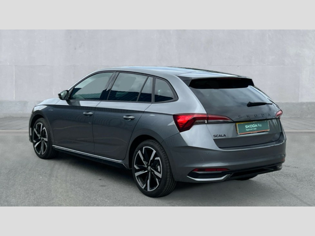 Skoda Scala 1.0 TSI 116 Monte Carlo Edition 5dr DSG Advanced driver attention and drowsiness monitor, Bluetooth, e-Call (emergency call), Front assist system, PAS, Rear parking sensors, Rear view camera, Speed limiter, Tailgate, Traffic sign recognition, Virtual Cockpit - 10.25" digital display, Voice control system, Wireless smartlink, 4 USB C ports, 8 Speakers, 9.2" Skoda navigation display, DAB radio, Auto dimming rear view mirror, Automatic headlamp activation with Coming home and Leaving home feature, Automatic high/low beam, Automatic intermittent wipers, Black door mirrors, Black lettering on boot lid, Black radiator grille, Black rear diffuser, Black roof spoiler, Body colour bumpers, Body colour door handles, Chrome moulding around grille, Extended tailgate glass, Front and rear electric windows, Heated rear window, LED 3rd brake light, LED brake lights, LED daytime running lights, LED high beam, LED low beam, Light sensors, Monte carlo plaque, Panoramic glass roof, Privacy glass, Rear LED fog light, Rear side wing doors, Rear wiper, Tinted windows, Unique dark chrome design logo on alloy wheels, 12V socket in luggage compartment, 3 seat bench in 2nd row, Aluminium pedals, Ambient lighting in white/red, Black / White armrest stitching, Black ceiling, Black roof headlining, Cargo elements, Chrome inner door handles, Door inserts in art.leather carbon, Driver and passenger sun visors with vanity mirror, Dual zone climate control, Front and rear roof lights, Front centre armrest, Front head restraints, Height adjustable driver seat, Height adjustable passenger seat, Ice scraper, Illuminated glove compartment, Inner circulation control with pollen filter, ISOFIX for front passenger seat, Isofix preparation for back seats, Leather gearknob and handbrake lever, Luggage net under rear parcel shelf, Manual lumbar support for front seats, Monte Carlo cloth upholstery, Net package and top tether hooks in boot space, Pocket on the back of both front seats, incl. mobile phone pockets, Rear centre armrest, Red hotstamping, Single front passenger seat, Skoda lettering on steering wheel, Sport seats, Textile floor mats, Third rear headrest, Ticket holder, Top tether for front passenger seat, Umbrella in driver's door, Light and view plus pack - Scala, 3x3 point rear seatbelts, ABS, Child locks, Curtain airbags and front side airbags, Disc brakes, Driver and front passenger airbags, ESP, Hill hold control, Manual leather parking brake, One tone horn, Passenger airbag switch off function, Seatbelt reminder for driver and front passenger, Tyre pressure monitoring system, Anti theft alarm system with interior monitoring, backup horn and towing protection, Anti-theft wheel bolts, Remote central locking with 2 remote folding keys, SAFE function for remote central locking, Carbon effect decorative inserts, 18" Ursa black diamond cut alloy wheels
