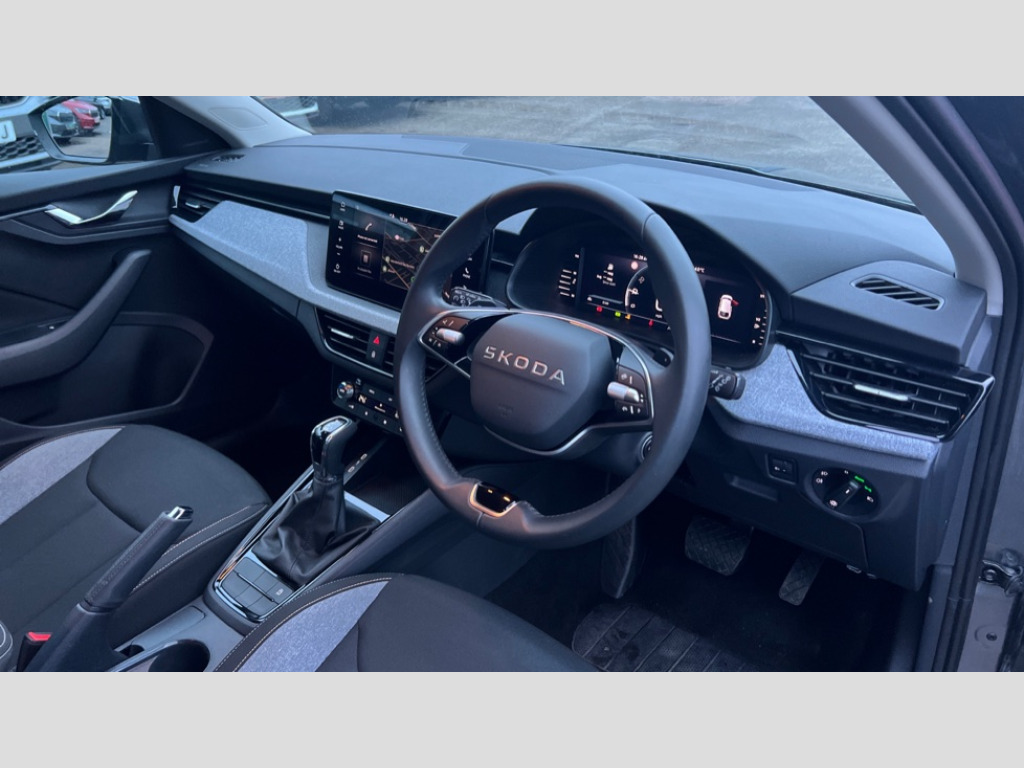 Skoda Scala 1.0 TSI 116 SE Edition 5dr DSG Advanced driver attention and drowsiness monitor, Bluetooth, e-Call (emergency call), Front assist system, PAS, Rear parking sensors, Rear view camera, Speed limiter, Tailgate, Traffic sign recognition, Virtual Cockpit - 10.25" digital display, Voice control system, Wireless smartlink, 4 USB C ports, 8 Speakers, 9.2" Skoda navigation display, DAB radio, Auto dimming rear view mirror, Automatic headlamp activation with Coming home and Leaving home feature, Automatic high/low beam, Body colour bumpers, Body colour door mirrors and handles, Chrome moulding around grille, Front and rear electric windows, Full LED headlights, Heated rear window, LED 3rd brake light, LED brake lights, LED daytime running lights, LED front turning lights, LED high beam, LED low beam, LED taillights, Rear LED fog light, Rear side wing doors, Rear wiper, Tinted windows, Unique dark chrome design logo on alloy wheels, 12V socket in luggage compartment, 3 seat bench in 2nd row, Black / Grey armrest stitching, Black hotstamping, Cargo elements, Chrome inner door handles, Door inserts in satin black, Driver and passenger sun visors with vanity mirror, Dual zone climate control, Front and rear roof lights, Front centre armrest, Front head restraints, Glasses storage in roof liner, Height adjustable driver seat, Height adjustable passenger seat, Ice scraper, Illuminated glove compartment, Inner circulation control with pollen filter, ISOFIX for front passenger seat, Isofix preparation for back seats, Leather gearknob and handbrake lever, Loft cloth upholstery, Luggage net under rear parcel shelf, Manual lumbar support for front seats, Net package and top tether hooks in boot space, Pearl grey ceiling, Pocket on the back of both front seats, incl. mobile phone pockets, Single front passenger seat, Skoda lettering on steering wheel, Textile floor mats, Third rear headrest, Ticket holder, Top tether for front passenger seat, Umbrella in driver's door, 3x3 point rear seatbelts, ABS, Child locks, Curtain airbags and front side airbags, Disc brakes, Driver and front passenger airbags, ESP, Hill hold control, Manual leather parking brake, One tone horn, Passenger airbag switch off function, Seatbelt reminder for driver and front passenger, Tyre pressure monitoring system, Anti theft alarm system with interior monitoring, backup horn and towing protection, Anti-theft wheel bolts, Remote central locking with 2 remote folding keys, SAFE function for remote central locking, Decord pad, door inserts Kota uni