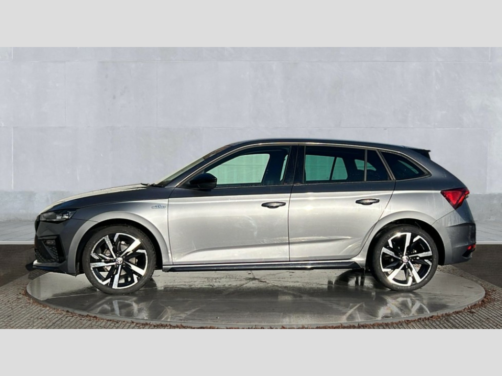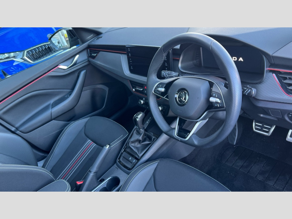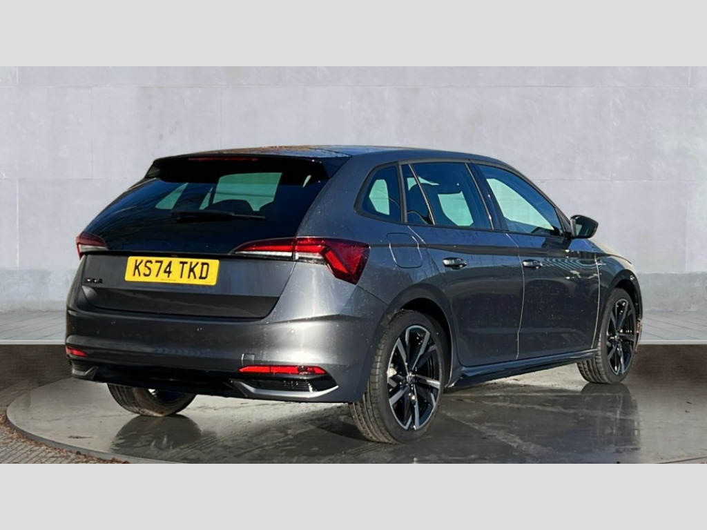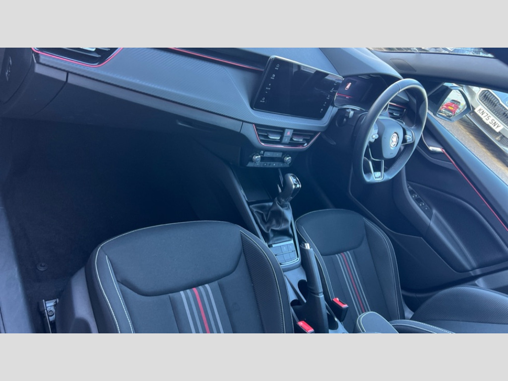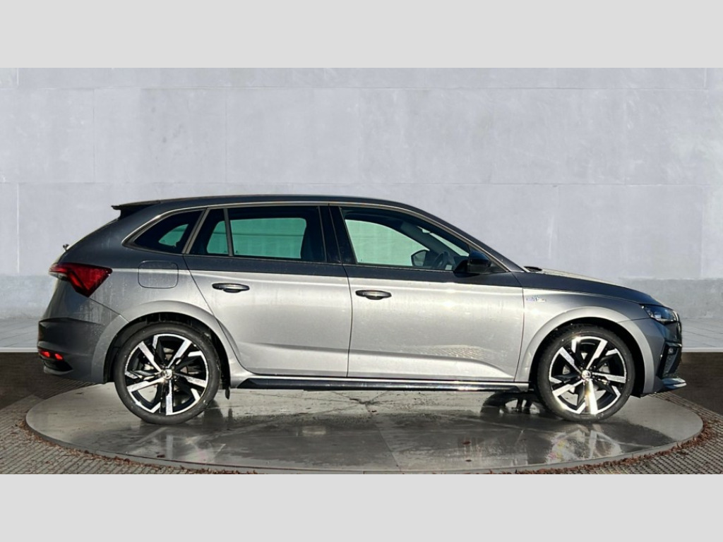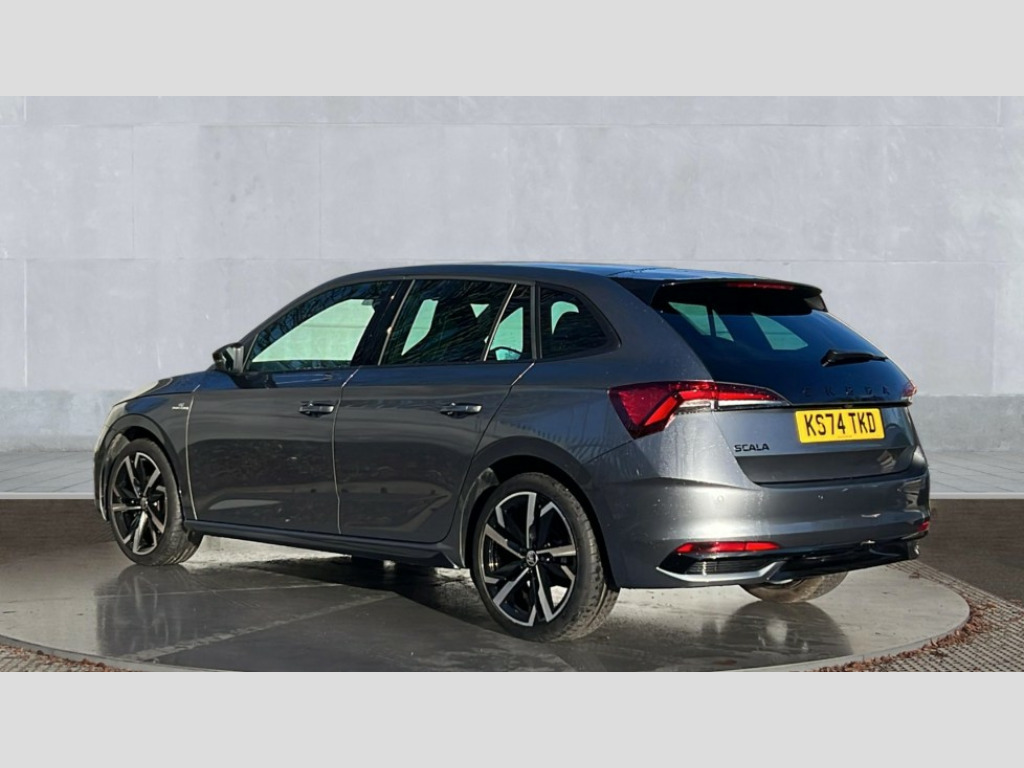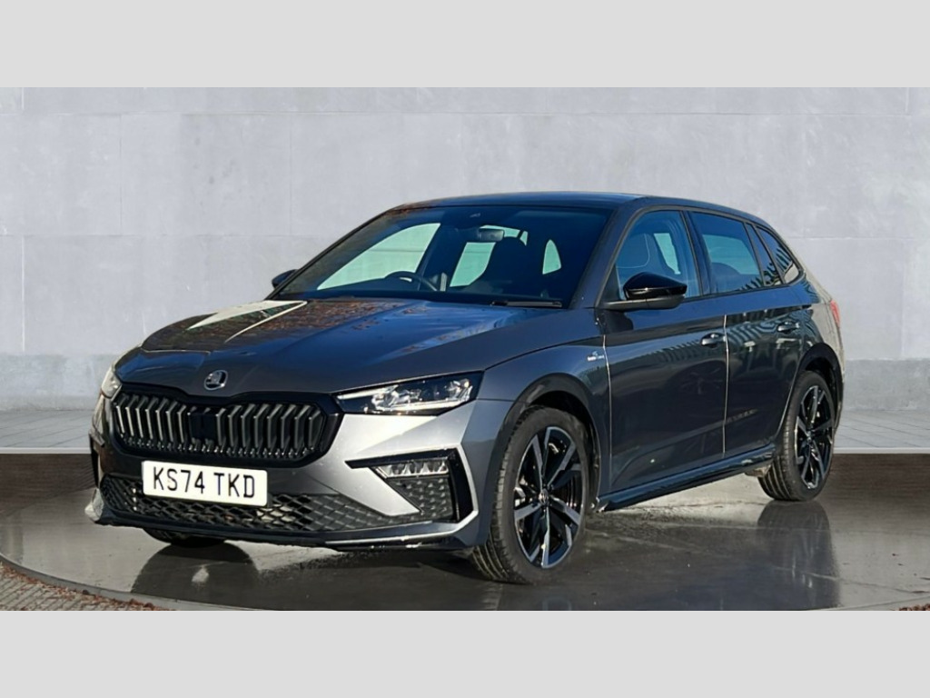 Skoda Scala 1.5 TSI Monte Carlo 5dr DSG Advanced driver attention and drowsiness monitor, Bluetooth, e-Call (emergency call), Front assist system, PAS, Rear parking sensors, Speed limiter, Tailgate, Traffic sign recognition, Virtual Cockpit - 10.25" digital display, Voice control system, Wireless smartlink, 4 USB C ports, 8 Speakers, 9.2" Skoda navigation display, DAB radio, Auto dimming rear view mirror, Automatic headlamp activation with Coming home and Leaving home feature, Automatic high/low beam, Automatic intermittent wipers, Black door mirrors, Black lettering on boot lid, Black radiator grille, Black rear diffuser, Black roof spoiler, Body colour bumpers, Body colour door handles, Chrome moulding around grille, Extended tailgate glass, Front and rear electric windows, Heated rear window, LED 3rd brake light, LED brake lights, LED daytime running lights, LED high beam, LED low beam, Light sensors, Monte carlo plaque, Panoramic glass roof, Privacy glass, Rear LED fog light, Rear side wing doors, Rear wiper, Tinted windows, 12V socket in luggage compartment, 3 seat bench in 2nd row, Aluminium pedals, Ambient lighting in white/red, Black / White armrest stitching, Black ceiling, Black roof headlining, Cargo elements, Chrome inner door handles, Door inserts in art.leather carbon, Driver and passenger sun visors with vanity mirror, Dual zone climate control, Front and rear roof lights, Front centre armrest, Front head restraints, Height adjustable driver seat, Height adjustable passenger seat, Ice scraper, Illuminated glove compartment, Inner circulation control with pollen filter, ISOFIX for front passenger seat, Isofix preparation for back seats, Leather gearknob and handbrake lever, Luggage net under rear parcel shelf, Manual lumbar support for front seats, Monte carlo cloth upholstery, Net package and top tether hooks in boot space, Pocket on the back of both front seats, incl. mobile phone pockets, Rear centre armrest, Red hotstamping, Single front passenger seat, Sport seats, Textile floor mats, Third rear headrest, Ticket holder, Top tether for front passenger seat, Umbrella in driver's door, Light and view plus pack - Scala, 3x3 point rear seatbelts, ABS, Child locks, Curtain airbags and front side airbags, Disc brakes, Driver and front passenger airbags, ESP, Hill hold control, Manual leather parking brake, One tone horn, Passenger airbag switch off function, Seatbelt reminder for driver and front passenger, Tyre pressure monitoring system, Anti theft alarm system with interior monitoring, backup horn and towing protection, Anti-theft wheel bolts, Remote central locking with 2 remote folding keys, SAFE function for remote central locking, Carbon effect decorative inserts, 18" Ursa black diamond cut alloy wheels