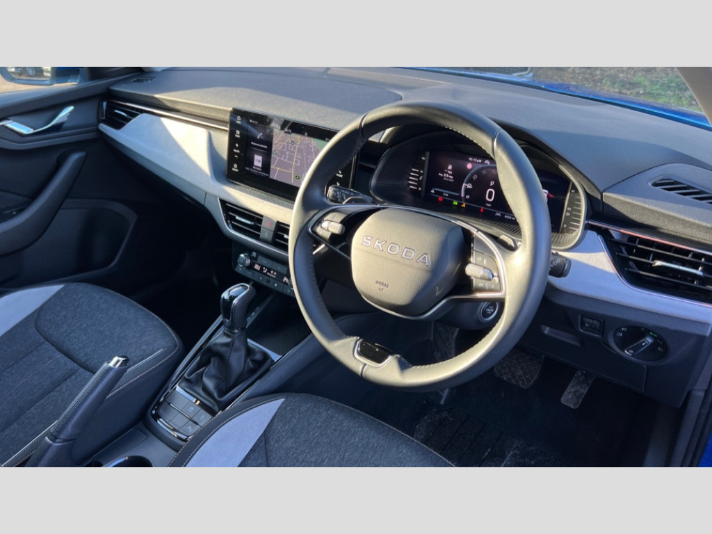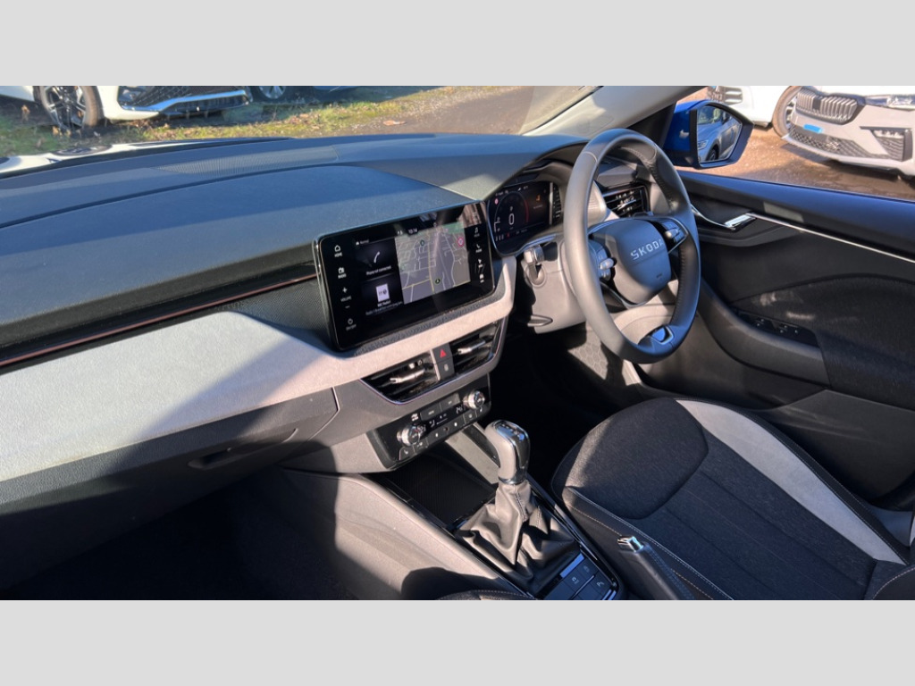 Skoda Scala 1.5 TSI SE L Edition 5dr DSG Advanced driver attention and drowsiness monitor, Bluetooth, e-Call (emergency call), Front assist system, PAS, Rear parking sensors, Rear view camera, Speed limiter, Tailgate, Traffic sign recognition, Virtual Cockpit - 10.25" digital display, Voice control system, Wireless smartlink, 4 USB C ports, 8 Speakers, 9.2" Skoda navigation display, DAB radio, Auto dimming rear view mirror, Automatic headlamp activation with Coming home and Leaving home feature, Automatic high/low beam, Automatic intermittent wipers, Body colour bumpers, Body colour door mirrors and handles, Chrome moulding around grille, Chrome window frames, Front and rear electric windows, Heated rear window, LED 3rd brake light, LED brake lights, LED daytime running lights, LED front turning lights, LED high beam, LED low beam, Light sensors, Privacy glass, Rear LED fog light, Rear side wing doors, Rear wiper, Tinted windows, Unique dark chrome design logo on alloy wheels, 12V socket in luggage compartment, 3 seat bench in 2nd row, Ambient lighting in white/red, Black / Copper armrest stitching, Cargo elements, Chrome inner door handles, Copper hotstamping, Door inserts in accent black, Driver and passenger sun visors with vanity mirror, Dual zone climate control, Front and rear roof lights, Front centre armrest, Front head restraints, Glasses storage in roof liner, Height adjustable driver seat, Height adjustable passenger seat, Ice scraper, Illuminated glove compartment, Inner circulation control with pollen filter, ISOFIX for front passenger seat, Isofix preparation for back seats, Leather gearknob and handbrake lever, Lodge cloth upholstery, Luggage net under rear parcel shelf, Manual lumbar support for front seats, Net package and top tether hooks in boot space, Pearl grey ceiling, Pocket on the back of both front seats, incl. mobile phone pockets, Rear centre armrest, Single front passenger seat, Skoda lettering on steering wheel, Textile floor mats, Third rear headrest, Ticket holder, Top tether for front passenger seat, Umbrella in driver's door, Convenience pack without rear camera - Scala, 3x3 point rear seatbelts, ABS, Child locks, Curtain airbags and front side airbags, Disc brakes, Driver and front passenger airbags, ESP, Hill hold control, Manual leather parking brake, One tone horn, Passenger airbag switch off function, Seatbelt reminder for driver and front passenger, Tyre pressure monitoring system, Anti theft alarm system with interior monitoring, backup horn and towing protection, Anti-theft wheel bolts, Remote central locking with 2 remote folding keys, SAFE function for remote central locking, Decorative inserts