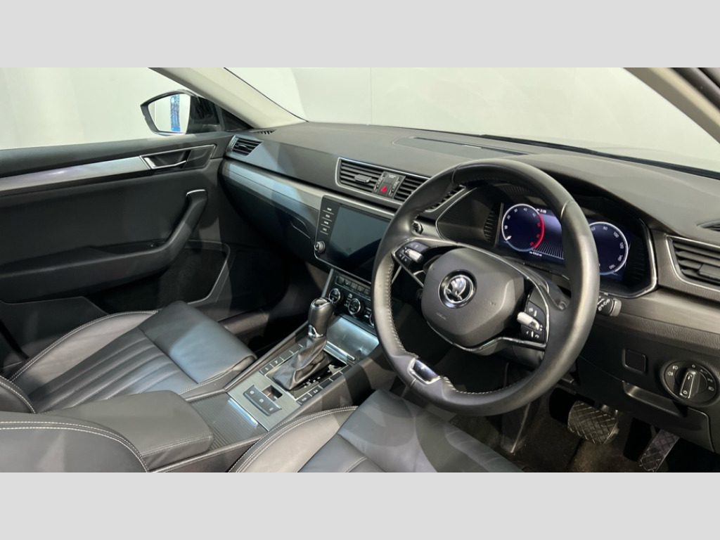 Skoda Superb 2.0 TDI CR SE L 5dr DSG Bluetooth system, CareConnect and Emergency Call, Driver fatigue sensor, eCall emergency system, Electromechanical power steering, Front assist with pedestrian protection, Stop/start engine system and energy recovery, Virtual cockpit, Voice control system, Wireless smartlink apple carplay, SmartLink+ android auto, XDS+, 2 USB ports, Bolero radio with 8" touchscreen display, DAB Digital radio, 3rd brake light, Aero front windscreen wipers with intermittent function, Auto dimming rear view mirror, Body colour door mirrors and handles, Chrome grille surround with chorme rib elements, Chrome strip between rear lights, Chrome window surround, Cornering front fog lights, Electrically adjustable heated and folding door mirrors with memory function, Front and rear electric windows, Light assistant (coming/leaving home/tunnel light), Privacy glass, Rain sensor, Rear side wing doors, Rear windscreen wiper, Silver roof rails, 12v power point in centre console, 3 seat bench in 2nd row, Black textile floor mats, Electric auxiliary air heater, Front and rear footwell illumination, Front armrest with storage box, Height adjustable front and rear head restraints, Ice scraper, Illuminated and cooled glovebox, Interior lights with control switches, Isofix child seat fittings on outer rear seats, LED front and rear reading lights, One umbrella compartments in driver door with one umbrella in drivers door, Overhead glasses storage compartment, Rear centre armrest with cupholders, Single front passenger seat, Split folding rear seats, Storage compartment with cover in luggage compartment side panels, Sun visors, Ticket holder on A Pillar, 3 rear seatbelts, 7 airbags - Front, front side, curtain, driver's knee airbag with front passenger deactivation switch, Driver and passenger seatbelts with warning light, Electronic parking brake, ESC including ABS, EBV, MSR, ASR, EDS, HBA, DSR, RBS, CBC, multi-collision brake (MKB) and Auto hold, Hill start assist, Power operated child lock in rear doors, Tyre pressure monitor, Alarm with interior monitoring tilt sensor and back up horn, Electronic engine immobiliser, Keyless entry and start/stop, Remote central locking with SAFE system, Third remote key, Dark brushed aluminium decorative inserts