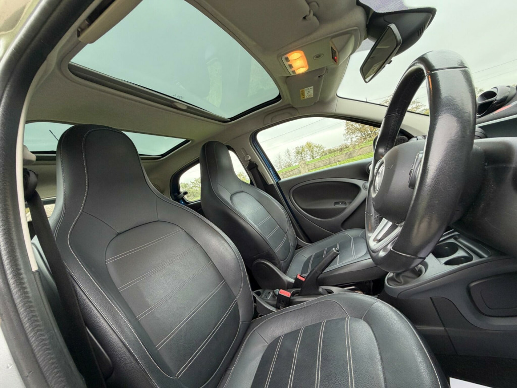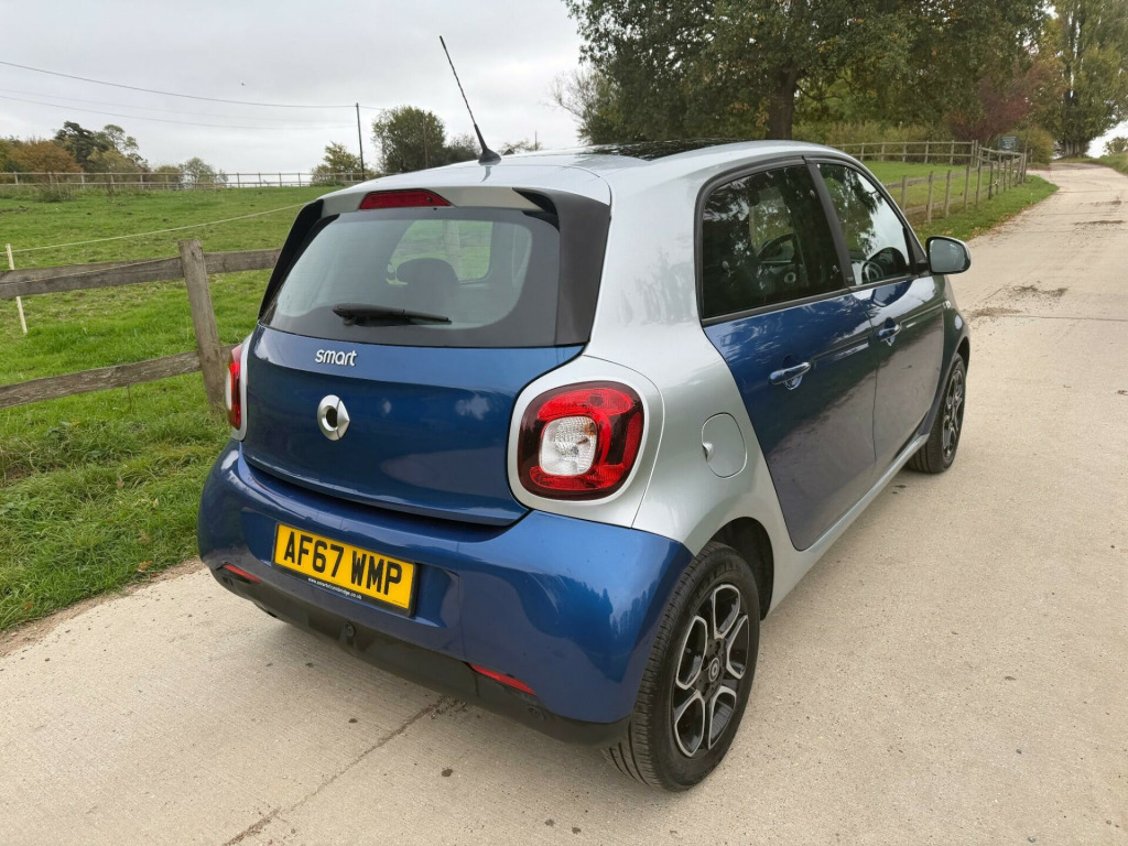 This 2017 Smart forfour Prime is presented with a clear vehicle history check, offering peace of mind for its next owner. This stylish city car boasts a 1.0 litre petrol engine, meeting Euro 6 emissions standards. The Prime trim level includes a Premium Equipment Line, featuring rear parking assistance sensors and Bluetooth connectivity. Comfort is further enhanced by heated seats for both the driver and front passenger, and a panoramic roof with sun protection. The Cool and Audio Package adds automatic climate control, ensuring a pleasant cabin environment regardless of the weather.This Smart forfour Prime is designed to be economical and efficient. It achieves an impressive fuel economy of 67 miles per gallon, which is a significant advantage over many other vehicles. Its low CO2 emissions also contribute to its environmental credentials. Furthermore, the vehicle falls into a low insurance group, making it an affordable choice for many drivers. These highlights demonstrate how this Smart forfour offers a more cost effective and efficient driving experience. volt socket with cover, 15in alloy wheels - 5-twin-spoke painted in black with a high-sheen finish, 85 degree wide opening rear doors, abs - anti lock braking system, airbag - kneebag for driver, airbags - driver and passenger, airbags - sidebags for driver and front passenger - combined head and thorax, automatic climate control, black front grille, brake assist, breakdown kit with air compressor and sealant, central locking with convenience closing features, central locking with radio remote control - visual locking-verification signal and folding key, centre console with pull-out tray and double cup holder, cool and audio package with automatic climate control, crash sensor for activation of hazard warning lights, crosswind assist, cruise control with speedtronic variable speed limiter, dashboard instruments with cockpit clock and rev counter, dashboard and door centre panel - black fabric, dashboard and door centre panel fabric and highlights in contrast colour, direct-steer system with speed sensitve power assistance and variable steering ratio, door mirror caps in tridion colour, door mirror with aspherically curved mirror glass on driver side, drive lock - automatic door locking when the vehicle is in motion, esp - electronic stability programme, electric windows, gearshift lever - trimmed leather, grab handle for front passenger, headlights - h4 halogen, headrests at the rear x 2, heated seats for driver and front passenger, hill start assist, isofix child seat attachment points on rear seats, instrument cluster with multi functional colour 3.5in display, interior door handle - matt chrome, interior lighting, led daytime running lights, load-lashing eyes in luggage compartment, lockable glove compartment, lockable service bonnet, luggage compartment cover, luggage compartment lighting, onboard computer, outside temperature display, painted door handles, panoramic roof with sun protection, passenger seat backrest foldable down for through loading, pedestrian impact protection front and side, pre-installation for ipad cradle on driver and front passenger seat backrest, premium equipment line, radiator trim - black, readyspace seats at rear with removable cargo box, rear seats - backrest 50:50 split with cargo position, rear spoiler, rear windscreen - heated with timer control, rear windscreen wiper with intermittent wiper and automatic wipe - wash function, seat belt reminder for driver and passenger, seat belts - three-point with seat belt tensioners and belt force limiters, solid roof in tridion colour, steering wheel - 3- spoke multi-function - leather, storage compartment in front doors, sunglasses holder, third rear brake light, tridion safety cell in black solid paint, tyre pressure monitoring system, vanity mirror in sun visors with parking ticket holder for driver and passenger, white side indicators
