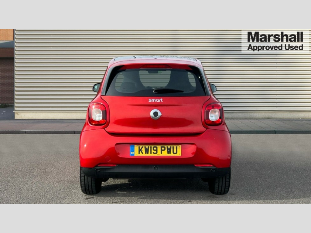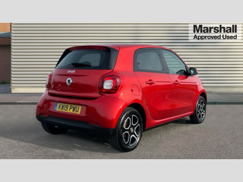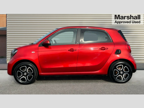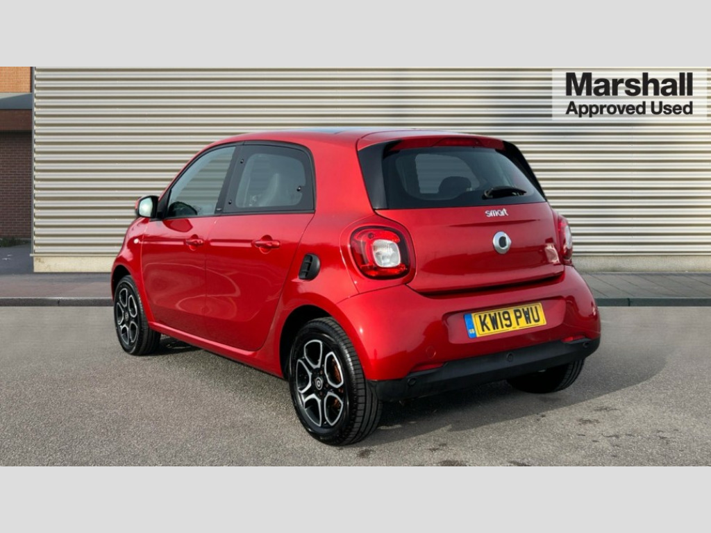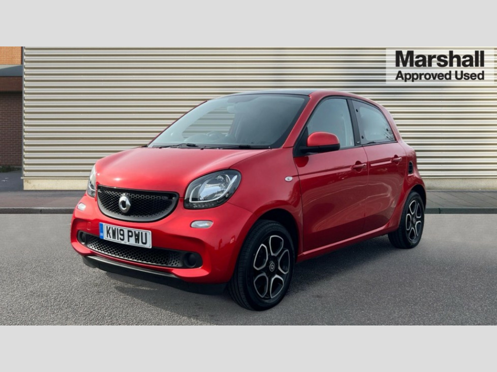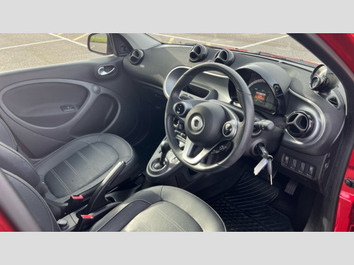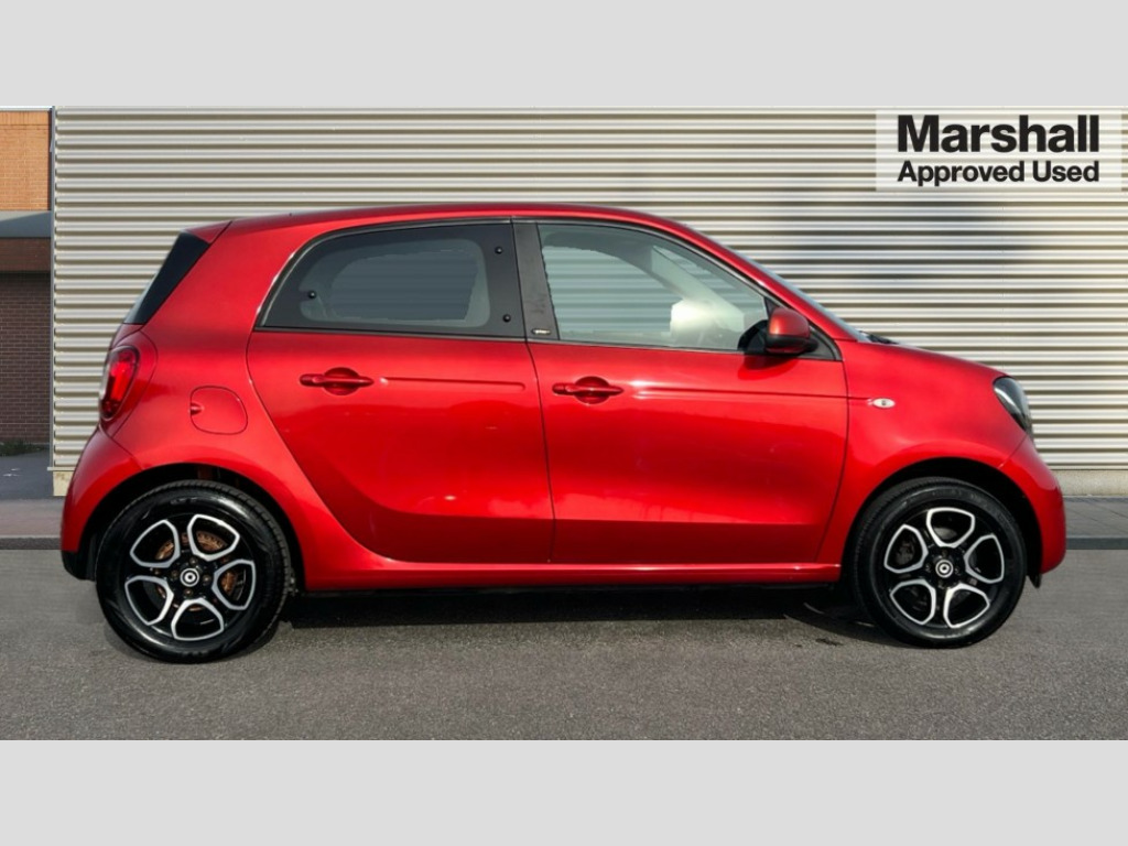 Smart Forfour 0.9 Turbo Prime Premium Plus 5dr Auto Breakdown kit with compressor, Crosswind Assist, Cruise control with speedtronic variable speed limiter, Dashboard instruments with cockpit clock and rev counter, Electric power steering, Instrument cluster with multifunctional 3.5 inch colour display, Mirrorlink compatible smartphone andriod apps on the 7" TFT display, On board computer, Outside temperature display with frost warning, Rear parking sensors, Rear view camera, Service interval indicator, Voice recognition for smartphones, Twinamic 6-speed dual clutch automatic transmission, Smart media system - smartphone, 7" display, FM/AM tuner, AUX/USB, voice control, bluetooth hands free, audio streaming, 3D navigation and 2 speakers, 85 degree opening rear doors, Body colour door handles, Body coloured bumpers, Door mirror with aspherically curved mirror glass on the driver's side, Driving mirrors in tridion colour, Electric windows, Front fog lights with cornering function, Headlamps with LED light guide, LED tail lights, H4 halogen headlamps with welcome function and fibre optic daytime running lamps, Heated glass rear windscreen + timer control, LED daytime running lights, LED tail lights, Lockable service bonnet, Panoramic glass roof with sunblind, Radiator trim in black, Rain and light sensors, Rear windscreen wiper with intermittent wiper control and automatic wipe/wash function, Third brake light, White side indicators, 12V socket with cover, 2 rear head restraints, 3 Spoke leather multi function steering wheel, 50/50 split folding rear seat backrest, Ambient lighting, Automatic climate control, Centre console with pull out tray and double cup holder, Dashboard and door centre panel in black fabric, Driver/passenger sunvisors with ticket holders + vanity mirrors, Drivers/passenger heated seats, Front armrest, Front head restraints, Front passenger grab handle, Handbag holder, Interior door opener in matt chrome, Interior lighting incl. reading light for driver and passenger, Isofix attachments on outer rear seats, Leather trimmed gearshift, Leather upholstery, Load lashing eyes in luggage compartment, Luggage compartment cover, Luggage compartment lighting, Passenger seat with through load function, Ready space seats at rear with removable cargo box, Storage compartment in front doors, Sunglasses holder, Comfort pack - ForFour/ForTwo, Stowage space package - ForFour, Airbags - kneebag for driver, Airbags - sidebags for driver and front passenger (combined head/thorax airbags), Anti-lock braking system (ABS), Crash sensor for activation of hazard warning lights, Driver and passenger airbags, Electronic brake force distribution, Electronic Stability Programme, Hill start assist, Pedestrian impact protection front and side, Seat belts - Three-point, with seat belt tensioners and belt force limiters, Seatbelt reminder for driver and front passenger, Traction control, Tyre pressure monitoring system, Central locking with radio remote control and visual locking verification signal, Drive lock - Doors locked automatically when vehicle is on the move, Folding key, Immobiliser, Remote locking fuel filler flap, 15" 5 twin spoke alloy wheels painted in black with high sheen finish, Tyre repair kit