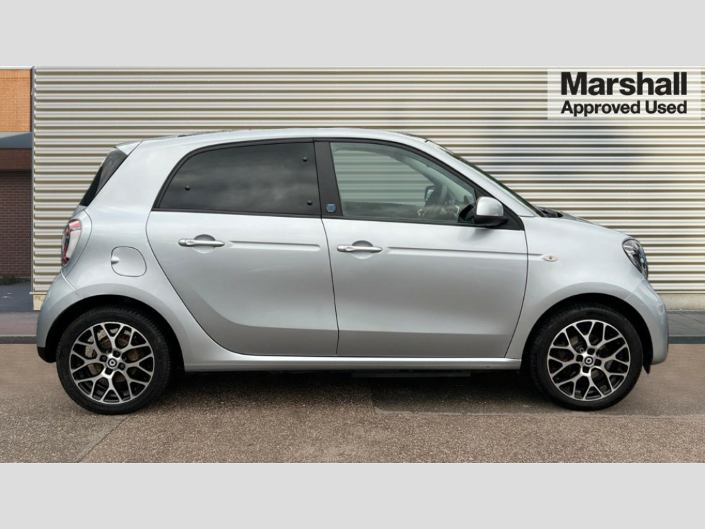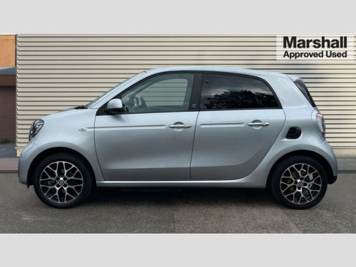 Smart Forfour 60kW EQ Exclusive 17kWh 5dr Auto [22kWch] 22kW onboard charger with rapid charging function, Acoustic presence indicator, Crosswind Assist, Cruise control with speedtronic variable speed limiter, Electric power steering, Exterior temperature indicator with frost warning, Instrument cluster with multifunctional 3.5 inch colour TFT display and on board computer, Instrument display with battery charge status display and power display, Owners manual and service booklet in English, Rear Park assist with acoustic warning and reversing camera, Tailgate, 7 kW onboard charger, Charging cable for household socket, Charging cable for wall box/charging stations, Single speed transmission, smart Media-System - 9" multi touch display, Bluetooth audio streaming/hands-free, Android Auto/Apple Car Play, DAB Radio, AUX/USB interface, Universal pre-installation for smart accessories, 2 x One touch front electric windows, 85 degree opening rear doors, Auto dimming rear view mirror, Body colour door handles, Body colour radiator grille, Body coloured bumpers, Comfort front windscreen wiper with intermittent wiper control and automatic wipe/wash function, Dark tinted heat insulated glass, Door mirror with aspherically curved mirror glass on the driver's side, Driving mirrors in tridion colour, Electrically adjustable and heated door mirrors, Front fog lamps with cornering function, Full LED headlamp with main and dipped beam plus integral indicator/daytime running lights, Heated rear window, Lockable service cover, Manual headlamp range adjustment, Manually operated rear side windows, Panoramic glass roof with sunblind, Rain and light sensors, Rear window wiper with intermittent wiper control and automatic wipe/wash function, Roof antenna, Third brake light featuring LED technology, White side indicators, 12V socket with cover in centre console, 2 rear head restraints, 3 spoke leather multifunction steering wheel with anthracite bezel and grey double stitching, Ambient lighting with indirect illumination of the front doors, foot wells and centre console, Automatic climate control, Backrest adjustment with one-touch function for driver and front passenger, Black leather gearshift knob, Boot lighting, Centre console with roller cover and folding front centre armrest, Charge cable bag, Dashboard and door centre panel in black fabric and accent trim in black, Driver/front passenger reading lights, Driver/front passenger sunvisors with ticket holder, Driver/front passenger sunvisors with vanity mirror, Front head restraints, Front passenger seat with through loading function with fully folding backrest, Grey headlining, Height adjustable driver's seat, Height adjustable steering column, I-size child seat attachment system for front passenger with manual airbag deactivation, Interior door opener in matt chrome, Leather upholstery with grey double stitching, Load lashing eyes in luggage compartment, Lockable glove compartment, Luggage compartment lighting, Ready space seat-Swivell cushion,removable cargo box,2 cupholder/retractable stowage comp,rear backrest folded 50/50,cargo position 12degree, Ruffled pockets on front seat backrests, Storage compartment in doors with net, Storage compartment in rear doors, Stowage net on centre console, Velour floor mats, Winter pack with heated rear seats - ForFour, Active brake assist forward collision warning system with autonomous braking function, Airbags - driver and front passenger with manual deactivation on the front passenger, Airbags - kneebag for driver, Airbags - windowbags front driver and front passenger, Anti-lock braking system (ABS), Crash sensor for activation of hazard warning lights, Electronic Stability Programme, Height adjustable seatbelts for driver and front passenger, Hill start assist, Rear belt status indicator in overhead control panel, Retaining strap for securing items on the front passenger seat, Seat belts - Three-point, with seat belt tensioners and belt force limiters, Side airbags for driver and front passenger, Tyre pressure monitoring system, Central locking with radio remote control + visual locking verification signal and immobiliser, Drive lock - automatic door locking when driving, Folding key with remote control (Second key with fixed bit), 16" 8 Y spoke alloy wheels painted in black with high sheen finish, Breakdown kit with air compressor and sealant back, Summer tyres