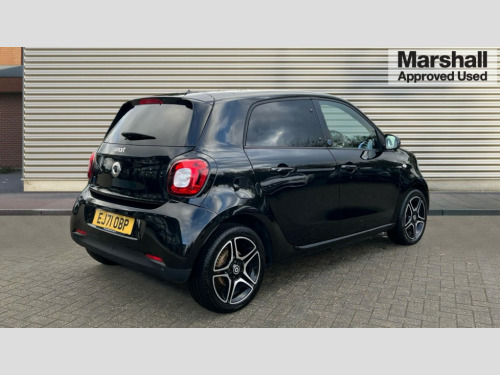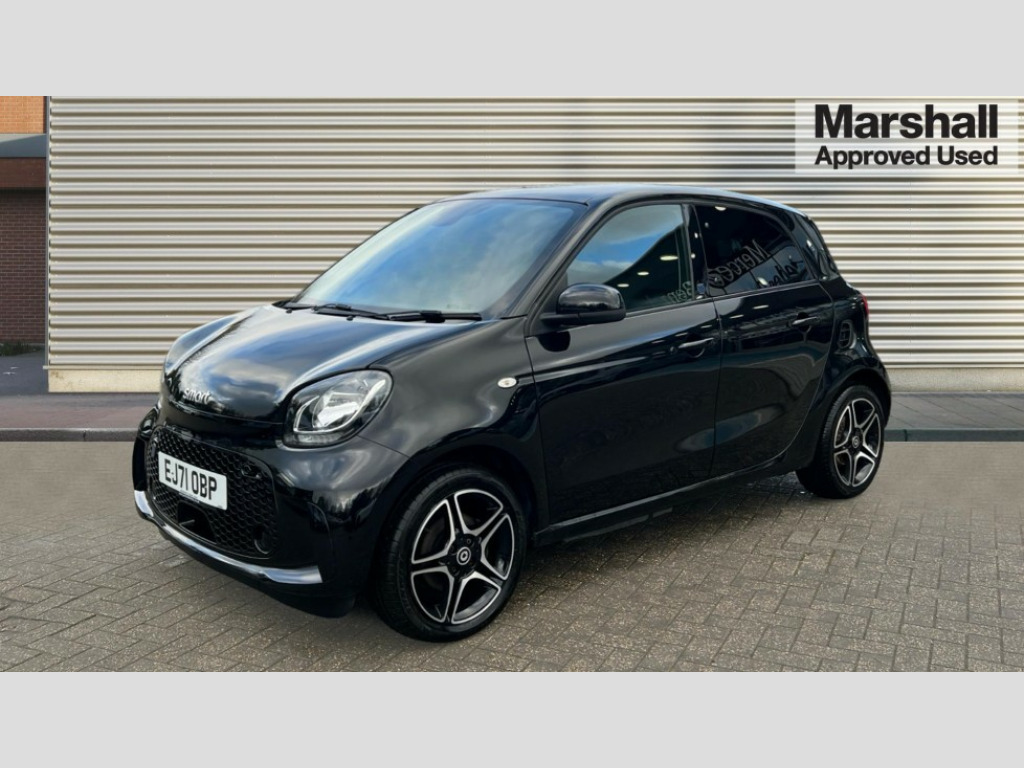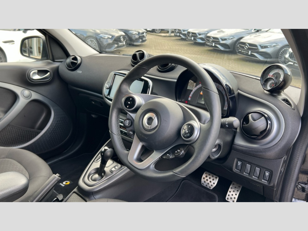 Smart Forfour 60kW EQ Premium 17kWh 5dr Auto [22kWch] 22kW onboard charger with rapid charging function, Acoustic presence indicator, Crosswind Assist, Cruise control with speedtronic variable speed limiter, Electric power steering, Exterior temperature indicator with frost warning, Instrument cluster with multifunctional 3.5 inch colour TFT display and on board computer, Instrument display with battery charge status display and power display, Owners manual and service booklet in English, Rear Park assist with acoustic warning and reversing camera, Tailgate, 7 kW onboard charger, Charging cable for household socket, Charging cable for wall box/charging stations, Single speed transmission, smart Media-System - 9" multi touch display, Bluetooth audio streaming/hands-free, Android Auto/Apple Car Play, DAB Radio, AUX/USB interface, 2 x One touch front electric windows, 85 degree opening rear doors, Body colour door handles, Body colour radiator grille, Body coloured bumpers, Comfort front windscreen wiper with intermittent wiper control and automatic wipe/wash function, Dark tinted heat insulated glass, Door mirror with aspherically curved mirror glass on the driver's side, Driving mirrors in tridion colour, Electrically adjustable and heated door mirrors, H4 halogen headlamps with integrated LED daytime driving lights, Heated rear window, Lockable service cover, Manual headlamp range adjustment, Manually operated rear side windows, Panoramic glass roof with sunblind, Rear window wiper with intermittent wiper control and automatic wipe/wash function, Roof antenna, Third brake light featuring LED technology, White side indicators, 12V socket with cover in centre console, 2 rear head restraints, 3 spoke leather multifunction sports steering wheel with anthracite bezel and grey double stitching, Automatic climate control, Backrest adjustment with one-touch function for driver and front passenger, Black leather gearshift knob, Boot lighting, Brushed stainless steel sports pedals with rubber studs, Centre console with roller cover and folding front centre armrest, Charge cable bag, Dashboard and door centre panel in black fabric and accent trim in black/grey, Driver/front passenger reading lights, Driver/front passenger sunvisors with ticket holder, Driver/front passenger sunvisors with vanity mirror, Fabric upholstery with white double stitching, Front head restraints, Front passenger seat with through loading function with fully folding backrest, Grey headlining, Height adjustable driver's seat, Height adjustable steering column, I-size child seat attachment system for front passenger with manual airbag deactivation, Interior door opener in matt chrome, Load lashing eyes in luggage compartment, Lockable glove compartment, Luggage compartment lighting, Ready space seat-Swivell cushion,removable cargo box,2 cupholder/retractable stowage comp,rear backrest folded 50/50,cargo position 12degree, Ruffled pockets on front seat backrests, Storage compartment in doors with net, Storage compartment in rear doors, Stowage net on centre console, Winter pack with heated rear seats - ForFour, Active brake assist forward collision warning system with autonomous braking function, Airbags - driver and front passenger with manual deactivation on the front passenger, Airbags - kneebag for driver, Airbags - windowbags front driver and front passenger, Anti-lock braking system (ABS), Crash sensor for activation of hazard warning lights, Electronic Stability Programme, Height adjustable seatbelts for driver and front passenger, Hill start assist, Rear belt status indicator in overhead control panel, Retaining strap for securing items on the front passenger seat, Seat belts - Three-point, with seat belt tensioners and belt force limiters, Side airbags for driver and front passenger, Tyre pressure monitoring system, Central locking with radio remote control + visual locking verification signal and immobiliser, Drive lock - automatic door locking when driving, Folding key with remote control (Second key with fixed bit), 16" 5 twin spoke alloy wheels painted in black with high sheen finish, Breakdown kit with air compressor and sealant back, Summer tyres
