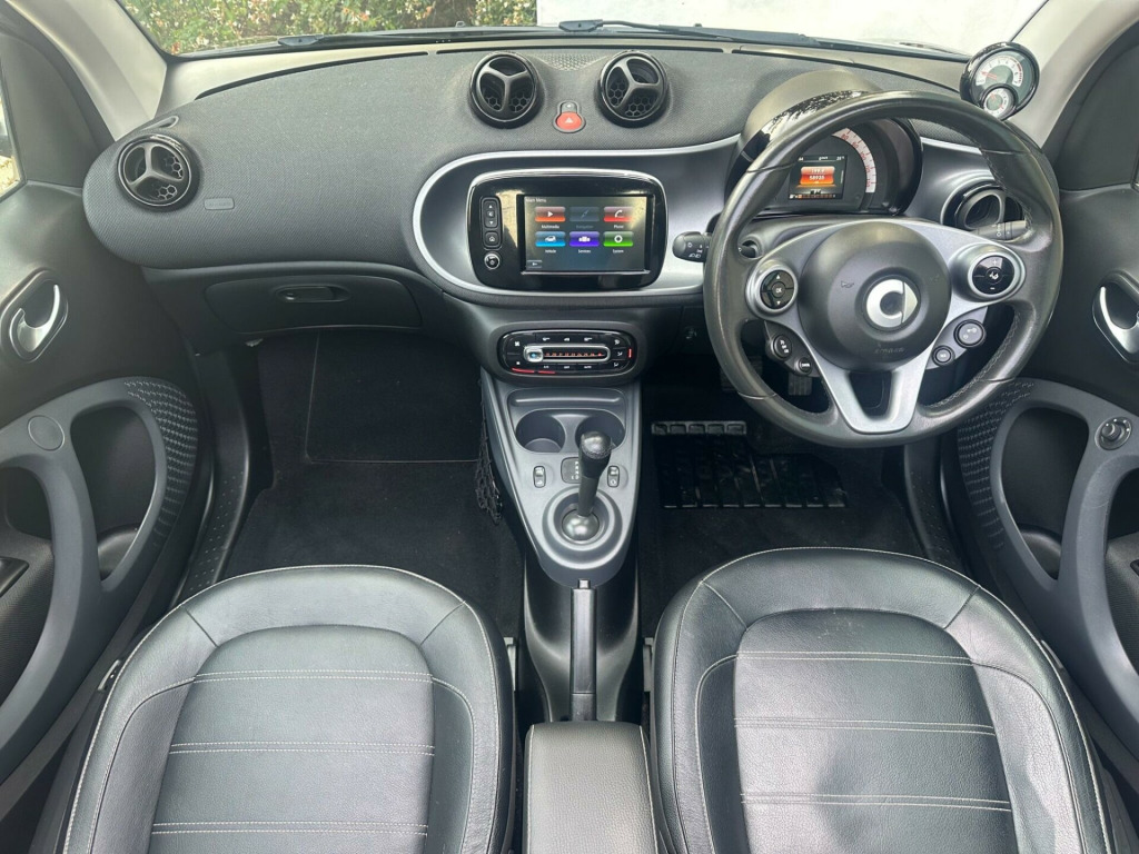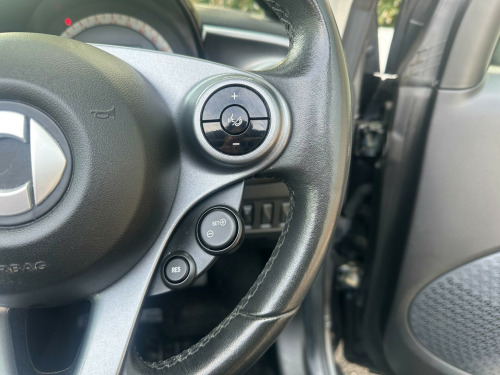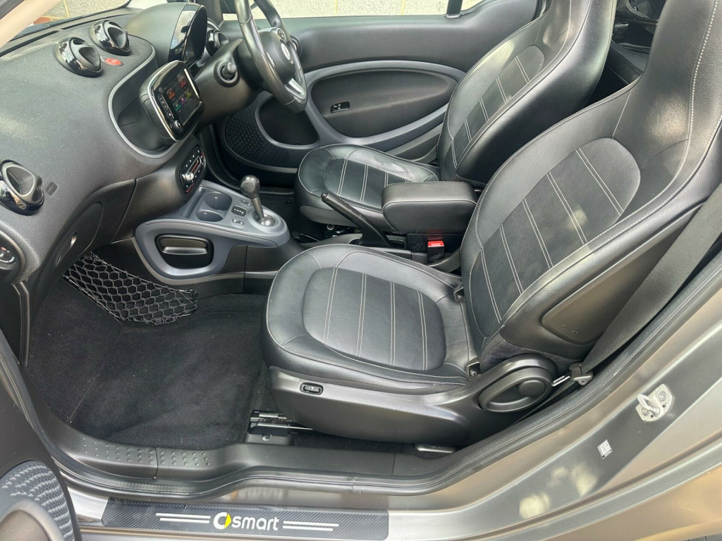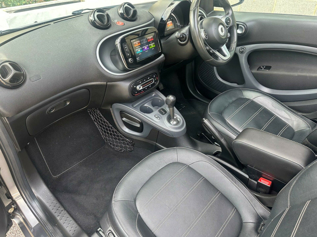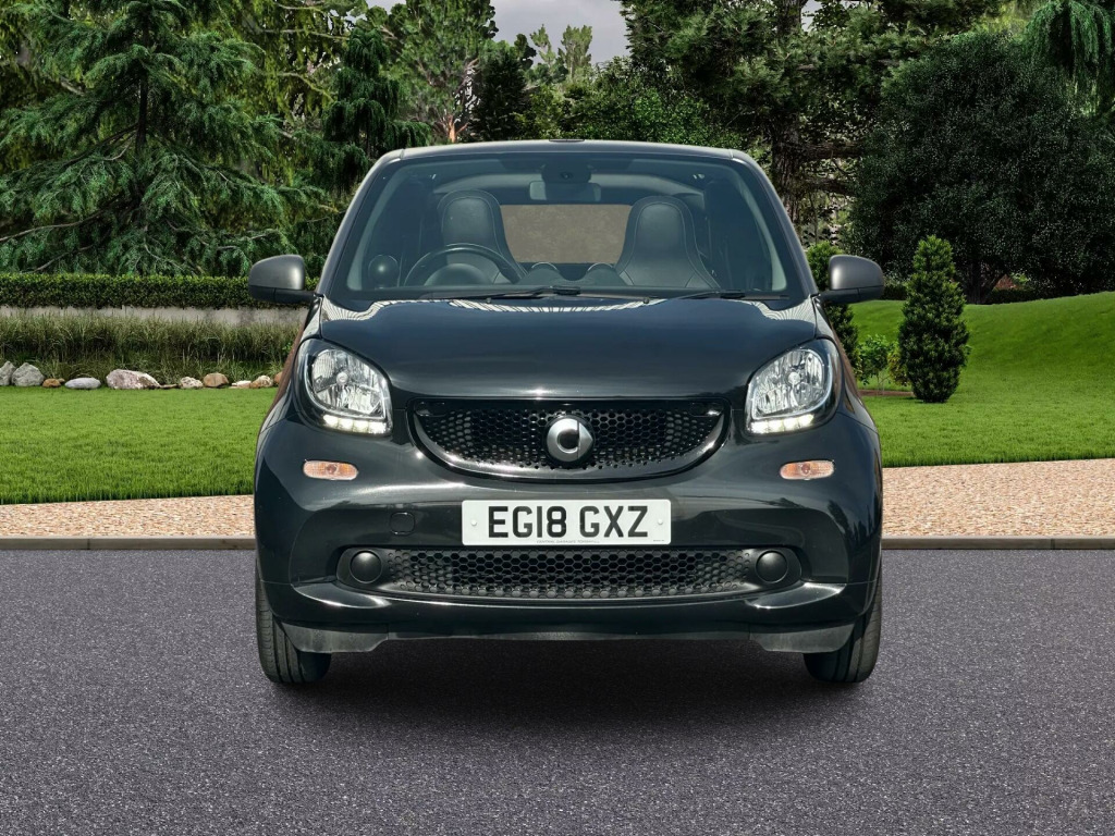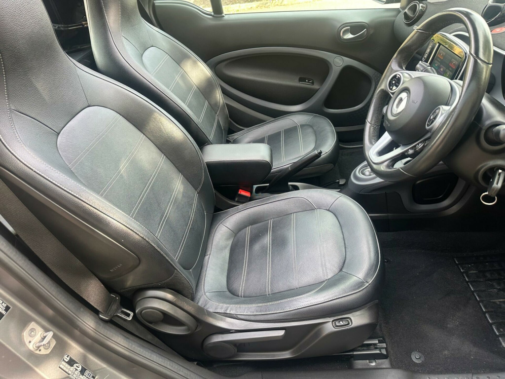 This 2018 Smart Fortwo T Prime is presented with a full 12 months MOT for your peace of mind.  As a Euro 6 compliant vehicle, it features a 0.9L petrol engine and is presented in the Prime trim.  Notable features include the Smart Media System with Bluetooth connectivity, heated seats for both the driver and front passenger, rear parking assistance, and automatic climate control, ensuring a comfortable and convenient driving experience.This Smart Fortwo T Prime offers excellent fuel economy, achieving a highlight of 44 miles per gallon, which indicates it is more economical than many similar vehicles. Furthermore, it boasts a surprisingly large boot space for its class, making it a practical choice for everyday use. Its low CO2 emissions also highlight its efficiency and environmental consideration compared to other cars.  volt socket with cover, 15in alloy wheels - 5-twin-spoke painted in black with a high-sheen finish, abs - anti lock braking system, airbag - kneebag for driver, airbags - driver and passenger, airbags - sidebags for driver and front passenger - combined head and thorax, automatic climate control, black front grille, brake assist, breakdown kit with air compressor and sealant, central locking with convenience closing features and immobiliser, central locking with radio remote control - visual locking-verification signal and folding key, centre console with pull-out tray and double cup holder, comfort package, crash sensor for activation of hazard warning lights, crosswind assist, cruise control with speedtronic variable speed limiter, dashboard instruments with cockpit clock and rev counter, dashboard and door centre panel - black fabric, direct-steer system with speed sensitve power assistance and variable steering ratio, door mirror caps in tridion colour, door mirror with aspherically curved mirror glass on driver side, drive lock - automatic door locking when the vehicle is in motion, esp - electronic stability programme, electric tritop fabric soft top in black with inside roof lining in grey, electric windows, exterior temperature indicator with frost warning, gearshift lever - trimmed in leather, headlights - h4 halogen, heated seats for driver and front passenger, hill start assist, isofix child seat attachment point on passenger seat, inside door opener - matt chrome, instrument cluster with multi functional colour 3.5in display, interior lighting, led daytime running lights, load-lashing eyes in luggage compartment, lockable glove compartment, lockable service bonnet, luggage compartment cover, luggage compartment lighting, map pocket - driver and passager seatbacks, mirrorlink, onboard computer, parking assistance - rear, passenger seat with through - loading function - flat-folding seatback, pedestrian impact protection front and side, radiator trim - black, rear spoiler, rear windscreen - heated with timer control, remote roof release via 3-button key, removable roof bars, seat belt reminder for driver and passenger, seat belts - three-point with seat belt tensioners and belt force limiters, smart media-system, steering wheel - 3- spoke multi-function - leather, storage compartment in front doors, storage compartment in tailgate, stowage space package, tail lights, third rear brake light, tridion safety cell in black solid paint, tyre pressure monitoring system, vanity mirror in sun visors with parking ticket holder for driver and passenger, white side indicators
