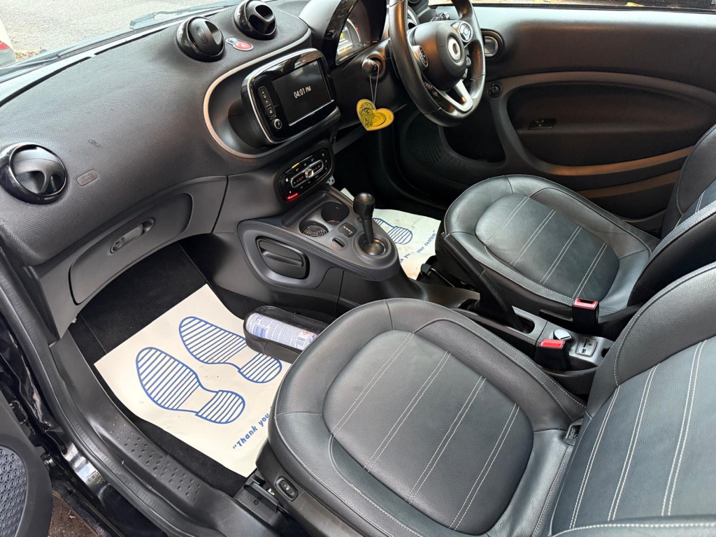 SMART FORTWO EDITION BLACK AUTOMATIC 2017 LR66ADZ PAN ROOF BLACK LEATHER SEATS 16k miles SH EW PAS CL HPI CLEAR DRIVES FAULTLESS EXCELLENT CITY CAR WITH EXCELLENT FUEL ECONOMY AND PRACTICALITY CHEAP TO INSURANCE IDEAL FIRST CAR PRICE IS NEGOTIABLE ALL GENUINE ENQUIRIES ARE WELCOME MAY PX For any more information call 07817751310 volt socket with cover, smart audio-system, 16in alloy wheels - 8-y-spoke painted black, body panels - black, door mirror caps in tridion colour, door mirror with aspherically curved mirror glass on driver side, electric windows, exhaust system with chrome plated tailpipe, painted front grille, panoramic roof with sun protection, radiator trim - black, rear spoiler, rear windscreen - heated with timer control, tridion safety cell in black solid paint, wheel arch extensions with smart lettering, edition badging on tailgate, 3-spoke multi-function sports steering wheel in perforated leather, automatic climate control, breakdown kit, brushed stainless steel sports pedals with rubber studs, central locking with convenience closing features, centre console with pull-out tray, comfort package, dashboard instruments with cockpit clock and rev counter, dashboard and door centre panel - black fabric, dashboard and door centre panel highlights in contrast colour, gearshift lever - trimmed leather, grab handle for front passenger, instrument cluster with multi functional colour 3.5in display, interior door handle - matt chrome, interior lighting, load-lashing eyes in luggage compartment, lockable glove compartment, lockable service bonnet, luggage compartment cover, luggage compartment lighting, map pocket - driver and passager seatbacks, passenger seat backrest foldable down for through loading, premium package, seats - heated front, smartphone cradle, storage compartment in front doors, storage compartment in tailgate, sunglasses holder, vanity mirror in sunvisor, white side indicators, abs - anti lock braking system, airbag - driver and passenger, airbag - kneebag for driver, airbags - sidebags for driver and front passenger - combined head and thorax, brake assist, central locking with radio remote control, crash sensor auto switch-on of hazard warning lights, crosswind assist, drive lock - automatic door locking when the vehicle is in motion, esp - electronic stability programme, hill start assist, isofix child seat attachment point on passenger seat, pedestrian impact protection front and side, seat belt reminder for driver and passenger, seat belts with belt tensioners and belt force limiters, traction control, tridion safety cell, cruise control with speedtronic variable speed limiter, direct-steer system with speed sensitve power assistance and variable steering ratio, exterior temperature indicator with frost warning, lowered sports suspension - 10mm, onboard computer, tyre pressure monitoring system, headlights - h4 halogen, led daytime running lights, third rear brake light