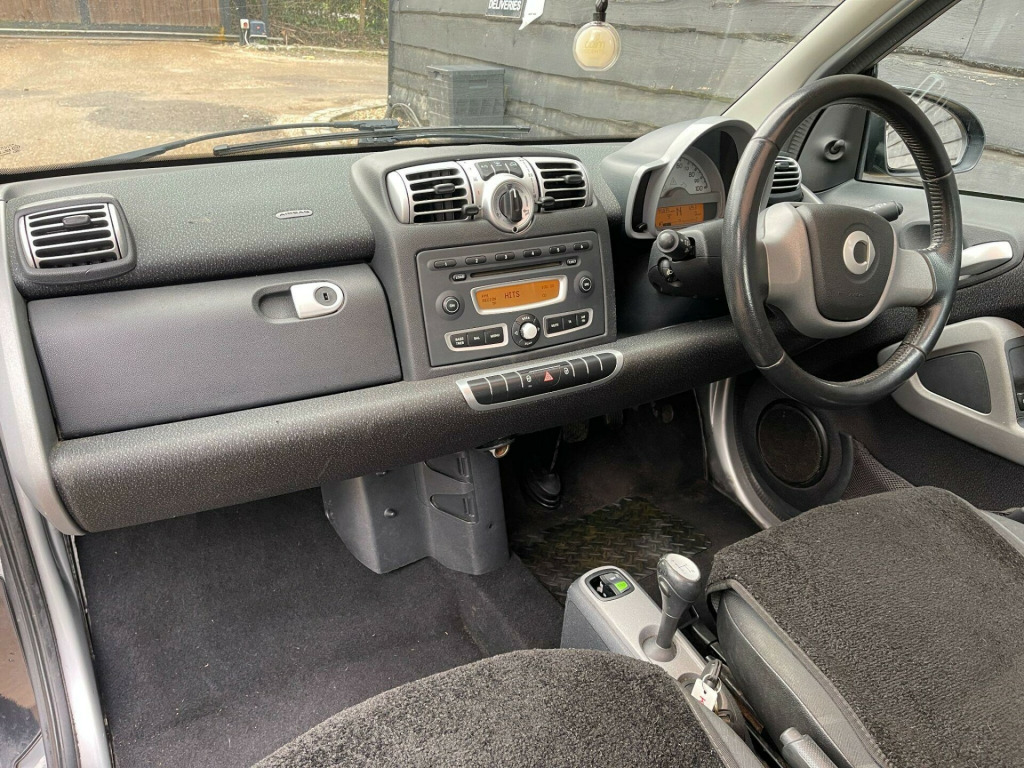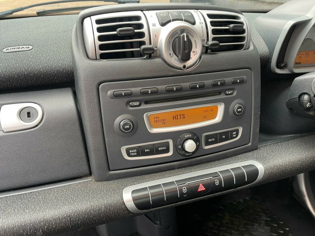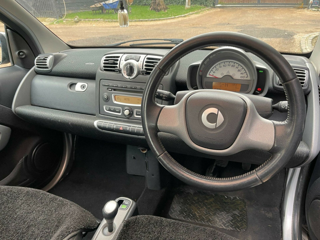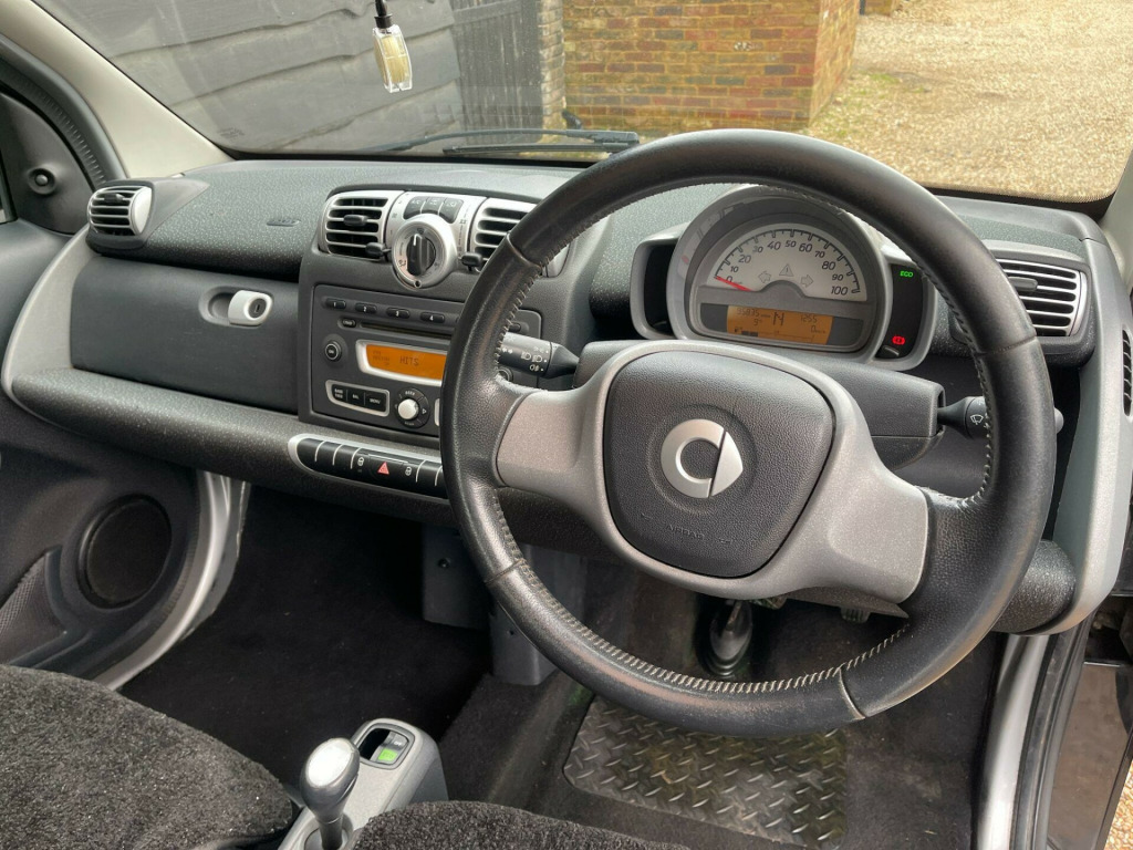 Discover this 2009 Smart Fortwo MHD Passion, a compact car designed for efficient urban driving. This particular model boasts a 1.0 litre petrol engine and comes in the desirable Passion trim. A standout feature is the panoramic glass roof, complete with a sunblind, offering an open and airy feel to the cabin.This Smart Fortwo is an excellent choice for those seeking economy, achieving an impressive 66 miles per gallon. Its low CO2 emissions further highlight its efficiency, making it a more environmentally conscious option compared to many other vehicles in its class. in 12spoke alloy wheels, 2 speakers, 2spoke leather steering wheel, paint- solid- solid roof, panoramic glass roof with sunblind, smart radio nine radio & cd player, tridion safety cell door mirror caps & front grille- black, tridion safety cell door mirror caps & front grille- silver