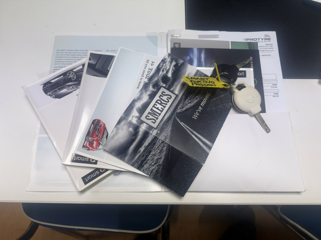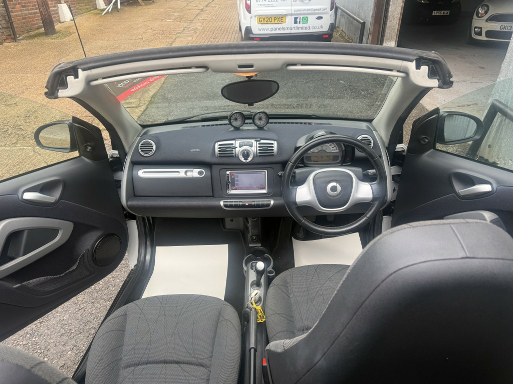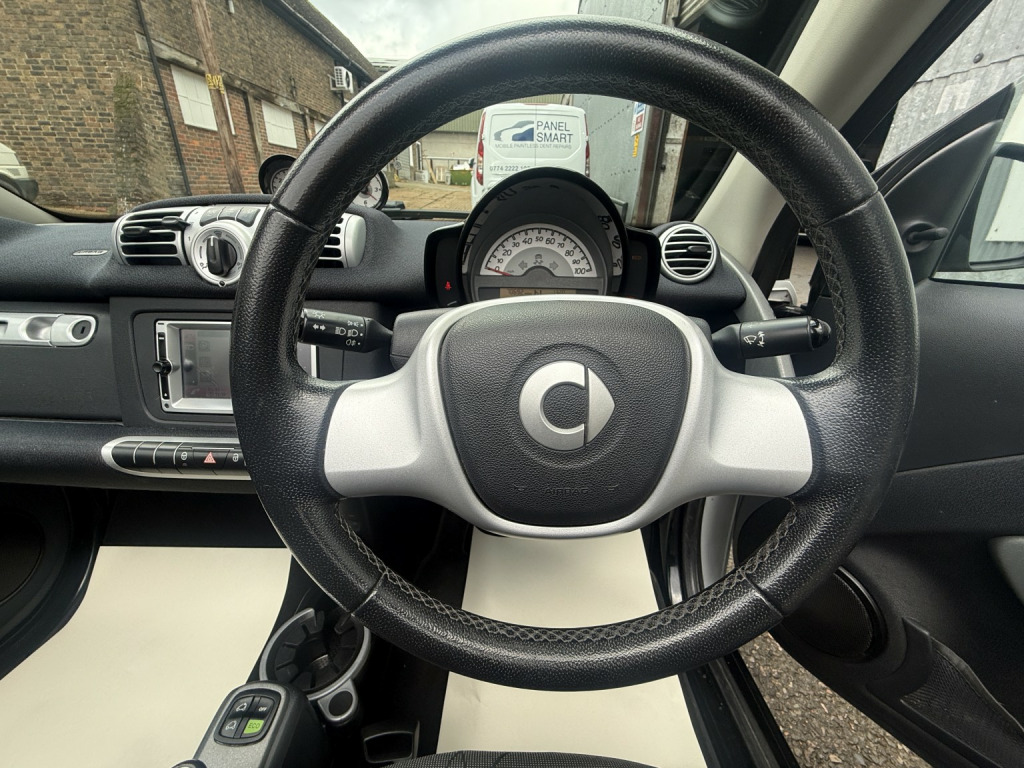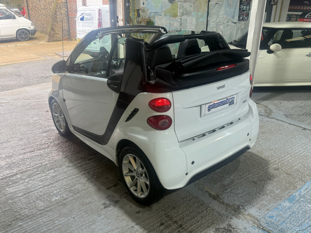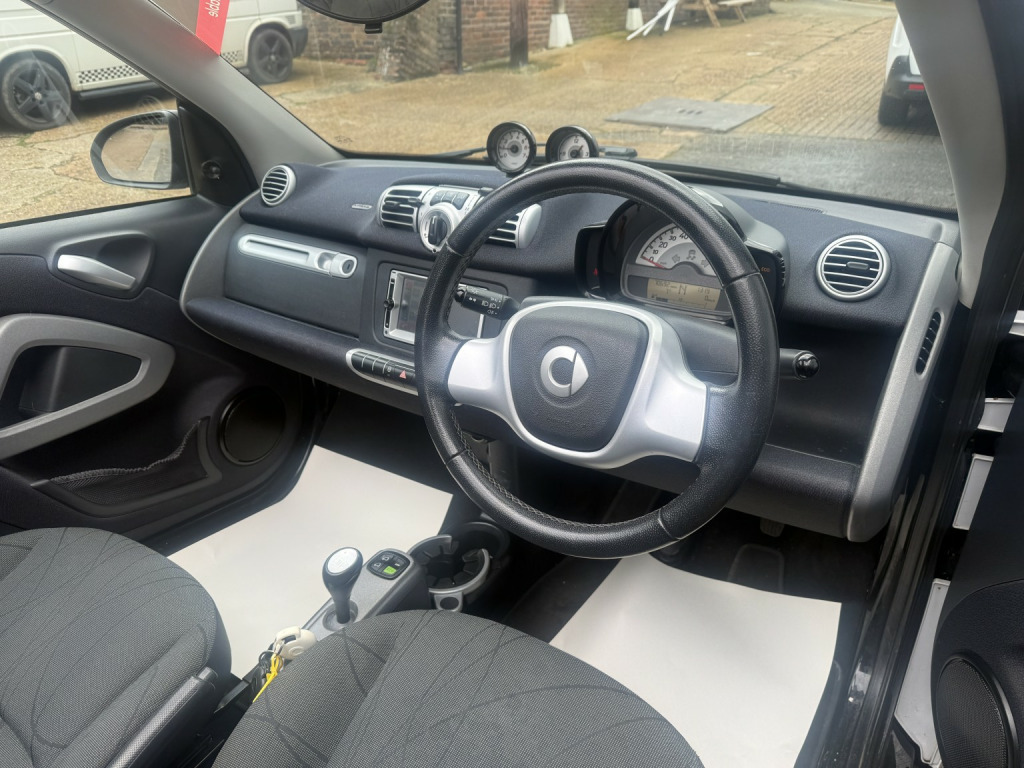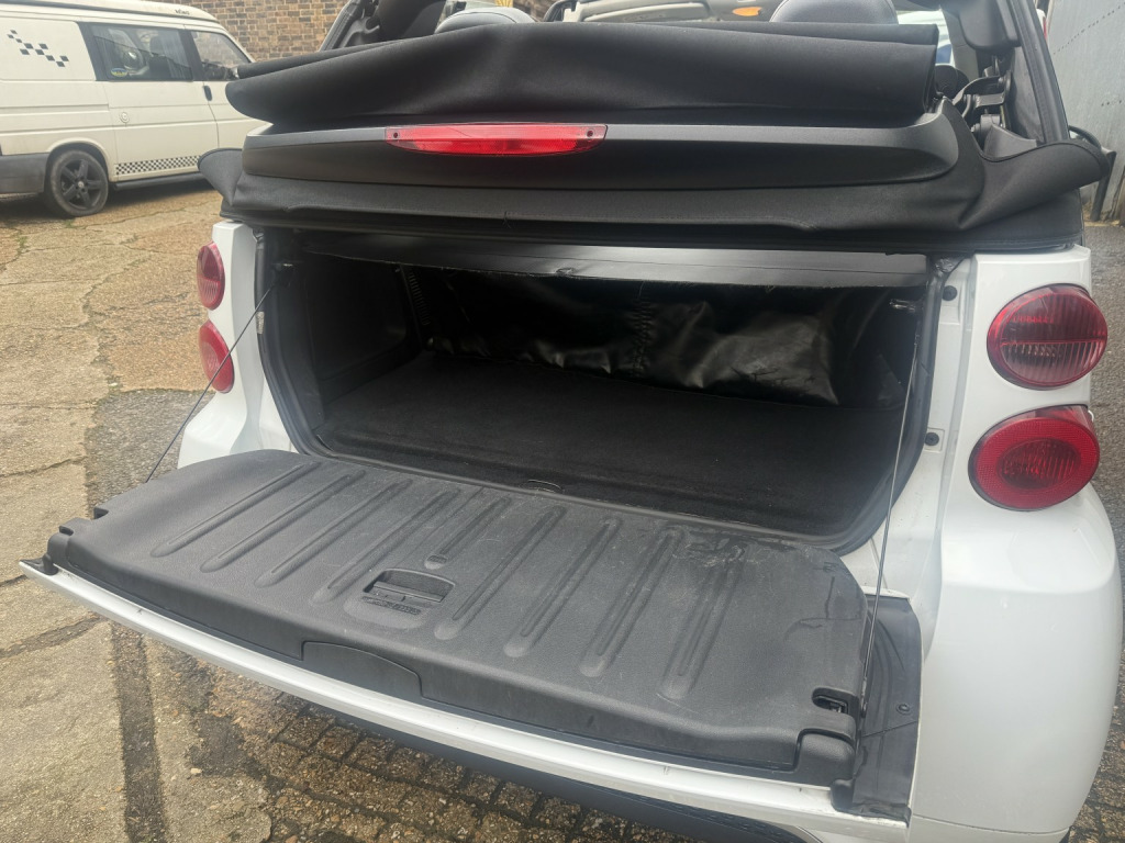 getaround in this ultimate small city car. This automatic Smart Fortwo Passion looks good finished in white with contrasting dark cloth interior and black electric folding canvas roof. It has a good spec that includes electric windows, full screen colour Sat-Nav, remote locking and air-conditioning. It has a comprehensive service history and a long MOT. It comes with the owners book pack, stamped service booklet, service receipts, and two keys. Phone, text or email for am appointment to view this sought after ulez compliant automatic convertible soon.