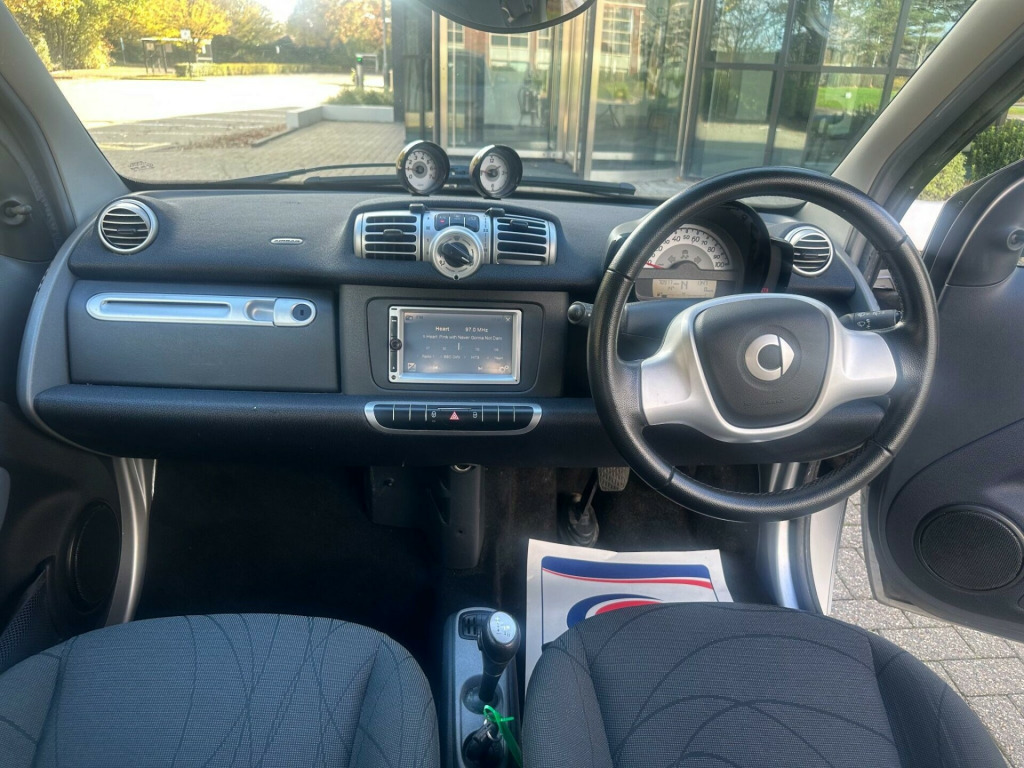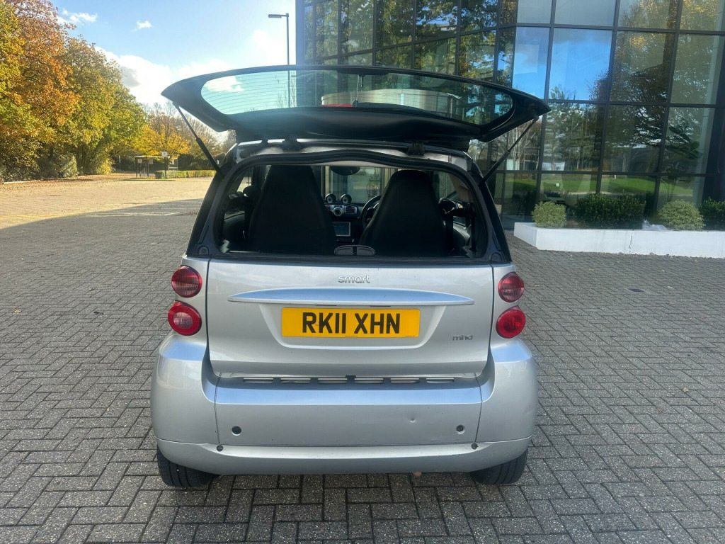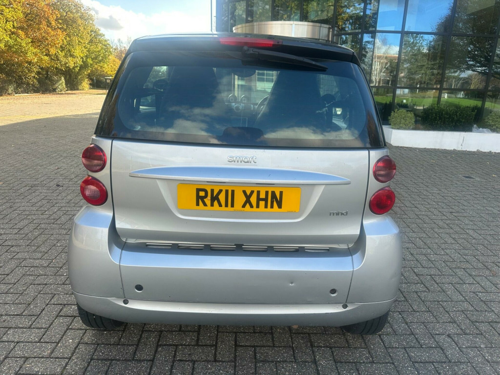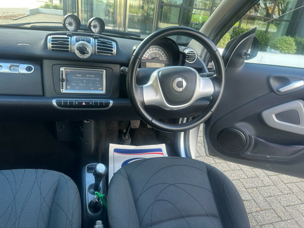 This 2011 Smart Fortwo MHD Passion offers excellent peace of mind with its MOT valid until March 2026 and a clear vehicle history check. This well maintained example has had only 2 owners, 2 keys and benefits from a partial service history, with its last service completed on 2025-03-04 at 65,907 miles. Inside, you'll find a comfortable cabin equipped with Air Conditioning featuring automatic temperature control, and a Bluetooth Hands Free System for seamless connectivity.Enjoy the open air with the impressive panoramic glass roof, which includes both an opening sunroof and a fixed section with a sunblind. This Smart Fortwo is powered by an efficient 1.0L petrol engine, achieving an outstanding 66 mpg, which is a significant highlight indicating its superior fuel economy compared to similar vehicles. Furthermore, its low CO2 emissions contribute to its appeal. A 3 month warranty is included for your added reassurance., volt socket with cover, 15in 12-spoke alloy wheels, 2 speakers, 2spoke leather steering wheel, air conditioning with automatic temperature control, airbag - full size driver, airbag - full size passenger, anti-lock braking system with electronic brake force distribution, audio system navigation-multimedia highline, automatic hill start assist on uphill slopes, aux-usb, bluetooth hands-free system, central locking with radio remote control, crash elements at front and rear, crash sensor auto switch-on of hazard warning lights, esp - electronic stability programme with hill start assist, electric tailgate release, electric windows, heated rear window, luggage compartment cover - retractable, paint- solid- solid roof, panoramic glass roof with sunblind, panoramic roof, pollen and dust filter, rds radio with 6.5 touchscreen display, tridion safety cell door mirror caps & front grille- black, tridion safety cell door mirror caps & front grille- silver, tridion safety cell, tridion safety cell in silver, ipod interface