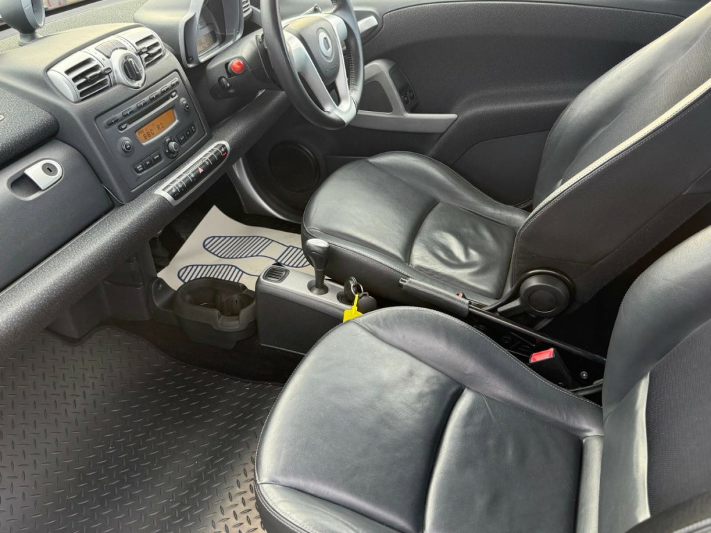 Smart Fortwo Pulse, Automatic, 1.0 petrol, 2 door coupe in silver. This vehicle is exceptionally low mileage at just 51,000 with a full service history present with stamps present at 7k, 15k, 18k, 22k, 27k, 32k and then just done at 51k. Has a very long MOT with the next one being due on the 14/09/2026. A very well looked after example that is in excellent condition throughout, clean bodywork and has a superb clean interior with no unpleasant smells. Very economical and is just £35 a year to tax. This vehicle is a true neutral meaning it is ideal for being used a tow car for motor homes. Has a high specification which includes remote central locking, alloy wheels, full black leather upholstery, heated front seats, electric front windows, cup holders, aux connectivity, radio and much more. This vehicle is HPI clear, the V5 is present and comes with two keys. Due to the age of this vehicle we are only able to offer a 1 month engine and gearbox failure warranty only. Please call before travelling to check availability and to ensure the vehicle is on site. We are located in Chilwell, Nottingham.