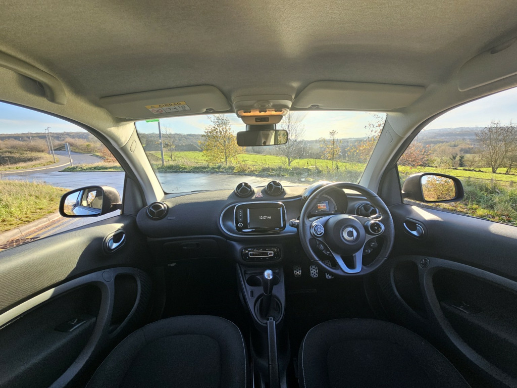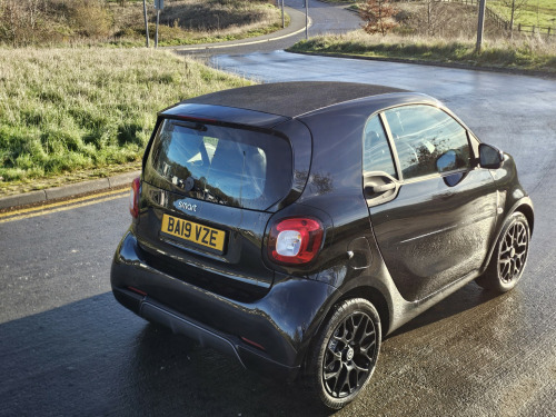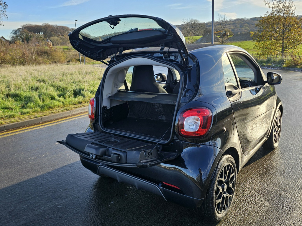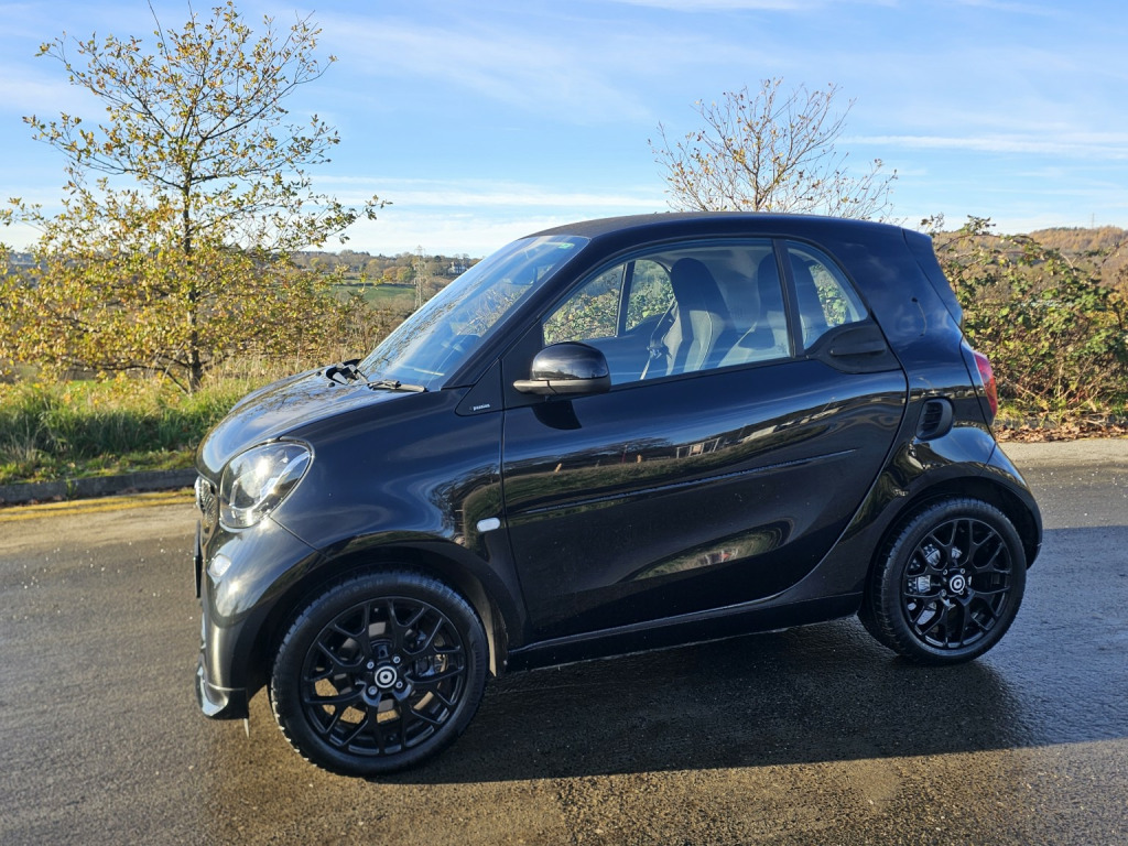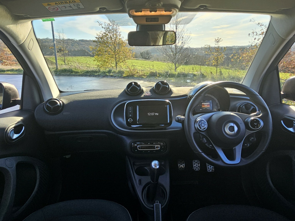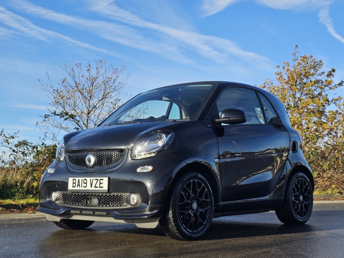 * Smart for two, * 1.0 Urban shadow Edition, * 2019 19 plate, * Only 7600 miles, * Air conditioning,, * Turning Circle: 6m, * 16-inch 8-Y-spoke alloy wheels painted black, * Black radiator trim, * Electric windows & mirrors, * Bluetooth phone / DAB, * Rear spoiler, and a black Tridion safety cell. * 3-spoke multi-function leather steering wheel, * Black fabric on the dashboard and door centre panel, * Smart Media-System with a 7-inch multitouch display, * Front fogs, * Passenger isofix seat, * Service history , * 1 owner