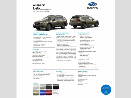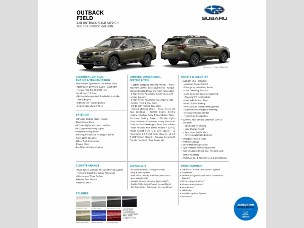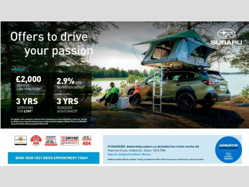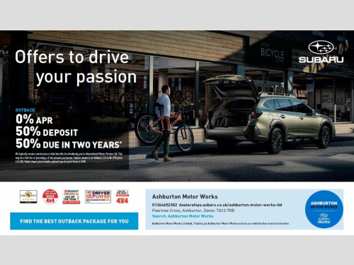 BRAND NEW - MANAGERS SPECIAL SAVE £1,500 - READY FOR SEPTEMBER REGISTRATION! Stunning Subaru Outback Field 2.5 Petrol AWD in Crystal Onyx Black - https://www.ashburtonmotorworks.co.uk/new/subaru/outbackSubaru's Flagship model, the Multi-Award Winning Outback - Voted 4x4 Crossover year after year. Looking for a full size family estate that's so much more, here it is.Subaru – Better Where it Matters - At the heart of every Subaru lies a world class Symmetrical All-Wheel-Drive system beautifully paired with a unique Flat 4 Boxer engine design. This creates a light weight, low center of gravity, truly balanced platform, envied the world over. This recipe was developed in the late 70’s and remains the major reason Subaru vehicles handle, ride and perform so admirably in all situations, particularly when the going gets tough. Add industry leading safety technology, unbeatable reliability and you’ve got a truly unique range of vehicles that fit life in more adventurous parts of the world exceptionally well. Voted Best Manufacturer in 2024 by Auto Express brings UK recognition we Subaru owners have been waiting for.Why buy a Subaru? – Ask anyone that owns one and be prepared for an emotionally charged response – They are just so good! We’ve been working with Subaru for over 35 years and couldn’t be prouder. Voted Best Manufacturer in 2024 by Auto Express brings UK recognition we Subaru owners have been waiting for.Welcome to Ashburton Motor Works Ltd where we lead the way for everything Subaru & Isuzu in Devon. We have been main Dealers for Subaru & Isuzu for over 30 years and have been for many years in the top 2 Dealers in the UK for Customer satisfaction.We are very conveniently located just of the A38 between Exeter and Plymouth in a lovely location on the edge of Dartmoor.We specialise in both New and used Subaru & Isuzu car sales, aftersales, servicing and MOT work. We have a range of fantastic offers on the latest Subaru & Isuzu models and many of our loyal customers continue to visit us for their maintenance years after purchase. This is testament to our service quality and outstanding reputation in the Devon region. Visit us and you can view, sit in and test drive any of the Subaru or Isuzu Models that may interest you. Our experienced advisors will also be at hand to answer any questions you may have regarding a purchase or funding.Or you can call us on 01364 652302 We pride ourselves on a no pressure sales process throughout the complete transaction. We look forward to welcoming you through our doors in Ashburton.