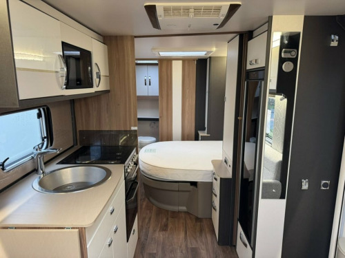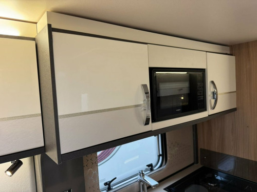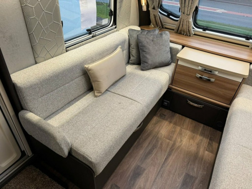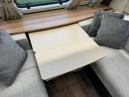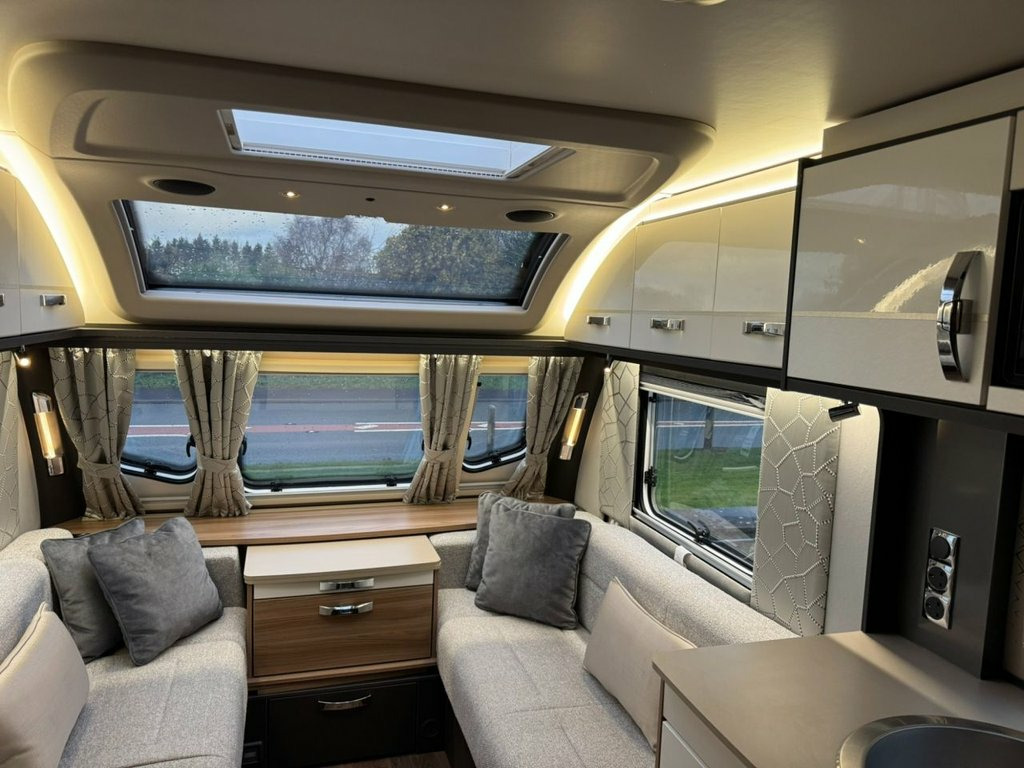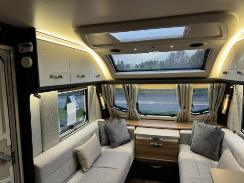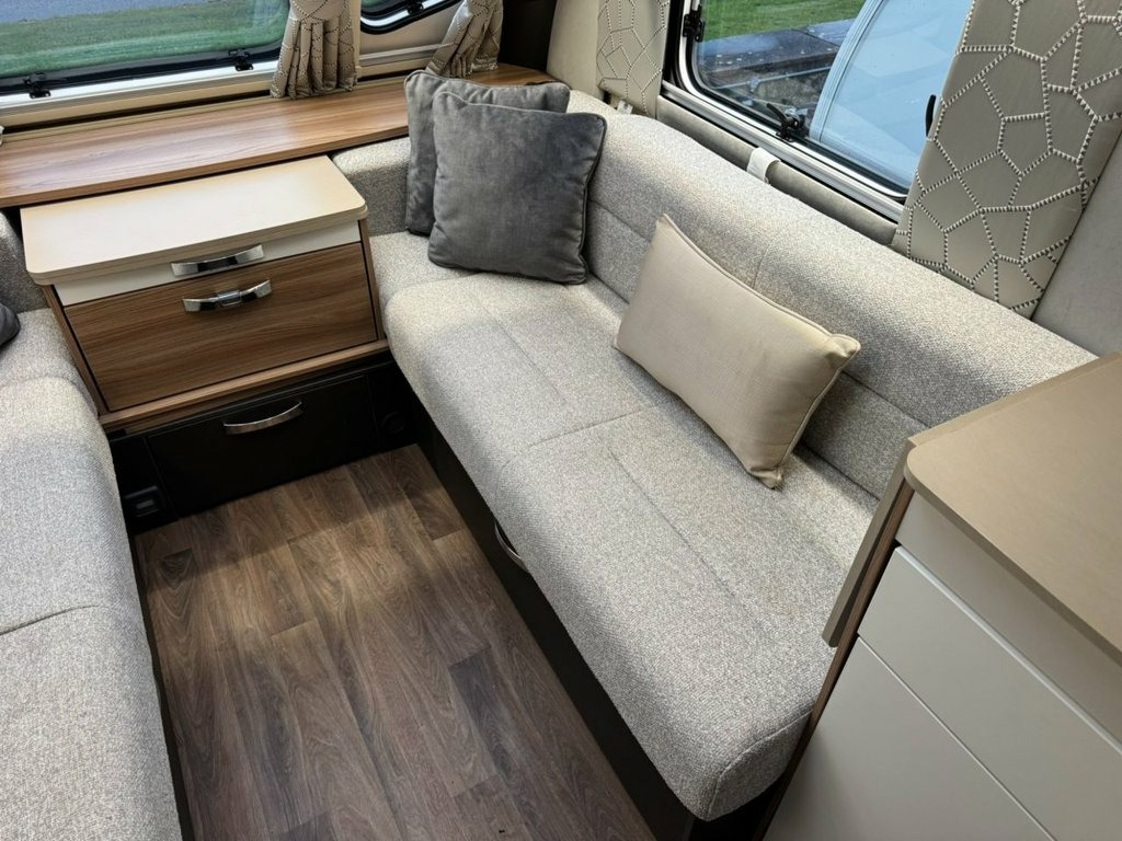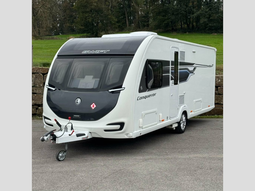 2022 Swift Conqueror 580 4 berth luxury touring caravan. This caravan has a spacious end washroom with separate shower. A fixed transverse island bed, mid kitchen with a wide array of appliances and a front lounge which also converts into 2 singles or 1 large double bed. This caravan has had just 1 owner from new and has been very well maintained since new with a full service history and comes complete with all handbooks, manuals and spare keys. The specification of this caravan is as follows: ATC Trailer control Step on hitch On board 30 litre water tank External gas BBQ point External 230v socket Front and rear external access lockers Thule rear bike rack prep Taller and wider habitation door with waste bin and window Front panoramic roof Truma mains water line Heavy duty corner steadies 100w solar panel Front chest of drawers with occasional table Soft close gloss fronted locker doors Zinc soft furnishing scheme with matching scatter and bolster cushions Extending kitchen worktop Circular sink with mixer tap 3 gas ring burner hob with 1 electric hotplate Oven and separate grill Illuminated splashback Microwave Tall fridge with freezer compartment Transverse island bed with storage above and below Padded full length headboard Wardrobes and storage solutions to either side Corner vanity unit with TV point Solid sliding washroom door Thetford electric flush toilet Washbasin with mixer tap, vanity mirror and storage pedestal Square fully lined shower cubicle USB charging poin