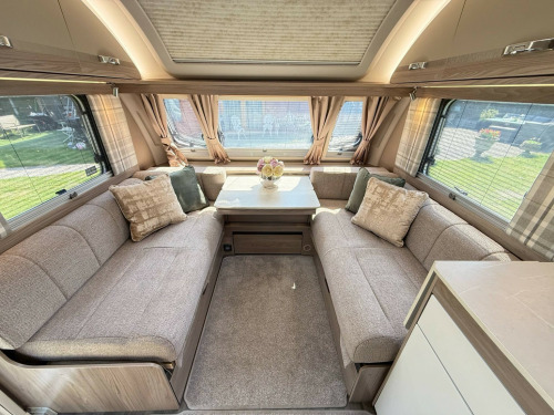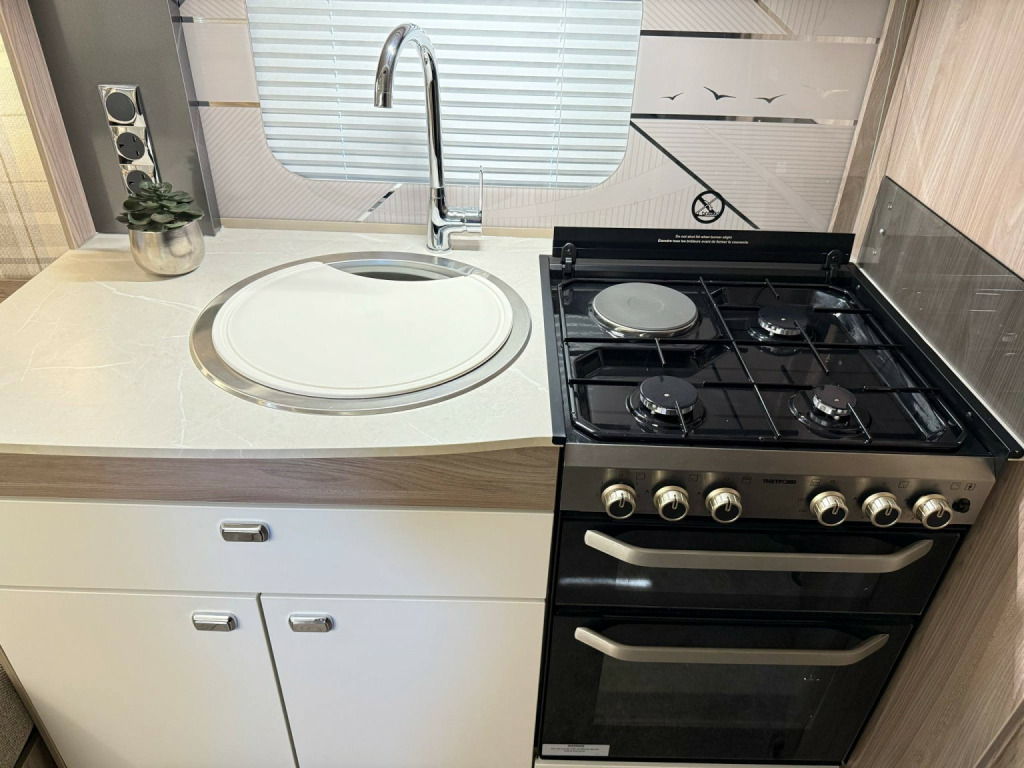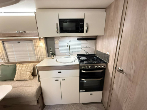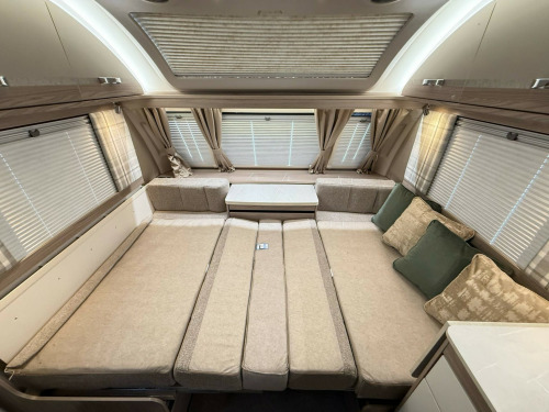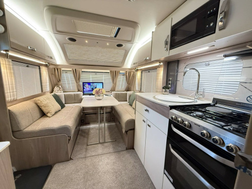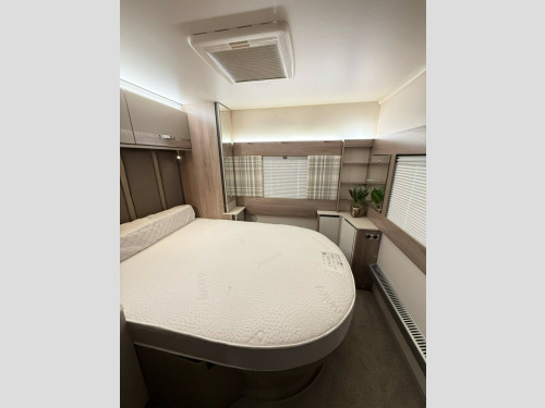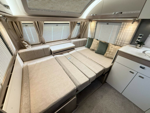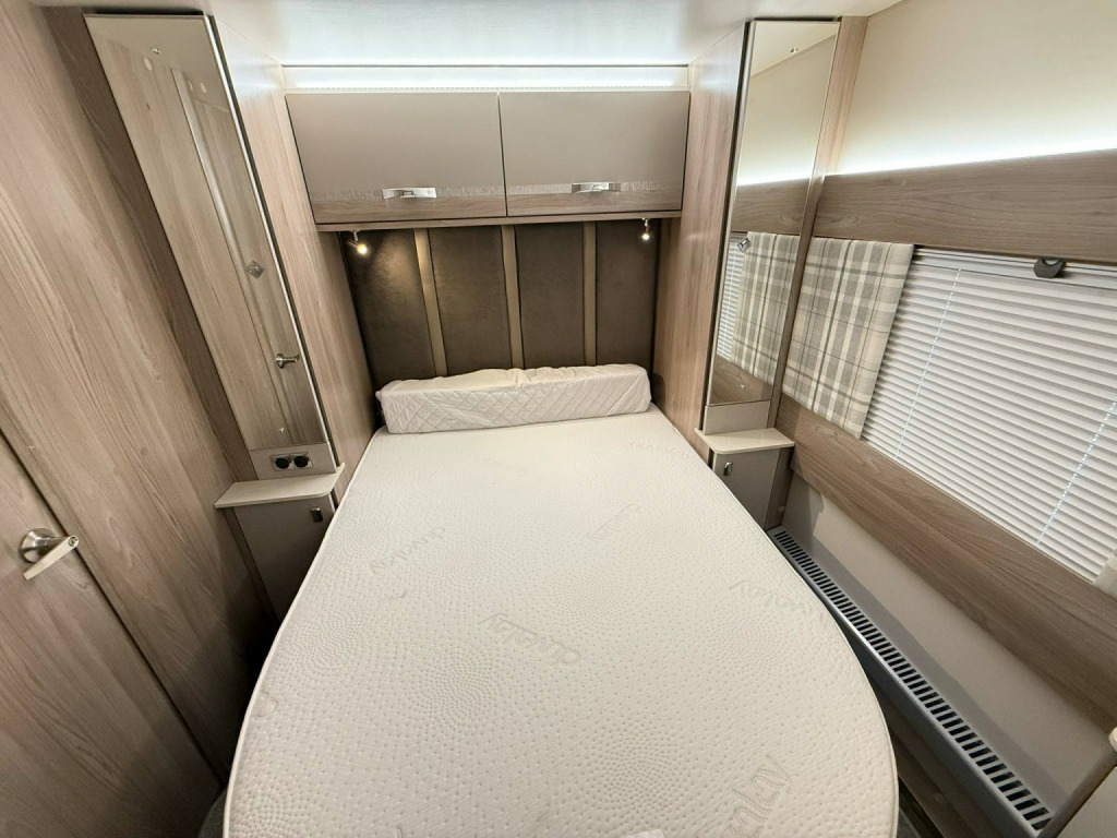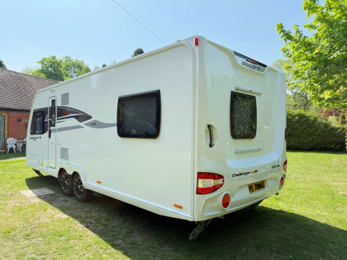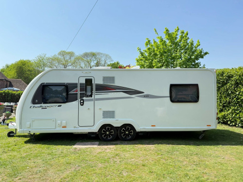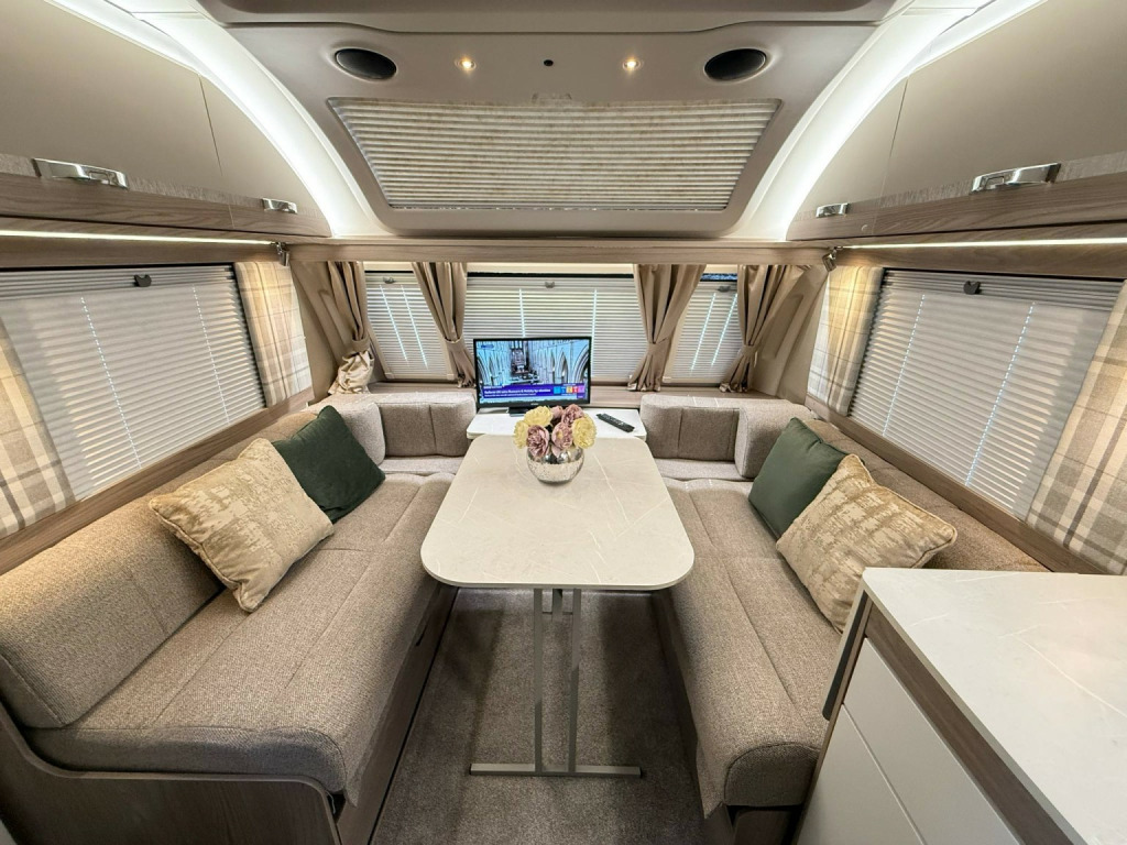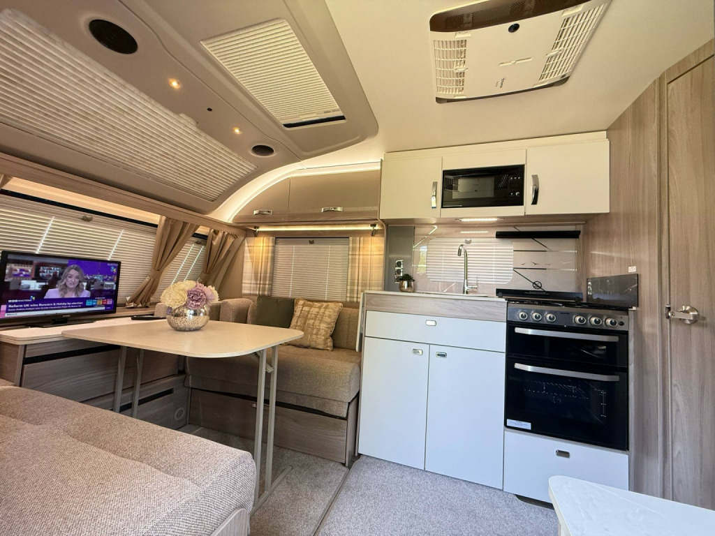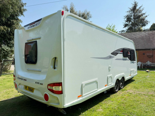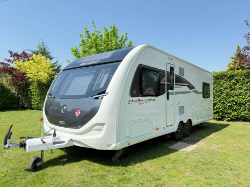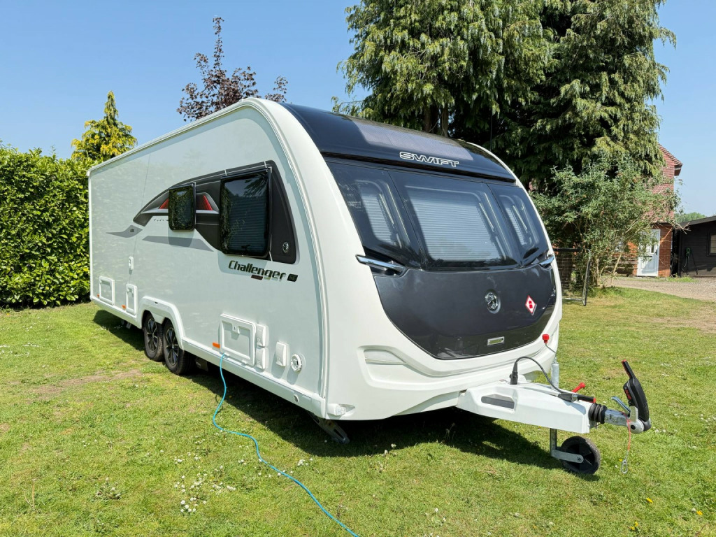 2023 Swift Challenger Grande 635 SE. The Swift Challenger SE 635 Grande is an 8ft wide luxury, spacious 4 berth caravan designed with luxury, comfort and practicality in mind. Still under Swift Warranty, , Last Service and Habitation done July 2025, , Emove Twin Axel Movers, Truma Air Condition, Including Smart TV with remote, Featuring a spacious lounge area, mid washroom and rear transverse island bed making this caravan ideal for the touring couple or small family. Full Diamond Cut alloy wheels, Heavy duty jockey wheel, Exclusive graphics Off side awning light, Exclusive Willow fabric scheme with automotive quilt stitching, Swift AirWave cushioning for greater seating and sleeping comfort. TV point with 230V, 12V and aerial sockets. Thetford thermostatic oven and grill with a three-burner gas hob and a electric hot plate, finished with cast iron frets. Plus, a flatbed microwave, Dometic (Series 10) 133 litre fridge with a freezer compartment. Panoramic front sunroof incorporating fully integrated curved blind system, recessed lighting and speakers. Wardrobes with mirrored doors. Pleated blinds and flyscreens to all windows. Stylish handełes furniture, chrome effect swivel spout vanity tap, additional towel ring. External cold water shower point, external TV point and external BBQ point. Plus, 120W solar panel for off-grid adventures. Exclusive LED rear light clusters, LED high level marker and brake light to provide better visibility in poor weather. length – 7.98m Internal length – 6.27m, Overall width – 2.45m, MRO – 1697kg, MTPLM – 1857kg.