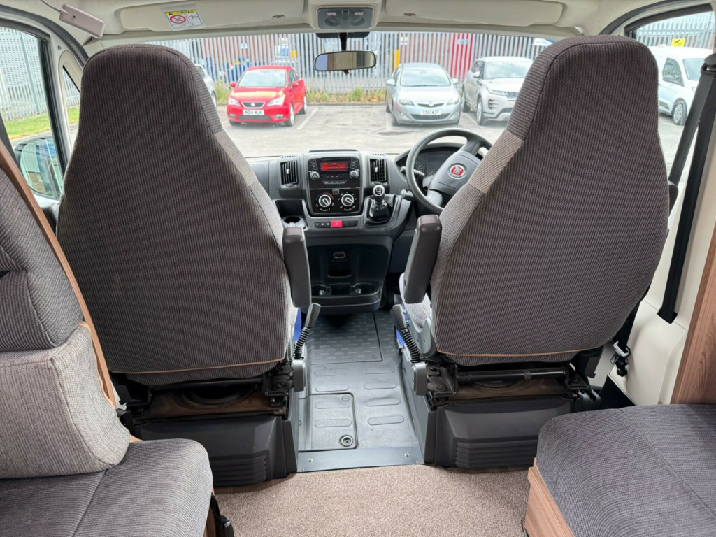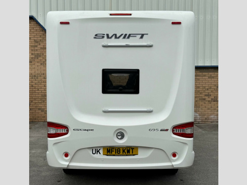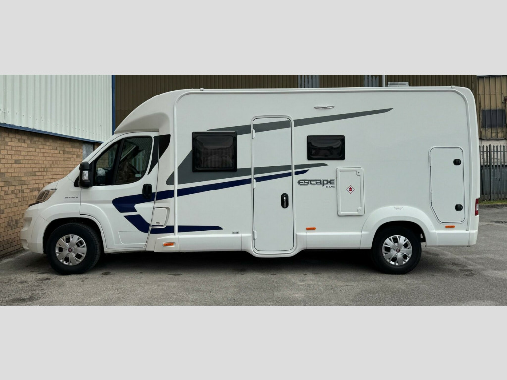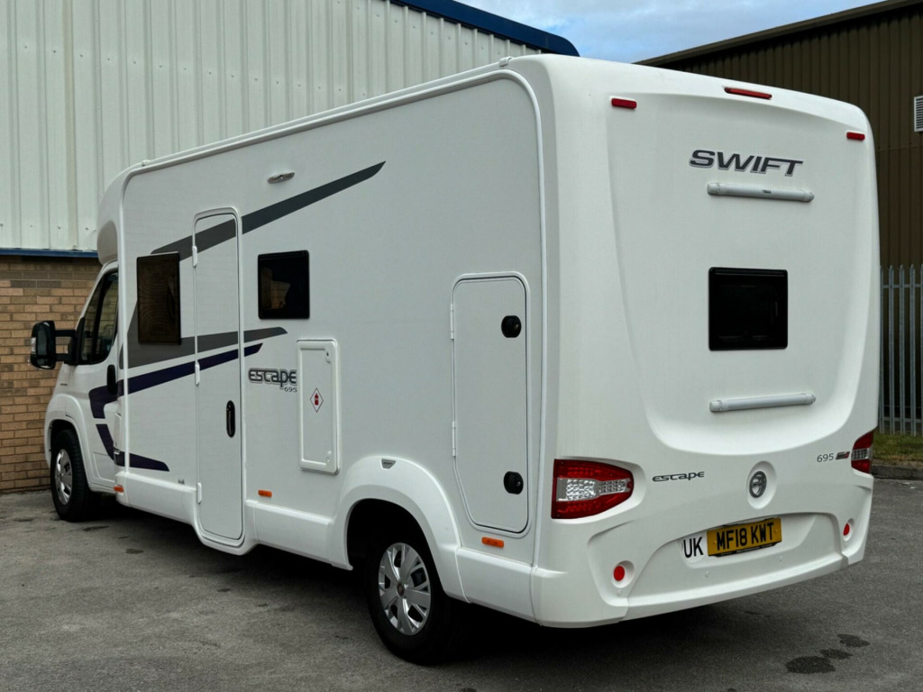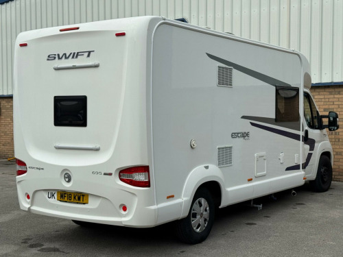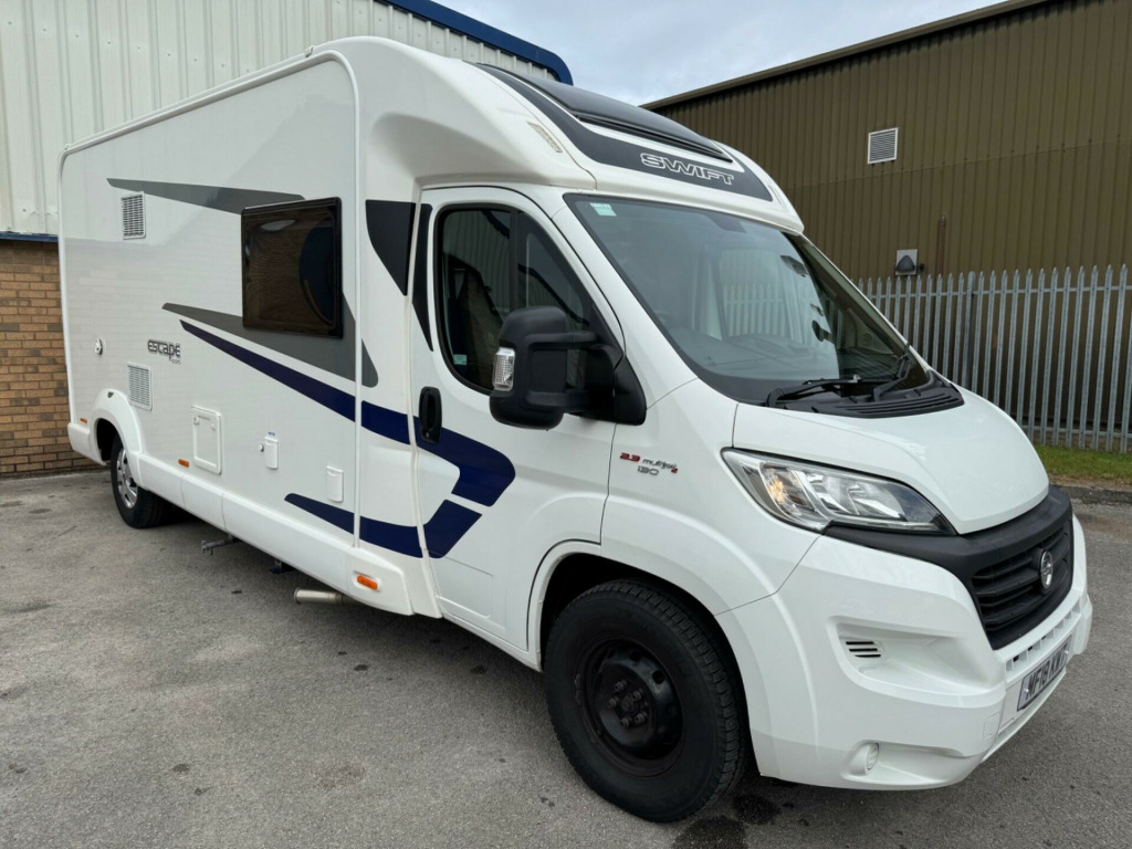 FINANCE AVAILABLE - ENQUIRE WITHIN AT RX MOTORS. Swifts best-selling single coachbuilt motorhome range was completely redesigned last season to stunning effect. With its streamlined low profile exterior, stylish interior and great value specification it will continue to set the benchmark in the coachbuilt sector. With class leading SMART construction, its easy to see why this desirable motorhome range is so widely chosen by those looking for their first motorhome. We have just taken in for sale this 2018 (18 reg) Swift Escape 695, low profile, coachbuilt 6 berth motorhome. 2 owners from new and just 29290 miles. It comes with Full Service History at: 7k, 17k, 20k & 27k. This fine example must be seen to be fully appreciated!, Based on the Fiat Ducato 2.3 multijet diesel engine and putting out 130BHP and coupled to a 6 speed gearbox, this is one of the most popular configurations. The weight is just 3500KG so can be driven by any licence holder. The internal layout is a front lounge, central bathroom and kitchen with transverse bunks arranged across the rear. A drop-down bed lives above the front lounge. There are seat belts fitted for 5 people. The rear bunks are big enough for adults as both bunks are more than six feet long. The bottom bunk can bed folded up as required to help create a slim garage area which can be loaded through an external locker door. The opening front sunroof, which comes as part of the great value Comfort Pack, allows plenty of natural light into the interior where Nova soft furnishings in shades of warm grey and sky blue are paired with Aralie Sen woodgrain. Matt white high level lockers feature chrome positive locker catches for safe and secure storage. Adding to the quality feel are pleated cassette blinds to the windows. Flexible seating and sleeping arrangements feature Swifts exclusive AirWave cushioning with a unique construction that expertly blends comfort and support. Hab check last done on 25/07/2025. All ready for its new owner to drive away!