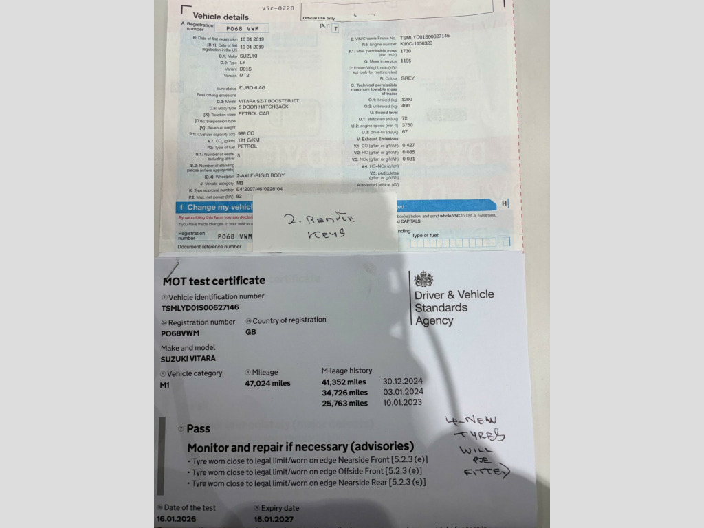 This 2019 Suzuki Vitara SZ-T presents a superb ownership proposition, having been cherished by just one owner from new. With a modest 47,000 miles on the clock, this compact SUV is in excellent condition for its age. It is powered by an efficient 1.0 litre petrol engine, meeting Euro 6 emissions standards, and comes equipped with desirable features such as Bluetooth connectivity for seamless phone integration, a rear parking camera to aid manoeuvring, and automatic air conditioning for consistent cabin comfort.The Suzuki Vitara SZ-T offers a compelling blend of practicality and economy. Its fuel efficiency is a notable highlight, achieving an impressive 46 miles per gallon, which indicates it is more economical than many other vehicles in its class. Furthermore, its low CO2 emissions contribute to a more environmentally conscious driving experience. This combination of low mileage, single ownership, and excellent fuel economy makes this Vitara a sensible and appealing choice.. 12V Accessory Socket x2, 17in Alloy Wheels - Painted Finish, 2 x Front Cup Holders, 2 x Front Door and 2 x Rear Door Bottle Holders, 3-Spoke Leather Covered Steering Wheel, ABS with EBD and Brake Assist Function, Automatic Air Conditioning, Black Wheel Arch and Lower Side Trims, Bluetooth Connectivity, Child Seat Tether Anchorages x 3, Childproof Rear Door Locks, Chrome Lower Front Bumper Trim, Cruise Control with Speed Limiter, Curtain Airbags, DAB Digital Radio, Daytime Running Lights - LED, Deadlocks, Driver Knee Airbag, Driver and Front Passenger Airbags, Driver and Front Passenger Seat Height Adjuster, ESP - Electronic Stability Program, Electric Front and Rear Windows, Electrically Adjustable and Heated Door Mirrors, Emergency Flat Tyre Repair Kit, Freewheeling Key Cylinders, Front 3-Point ELR Seatbelts with Pretensioner-Force Limiter and Height Adjuster, Front Centre Armrest, Front Fog Lights, Front Footwell and Centre Lower Console Box Lights, Front Grille - Chrome, Front Map Light, Front Passenger Airbag Deactivation System, Front Sunvisor with Vanity Mirror and Illumination, Glovebox Light, Halogen Projector Headlamps, Hill Hold Control, ISOFIX Child Seat Anchorages x 2, Immobiliser, LCD Colour Information Display, LED Rear Combination Lights, Locking Wheel Bolts, Luggage Area Cover, Luggage Area Light, Navigation System, Power Steering, Rear 3-Point ELR Seatbelts x 3, Rear Parking Camera, Rear Privacy Glass, Rear Seat with 60-40 Split Folding, Remote Central Door Locking, Removable Double Luggage Room Floor, Roof Rails - Silver, Security Alarm, Side Airbags, Side Impact Protection Beams, Smartphone Linkage Display Audio, Speakers x4, Steering Wheel Mounted Audio Controls, Sunvisor Ticket Holder, TPMS - Tyre Pressure Monitoring System, Tilt and Telescopic Adjustable Steering Wheel, USB Connector, Visible VIN. Full service history
