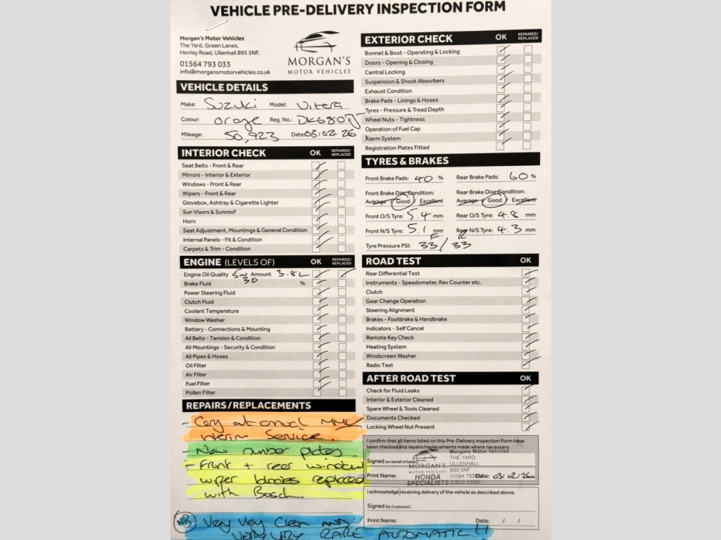, ✔ 12 months AA roadside assistance, Your next Honda deserves care and attention – and so do you. Call or email us today for a stress-free experience. , , THE CAR: This well presented automatic Suzuki Vitara has just 50,923 miles and two owners from new. She has been extremely well maintained and offers excellent value for money. She comes complete her original service history booklet with 6 service stamps in her portfolio and the 7th service to be completed by ourselves. , Our MMV service consists of a pre MOT checking all lights and levels, as well as adding fully synthetic Valvoline 5W30 Motor oil, a new oil filter air filter and pollen filter (pollen if applicable) to this lovely vehicle. , , Our uploaded photo Inspection form confirms :, , Tyres are of good quality across both axles with 5.1 mm on the front and 4.3-4.8 mm on the rear. , Brake pads are in good condition with 40% remaining to the front and 60% remaining to the rear with the brake discs in healthy condition. , , To complete our handover we will help the new owner by going through all relevant documents such as the V5 Registration certificate transfer and taxation, and discuss our 6 month MMV warranty for your convenience. , PLEASE CALL MORGAN YOUR FRIENDLY HONDA EXPERT