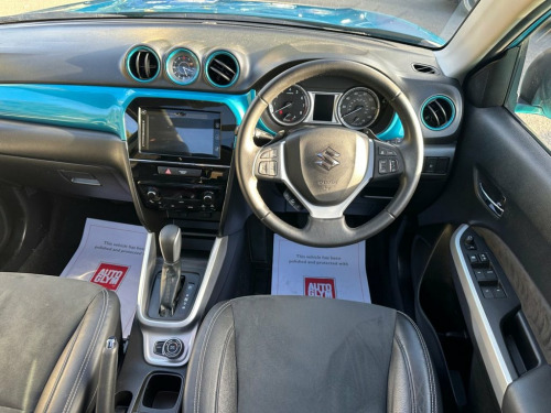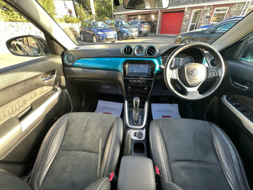 Now available is this 2017 Suzuki Vitara 1.6 SZ5 Auto ALLGRIP, a versatile and well-specified SUV that has covered just 36,000 miles from new and comes with a full service history, giving excellent reassurance over its upkeep. Powered by the reliable 1.6-litre petrol engine producing 120 ps, paired with a smooth automatic gearbox and Suzuki's capable ALLGRIP four-wheel-drive system, it delivers confident performance and year-round usability. The range-topping SZ5 trim ensures a superb level of equipment, including panoramic sunroof, satellite navigation, rear parking camera with sensors, keyless entry and start, cruise control, leather and suede upholstery, automatic air conditioning, Bluetooth connectivity, DAB digital radio, and stylish alloy wheels. With its raised driving position, spacious interior, and practical boot, it strikes an excellent balance between comfort, style, and everyday practicality. Combining low mileage, full history, high specification, and 4WD capability, this Vitara SZ5 Auto ALLGRIP is a fantastic choice for those seeking a compact SUV with premium features and dependable performance. 12V Accessory Socket - Centre Lower Box, 12V Accessory Socket - Luggage Area, 17in Alloy Wheels - Polished Finish, 2 x Front Cup Holders, 2 x Front Door and 2 x Rear Door Bottle , 3-Spoke Leather Covered Steering Wheel, ABS with Brake Assist Function, Adaptive Cruise Control, Analogue Clock, Atlantis Turquoise Pearl with Cosmic Bla, Automatic Air Conditioning, Automatic Headlamp Levelling, Automatic Headlamps, Bluetooth Integrated into Audio Unit, Body Coloured Exterior Mirrors and Door , Centre-Lower Box, Child Seat Tether Anchorages x 3, Childproof Rear Door Locks, Chrome Interior Door Handles, Curtain Airbags, DAB Digital Radio, Daytime Running Lights - LED, Deadlocks, Double Sliding Pano