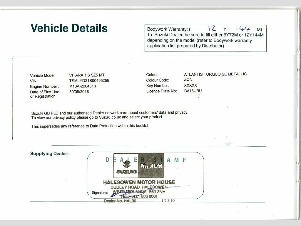 2018/18 Suzuki Vitara SZ5 (s/s) 1.6 Petrol Manual – Atlantis Turquoise Metallic – Panoramic Roof – Full History We are pleased to offer this 2018/18 Suzuki Vitara SZ5 1.6 petrol manual, finished in the standout Atlantis Turquoise Metallic with a high-quality leather and suede interior. This is the top-specification SZ5 model, offering excellent equipment, strong reliability and sensible running costs. The vehicle has had three registered keepers in total, the first being the supplying dealer, followed by two private owners. The most recent owner has had the car since 2020 and has clearly cared for it very well. It comes with a comprehensive service history, with services recorded at: 8,268 miles – September 2019 9,672 miles – November 2020 22,260 miles – September 2021 26,998 miles – August 2022 29,217 miles – November 2023 30,753 miles – May 2025 (most recent) We have two keys, all original books and book packs, and the car presents extremely well both inside and out. It drives exactly as it should. Key Features and Highlights: 1.6 petrol engine with manual gearbox – simple, reliable and well proven SZ5 top-level specification Panoramic sliding glass sunroof Satellite navigation Adaptive cruise control with speed limiter Rear parking camera and front & rear parking sensors LED headlights and LED daytime running lights Keyless entry and push-button start Automatic climate control Smartphone c 12V Accessory Socket - Centre Lower Box, 12V Accessory Socket - Luggage Area, 17in Alloy Wheels - Polished Finish, 2 x Front Cup Holders, 2 x Front Door and 2 x Rear Door Bottle , 3-Spoke Leather Covered Steering Wheel, ABS with Brake Assist Function, Adaptive Cruise Control, Analogue Clock, Automatic Air Conditioning, Automatic Headlamp Levelling, Automatic Headlamps, Bluetooth Integrated into Audio Unit, Body Coloured Exterior Mirrors and Door , Centre-Lower Box, Child Seat Tether Anchorages x 3, Childproof Rear Door Locks, Chrome Interior Door Handles, Curtain Airbags, DAB Digital Radio, Daytime Running Lights - LED, Deadlocks, Double Sliding Panoramic Sunroof, Driver Knee Airbag, Driver