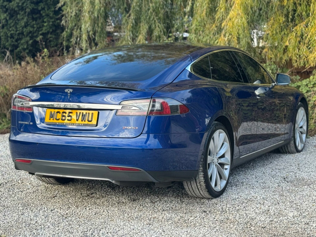 THIS VEHICLE HAS A FIXED SUNROOFExperience exhilarating performance with this 2015 Tesla Model S P90D, a remarkable electric vehicle offering an impressive 0-60mph time of just 3.1 seconds. This Four Wheel Drive model boasts a substantial 86 kWh battery, providing a maximum range of 305 miles when new. Charging at home on a 7kW charger takes approximately 13 hours, while rapid public charging can replenish the battery from empty to 80% in as little as 1 hour and 6 minutes. The Model S also features convenient Bluetooth connectivity for both calls and audio, Xenon headlights for superior visibility, front parking sensors, and a rear view camera to assist with manoeuvring.Beyond its advanced technology, this Tesla Model S offers exceptional practicality with its large boot space, perfect for luggage or shopping. The rapid acceleration of the P90D variant sets it apart from many other electric cars, delivering a truly dynamic driving experience. Combined with its impressive range and efficient charging capabilities, this Model S represents a compelling choice for those seeking a blend of performance, innovation, and everyday usability. v power outlet, 17in touchscreen with media - communication - cabin and vehicle controls, 19in alloy wheels, abs - anti-lock braking system, airbags - curtain, airbags - driver, airbags - head, airbags - knee, airbags - passenger, airbags - pelvis, armrest - centre, automatic emergency braking, blind spot warning, blue charging adaptor, bluetooth connectivity, bluetooth connectivity - audio, child door safety locks - rear, climate control - dual zone, crash sensor - high voltage disconnect, cruise control, cupholders - 2x front centre armrest, daytime running lights - led, door handles - retracting, door mirrors - heated and powerfold, door mirrors - memory with driver profile, esc - electronic stability control, electric parking brake, electric windows - power one touch - front and rear, electrically adjustable steering column - tilt-telescopic, front led map lights, glove compartment, headlight cleaning system, headlights - automatic on, headlights - xenon, headliner - textile, high mounted rear light - led, isofix - 2x second row, interior decor - piano black, keyless entry, lane departure warning, mirrors - electrochromatic, mobile app remote, motion activated intrusion alarm, parcel shelf, parking sensors - front, parking sensors - rear, pollen filter, power steering - speed sensitive, radio - am-fm - internet streaming, rear led reading lights, rear taillights - led, rear view camera, rollover crash sensor, roof - solid black, sat nav - onboard maps for europe with 7yrs free updates, seat belt warning sysytem - acoustic, seats - driver and front passenger seat sensors, seats - drivers height adjustment, seats - front 12-way electrically adjustable, seats - front with memory and driver profile, seats - heated front, seats - lumbar support, seats - rear 60-40 split fold, speakers - 7, speed limit display, steering wheel - 3-spoke leather, steering wheel - multi-function with tactile controls, storage - open centre console storage area, sunvisors - front, supercharger enabled, tesla red brake calipers, traction control, trip computer, tyre pressure monitoring system, usb port - dual front, voice activation, wifi internet connectivity, windscreen - uv and infrared blocking safety glass, wipers - rain sensing, panoramic roof, 21in alloy wheels - turbine - silver, smart air suspension