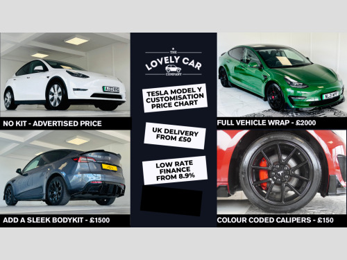 The Lovely Car Company are excited to offer this 2022 Tesla Model Y in Black. With its impressive performance and low running costs, this car is perfect for those looking for a reliable and affordable vehicle. , This Tesla Model Y comes equipped with a range of features, including, 360 degree cameras, heated electric seats, sat nav, and reversing aid. The panoramic glass roof provides a bright and airy feel to the interior, making it a pleasure to drive. , One of the standout features of this car is its fantastic range of over 300 miles per full charge, making it ideal for those who want to reduce their carbon footprint without sacrificing performance. Plus, with its Electric engine, youll enjoy lower running costs and reduced maintenance. , At The Lovely Car Company, we understand that buying a car can be a significant investment, which is why were happy to offer finance options with affordable monthly payments. Our experienced team will work with you to find a payment plan that suits your budget and lifestyle. , All of our cars are prepared at our in-house garage, where they undergo a thorough inspection and preparation process to ensure they meet our high standards. This means you can drive away in confidence, knowing your new car has been carefully checked and maintained. , If youre looking for a reliable, affordable, and environmentally friendly car, look no further than this 2022 Tesla Model Y. Contact us today to arrange a viewing and take the first step towards owning your dream car. , (£399 admin charge for arranging finance externally), , PLEASE NOTE (AERODYNAMIC BODYKIT IS NOT INCLUDED PLEASE CALL OR MESSAGE FOR DETAILS), , Our Teslas are shown in photos fitted with our optional aero body kit to highlight how the car can look with one of our most popular styling upgrades. The advertised price, however, is for the standard vehicle without the body kit fitted. , We do this because many of our customers prefer the clean, original Tesla look — while others like to add the kit for a sportier appearance. The choice is completely yours! The body kit can be added at your request for an additional cost — please contact us for full details or to see photos of the car in standard form.