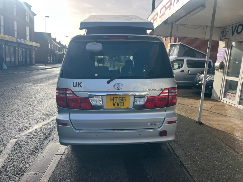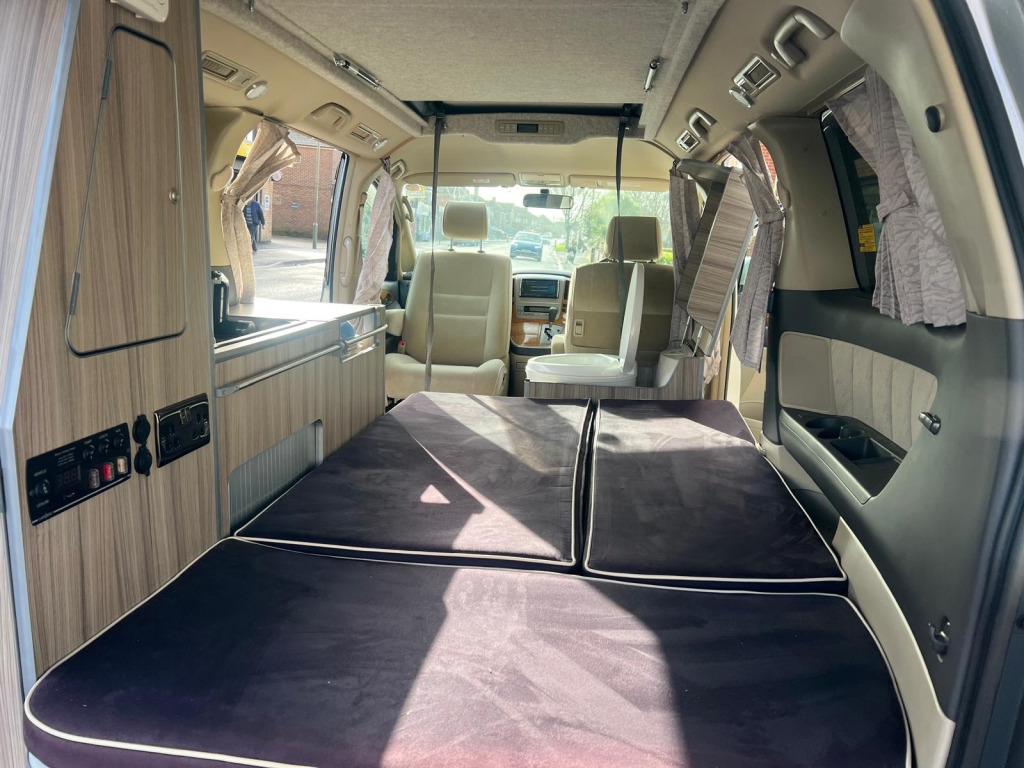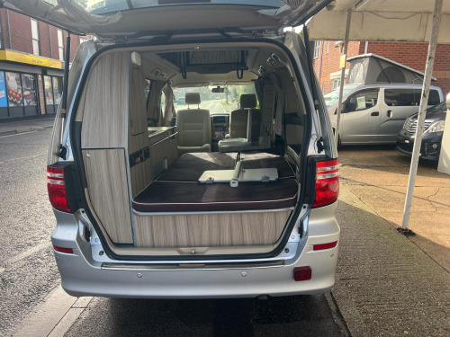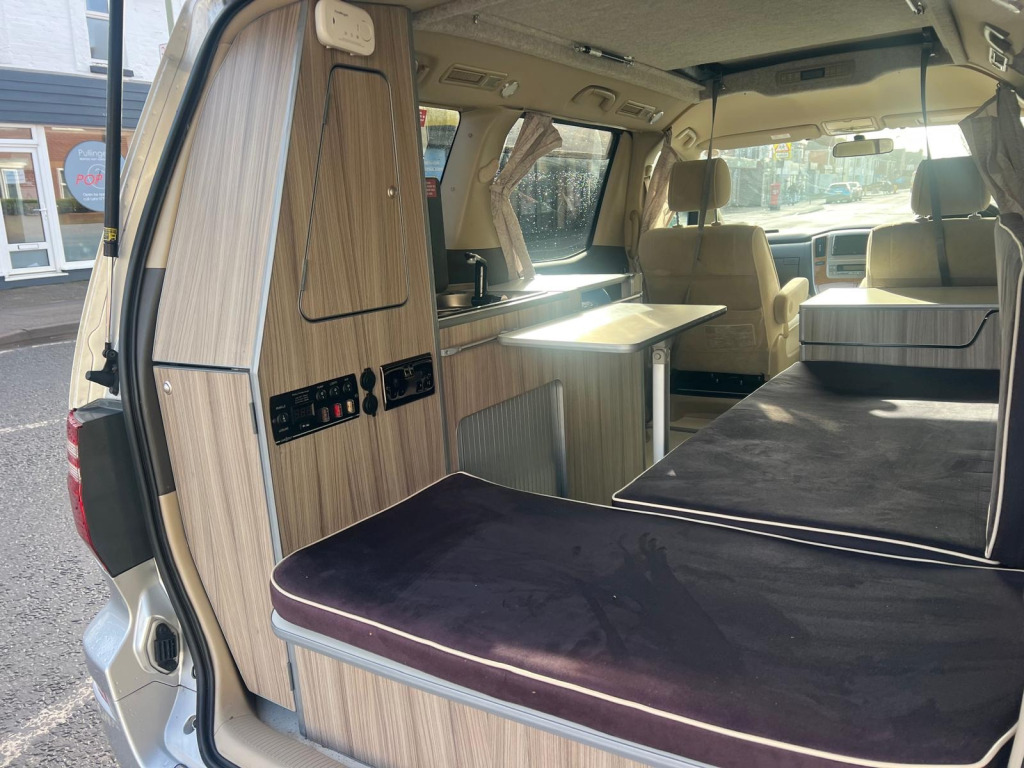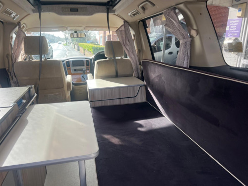 2006 Toyota Alphard AX L EDITION campervan. It comes equipped with a cassette toilet, making it the perfect choice for long road trips and outdoor adventures. (Option to remove toilet if preferred) fitted with a aftermarket stereo & UK satnav. Whether you're planning a camping holiday or a weekend getaway with friends, this Toyota Alphard offers both comfort and convenience for your travels. Don't miss out on the opportunity to own this fantastic campervan. burner hob and sink combo, 12 month warranty, 12v power, 2 tables, 240v mains hook up, 3 month warranty, 75 amp leisure battery, abs, air bags, air conditioning, alloy wheels, apple carplay, carplay stereo with sat nav & reversing camera, cold water tap, cool/hot insulated carry box, current mot, drive away awning multi rail, dual power slide doors, electric windows, elevating bed, elevating roof, fire extinguisher, fresh & waste water containers, fresh water tank, front passenger swivel seat, fully serviced, gas locker, gas safety habitation test certificate, hpi clear, immobiliser, leisure battery, lined curtains, pas, pms unit, rear spoiler, remote central locking, reverse parking mirror, reversing sensors, roof bed, spare key, storage, table with sliding rail, thetford cassette style toilet with electric flush, tinted glass, twin usb sockets, ulez compliant, bimta mileage certificate