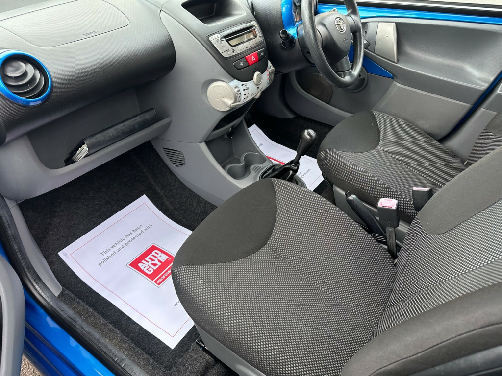 2009 59 TOYOTA AYGO BLUE VVT-I 5 DOOR HATCHBACK FINISHED IN TONIXC BLUE METALLIC, THIS VEHICLE HAS COVERED JUST 38,000 MILES AND COMES WITH JUST 1 PREVIOUS LADY OWNER FROM NEW (LAST OWNER SINCE 2015) 8 X SERVICE STAMPS WITH SERVICE BOOK AND ALL INVOICES, £20 PER YEAR ROAD TAX, INSURANCE GROUP 3E, ELECTRIC FRONT WINDOWS, CLOTH INTERIOR, HEAD RESTS, METALLIC PAINT, HEATED REAR SCREEN AND WILL BE OFFERED WITH 3 MONTHS ENGINE AND GEARBOX WARRANTY, PLEASE CALL FOR FULL DETAILS.