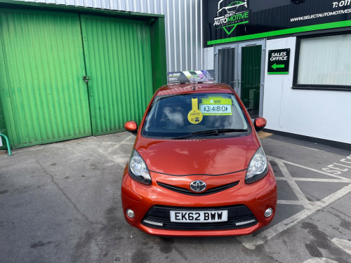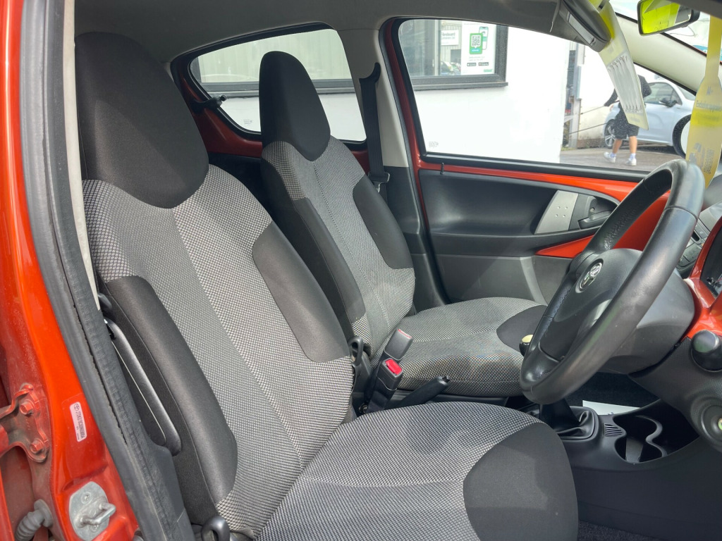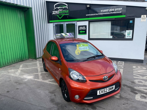 6 SERVICE STAMPS For sale is a well-maintained 2012 Toyota Aygo 1.0 VVT-i Fire 5dr [AC] hatchback with only 84000 miles on the clock. This petrol-powered car is ULEZ compliant and comes with an MOT that expires on 19/05/2026. It has 4 seats and 5 doors, making it perfect for city driving and small family trips. With 4 previous registered keeper(s), this car has been loved and cared for. It includes features such as fuel indicator with low level warning, lights on warning, speed sensitive power steering, and 4 speakers with auxiliary input socket. Don't miss the chance to own this reliable and efficient vehicle that's ready for the road.Select automotive solutions pride ourselves on 5-star service and reviews we are a small family ran business, with over 30 years in the trade, Select Automotive Solutions pride ourselves on supplying vehicles at affordable prices we have teamed up with AA putting you in safe hands with all cars provided with a minimum of 6 months MOT,We welcome any inspection before you buy. Please visit us or take a look on our website at similar stock. We are located 10 minutes from M4/M5 with many quality vehicles to choose from. We offer full dealer facilities, low deposit finance, all debit cards accepted. Please call 0117 2050727 for out of hours response ON THIS VEHICLE please SMS or WhatsApp 07970797964 el indicator with low level warning, lights on warning, speed sensitive power steering, 4 speakers, auxiliary input socket, stereo radio/cd player and mp3 facility, 2 speed wipers/variable intermittent/mist function, body colour door mirrors, colour keyed bumpers, colour keyed door handles, electric front windows, front fog lights, green tinted glass, headlamp levelling, heated rear windscreen, internally adjustable door mirrors, led daytime running lights, rear privacy glass, rear wiper, roof mounted aerial, 12v accessory socket, 3 point elr rear seatbelts x 2, 3 spoke leather steering wheel, 50/50 split folding rear seat, air conditioning, air recirculation system, amba cloth upholstery, centre console storage, driver/passenger seat recline/slide adjust, driver/passenger sunvisors, driver/passenger vanity mirrors with covers, front cupholder, front map reading lights, height adjustable front head restraints, isofix system on outer rear seats, leather gearshift, outer rear adjustable head restraints, rear storage bins, removable rear parcel shelf, stepless tilt adjustable steering column, storage bins on all doors, abs+ebd+brake assist, driver and passenger airbags, fasten seatbelt reminder, front side airbags, height adjustable front seatbelts with pre-tensioners and load limiters, passenger airbag deactivate switch, rear child proof door locks, engine immobiliser, lockable fuel cap, remote central locking, 14'' alloy wheels with locking nuts, full size spare wheel, 14'' Alloys