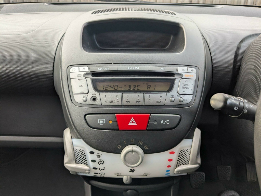 This 2012 Toyota AYGO VVT-i Fire presents an exceptional opportunity with its remarkably low mileage of just 30,274 miles, a significant advantage for a vehicle of its age. Benefitting from a full service history, a clear vehicle history check, and an MOT valid until July 2026, this AYGO has been meticulously maintained. The 1.0L petrol engine ensures an economical driving experience, complemented by a 3 month warranty for your peace of mind.The AYGO VVT-i Fire stands out with its impressive fuel economy, achieving a remarkable 66 miles per gallon, which is considerably better than many other vehicles in its class. Furthermore, its low CO2 emissions and low insurance group rating contribute to very affordable running costs, making it an ideal choice for budget conscious drivers. in alloy wheels - 6 spoke, 3-spoke leather steering wheel, abs - anti lock braking system, accessory power socket - front, air recirculation function, airbags - driver, airbags - front passenger, airbags - front passenger cut-off switch, body coloured door mirrors, bumpers - body coloured, csc - cornering stability control, child protection locks, cupholders - front, daytime running lights - led, digital clock, digital odometer with trip meter, door handles - body coloured, door inserts - moulded, doors - 3 position opening, driver and front passenger sun visors, ebd - electronic brakeforce distribution, electric windows - front, engine management warning, front fog lights, front grille - mesh effect, front wipers - twin speed and fixed intermittent, fuel indicator with low fuel warning, full size spare wheel, fully trimmed boot, glass - green tinted, headlights - electronic levelling, headrests - front intergrated, headrests - rear height adjustable, high mounted rear brake light, isofix child restraint system, interior light, leather gear shift knob, lights on warning, macpherson strut front suspension, oil maintenance warning light, power assisted steering - speed sensitive, rds with pty and eon settings, radio aerial - roof mounted, radio and cd player with aux in, rear door storage bins, rear parcel shelf - removable, rear pop out windows, rear privacy glass, rear storage bins, rear wipers - continual sweep, red tone rear light cluster, remote central locking, seat belt warning - driver, seats - 2 piece folding rear, seats - 50-50 split folding rear, seats - slide and recline adjustable drivers, seats - slide and recline adjustable front passengers, side impact beams, steering column - adjustable stepless tilt, steering column lock, steering wheel - leather, steering wheel 3-spoke with leather trim, storage - central console, storage bins - front doors, tachometer, torision beam rear suspension, transponder key engine immobiliser, vanity mirrors - driver and front passenger with cover, vehicle parts marking - major parts traceable to vin, water temperature indicator