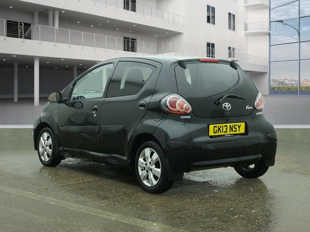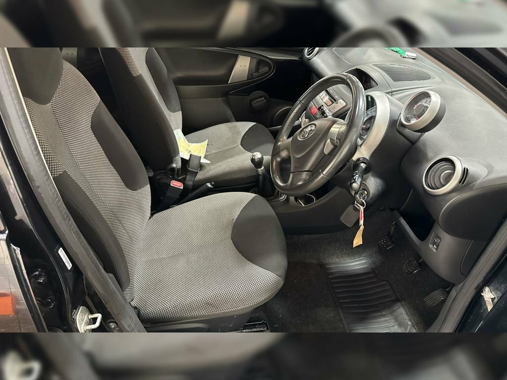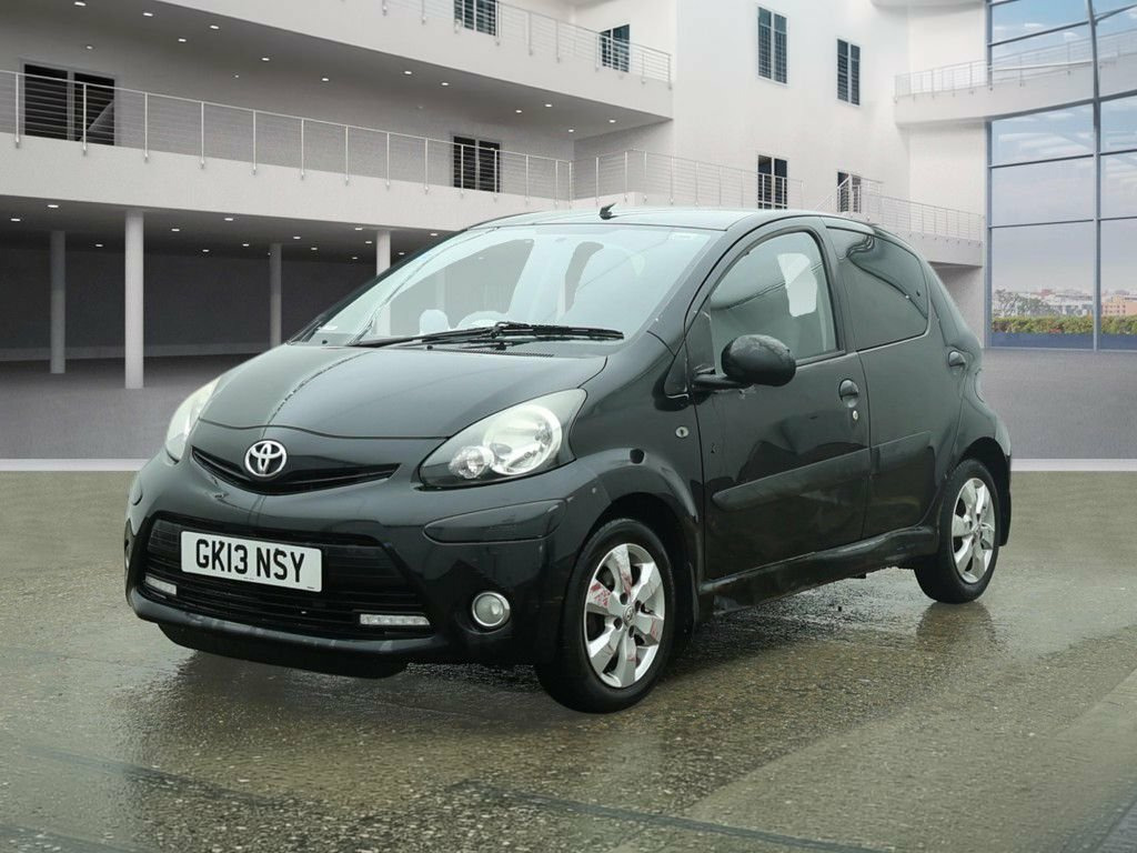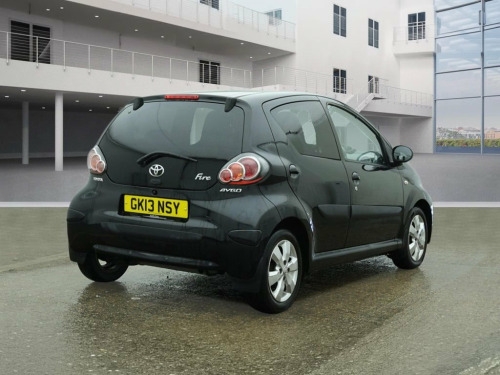 HPI CLEAR, MOT UNTIL 10.11.2026, SUPPLIED WITH NEW SERVICE, LOW MILEAGE, PARKING SENSORS, AIR CONDITIONING, PRIVACY GLASS, ALLOY WHEELS, 5 DOOR, MANUAL, 3 MONTHS WARRANTY, 1 YEAR AA BREAKDOWN, AA DEALER **2013 Toyota Aygo 1.0 Fire: Low Mileage, Privacy Glass, Long MOT! AA Approved!** ******** A sporty special edition of the ultra-reliable city car! This is the 2013 Toyota Aygo in the desirable 'Fire' specification, finished in the sleek **Tempest Black** metallic. This vehicle isn't your standard base model; the 'Fire' edition comes equipped with stylish upgrades including **Privacy Glass** and dedicated **Alloy Wheels**, giving it a much sharper look. Ideally suited for new drivers or city commuters, this car features the highly practical **5-door** layout and benefits from **Low Mileage**. Powered by the award-winning **1.0L VVT-i petrol engine**, it is famous for its bulletproof reliability and incredibly low running costs. ******** **Key Features:** *** **'Fire' Special Edition**: A sought-after trim that adds sporty **Alloy Wheels**, **Privacy Glass**, and unique interior accents. *** **Rear Parking Sensors**: A fantastic feature rarely found on small city cars, making reversing into tight spots effortless. *** **Air Conditioning**: Essential for keeping the compact cabin cool and comfortable in the summer months. *** **5-Door Practicality**: Much more versatile than the 3-door version, making it easy to carry passengers or shoppi 14in Alloy Wheels - 6 Spoke, 3-Spoke Leather Steering Wheel, ABS - Anti Lock Braking System, Accessory Power Socket - Front, Air Recirculation Function, Airbags - Driver, Airbags - Front Passenger, Airbags - Front Passenger Cut-Off Switch, Body Coloured Door Mirrors, Bumpers - Body Coloured, Child Protection Locks, CSC - Cornering Stability Control, Cupholders - Front, Daytime Running Lights - LED, Digital Clock, Digital Odometer with Trip Meter, Door Handles - Body Coloured, Door Inserts - Moulded, Doors - 3 Position Opening, Driver and Front Passenger Sun Visors, EBD - Electronic Brakeforce Distribution, Electric Windows - Front, Engine Management Warning, Front Fog Lights, Front Grille -