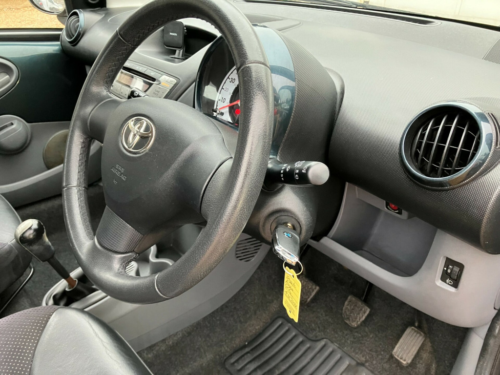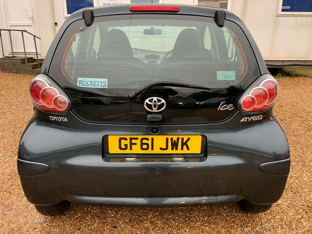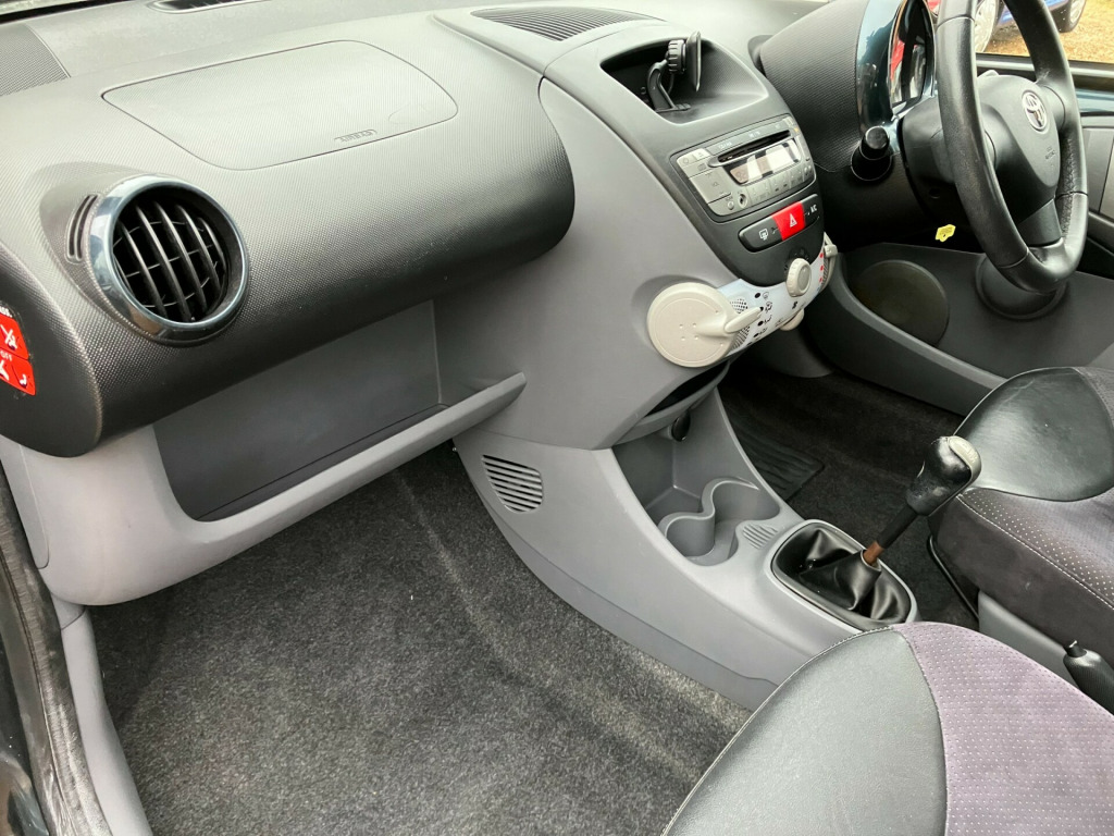 2011 '61' Toyota Aygo 1.0 VVt-i ICEINTERIOR: Black 1/2 leather interior. Electric windows. Remote central locking. Power steering. Air con. Multiple air bags. Factory radio / cd player.EXTERIOR: Green paintwork, colour coded bumpers and mirrors. 14'' wheels. Some marks consistent with age / value etc.MECHANICALS: 998cc petrol engine. 5 speed manual gearbox. All running gear good, and the car drives well. Recent engine service at 45k.PAPERWORK: Cat N repaired. Full logbook. Current MOT expires November 23rd 2026. Invoice for recent engine services.OVERALL: Brilliant little city car. Smart looking. Very low mileage. Very very cheap to run, and cheap Cheap, £20 road TAX. Recent engine service. Long MOT., in steel wheels - 6 spoke, electric windows - front, abs - anti lock braking system, airbags - curtain, airbags - driver, airbags - front passenger, airbags - front passenger cut-off switch, airbags - front side, ebd - electronic brakeforce distribution, isofix child restraint system, air conditioning, pollen filter, rear headrests, seats - 50-50 split folding rear, steering wheel - leather, tilt adjustable steering column, electric power steering - eps, radio and cd player with aux in