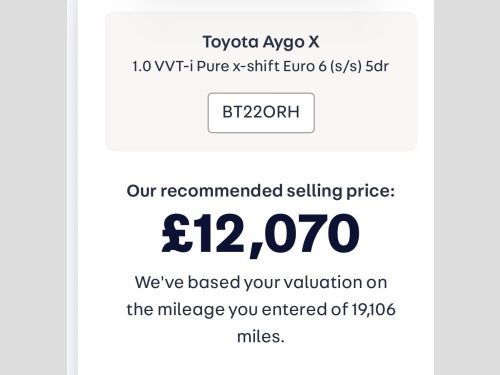 Toyota Aygo X Pure (2022)1.0 VVT-i Pure Hatchback 5dr Petrol x-shift Euro 6 (s/s) (72 ps)One for me, keeper MOT Due: 29/06/2026This vehicle will come with Fresh MOT And New service And 3 Months Gold Warranty cheap to run good condition to(( Category S it was damaged in driver side Wing and driver side front bumper Nothing serious all all photos are available ))17in Alloy Wheels - 5 Double Spoke, 4.2in Colour Multi-Information Display Screen, 7in Toyota Touch Multimedia System, Auto Headlights, Automatic Headlight Cut-Off, Black Door Moulding, Black Insert on Steering Wheel, Black Wheel Arch Moulding, Bluetooth Connectivity, Boot Door Scuff Plate, Centre Room Light, Chrome Interior Door Handles, Chrome Surround on Air Conditioning Button, Clean Air Filter, DAB Digital Radio, Door Handles - Body Coloured, Front Bumper - Body Coloured, Front LED Light Guide, Front Passenger Airbag On-Off Switch, Front Seat Belt Reminder, Headlights - Halogen, Headrests - Front - Deco Art, Intelligent Adaptive Cruise Control Switch on Steering Wheel, Lane Departure Alert with Switches on Steering Wheel, Manual Air Conditioning, Manual Headlight Levelling, Pollen Air Filter, Power Back Door, Power-Adjustable - Electric - Heated Door Mirrors, Pre-Collision System with Emergency Steering Assist, Rear Headrests x2, Rear Seat Belt Reminder, Rear Window Defogger - De-Icer, Rear Window Wiper, Reversing Camera, Roof - Head Lining Adhesive Head Lining, Seats - 50-50 Split Folding Rear, Smartphone Integration - Apple Car Play and Android Auto, Speakers x4, Toyota Safety Sense, Traction Control - TRC, Tyre Pressure Warning System, USB Connector, VSC - Vehicle Stability Control, Vanity Mirror on Driver and Passengers Sun Visor, Variable Intermittent Windscreen Wipers, eCall Emergency Call System, Hi, I've had five cars since yesterday. None of those cars shows on my eBay motors can you please add that for me thanks