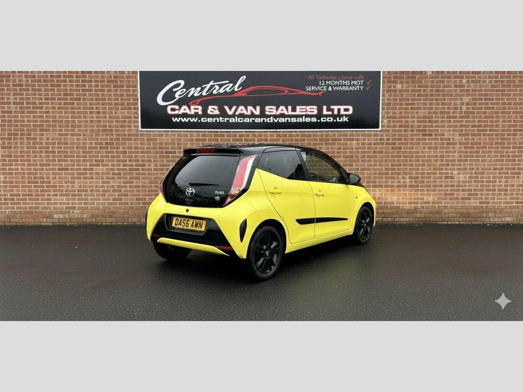 With only 33,527 miles on the clock, this 2016 Toyota AYGO VVT-i x-cite 3 presents a remarkable opportunity for a discerning buyer. This Euro 6 compliant model, powered by an efficient 1.0L petrol engine, boasts a partial service history and has had just two previous owners. The x-cite 3 trim level comes equipped with the x-tra Convenience package, which includes automatic headlights, keyless entry, and climate control, ensuring a comfortable and effortless driving experience. You'll also benefit from Bluetooth connectivity for seamless music streaming and hands-free calls, along with a rear view camera to aid with parking. This AYGO stands out with its exceptional fuel economy, achieving an impressive 69 miles per gallon, which is significantly better than many other vehicles in its class. Its low CO2 emissions and low insurance group further contribute to its cost effectiveness, making it an economical choice for everyday driving. To provide peace of mind, this vehicle comes with a 3 month warranty and a 12 month MOT will be provided upon purchase. 2016 Toyota Aygo 1.0 VVT-I X-CITE BI TONE 5 Door. This car has covered just 33k miles from new with 1 previous owner. The car is in fantastic condition throughout and drives fantastic, This car is ?FREE road tax and is insurance group 7E The car returns 57mpg urban, 79mpg extra-urban and 69mpg combined, This is a really cost effective car to own you will save so much in economy & free road tax plus these are a super reli 15in Alloy Wheels - 5 Double-Spoke - Glo, 3-Spoke Leather Steering Wheel, ABS - Anti Lock Braking System, Air Conditioning, Air Vent Surrounds - Yellow Fizz, Airbags - Curtain, Airbags - Driver, Airbags - Front Passenger, Airbags - Front Passenger Cut-Off Switch, Airbags - Front Side, Alloy Wheels, AM-FM Radio, Beam Cloth - Grey with Yellow Fizz, Bluetooth Connectivity, Centre Console - Gloss Black, Chrome Inside Door Handles, Clean Air Filter, Cupholders - Front, Cupholders - Rear, DAB Digital Radio, Daytime Running Lights - LED, Door Handles - Body Coloured, Door Mirrors - Gloss Black, Driver and Passenger Sun Visors with Mir, EBS - Emergency Brake Signal, Electric and Heated Door Mirrors,