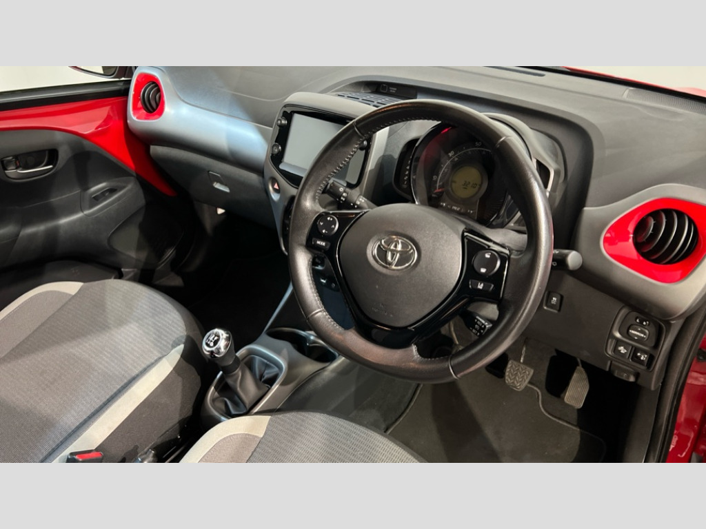 Toyota AYGO 1.0 VVT-i X-Play TSS 5dr 7" touch screen, Bluetooth system, DCM - Data Communication modules, Digital clock, Electric power steering, Fuel indicator with low level warning, Lane departure warning system, Lights on warning, Rear view camera, Smartphone integration powered by pioneer compatible with Apple CarPlay and Android Auto, Speed limiter, Tachometer, Vehicle Stability Control (VSC), 4 speakers, Auxiliary input socket, DAB Digital radio, iPod connection, MP3 connection, Multimedia System, Stereo radio, USB connection, 2 speed wipers/variable intermittent/mist function, Auto headlight levelling, Body colour bumpers, Body colour door handles, Body colour door mirrors, Carbon rear diffuser, Electric adjustable door mirrors, Electric front windows, Electric headlamp adjustment, Green tinted glass, Heated door mirrors, Heated rear windscreen, LED daytime running lights, LED rear lights, Manually dimming rear view mirror, Projector headlamps, Rear spoiler, Rear window demister, Rear wiper, Roof mounted aerial, 12V Accessory socket, 3 spoke leather steering wheel, 50/50 split folding rear seat, Air conditioning, Air recirculation system, Centre console storage, Chrome insert to gearknob, Chrome interior door handles, Cloth upholstery, Driver and passenger sunvisors, Driver's seat height adjuster, Driver/passenger seat recline/slide adjust, Driver/passenger vanity mirrors with covers, Front and rear door pockets, Front cupholder, Front map reading lights, Glovebox, Height adjustable front head restraints, Isofix system on outer rear seats, Leather gear knob, Pollen filter, Rear cupholders, Rear headrests, Steering wheel mounted radio/phone controls, Stepless tilt adjustable steering column, Storage bins on all doors, Storage pockets in centre console, Tonneau cover, ABS, Collision mitigation braking system, Driver and passenger airbags, Emergency brake assist, ESP, Fasten seatbelt reminder, Force limiting rear seatbelts, Front side airbags, Height adjustable front seatbelts with pre-tensioners and load limiters, Hill start assist, Passenger airbag deactivate switch, Rear child proof door locks, Side curtain airbags, Tyre pressure warning, Engine immobiliser, Lockable fuel cap, Remote central locking, Air vent surround in body colour, Space saver spare wheel