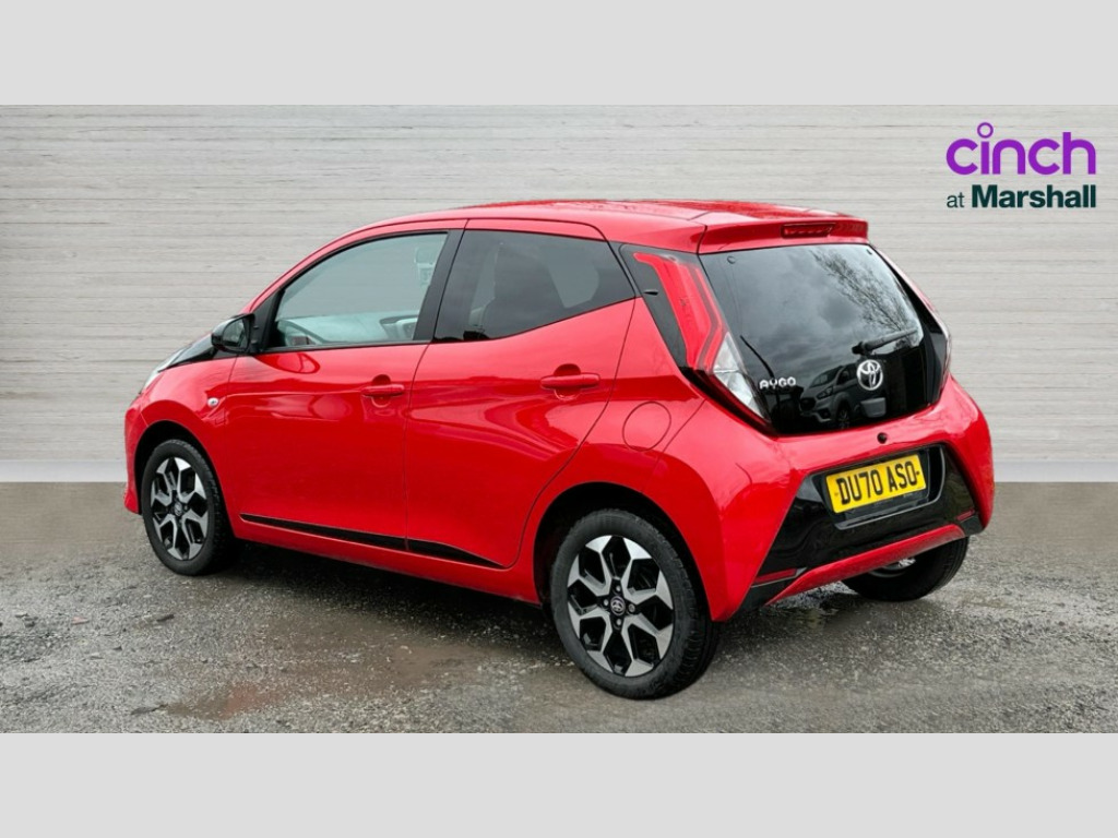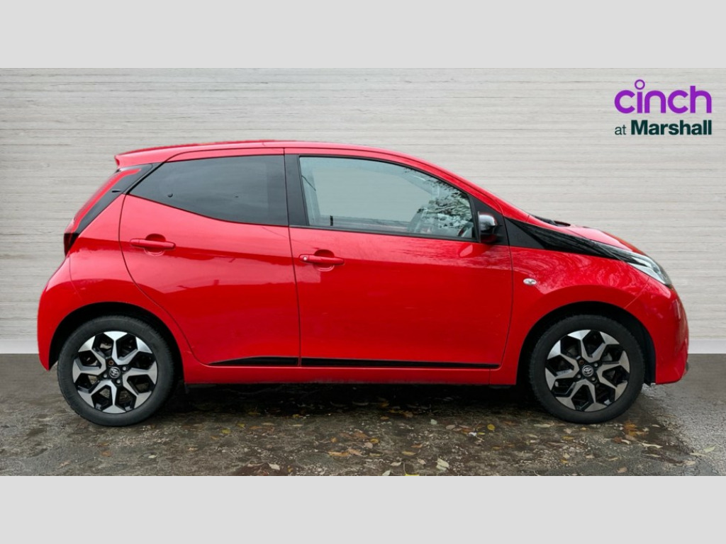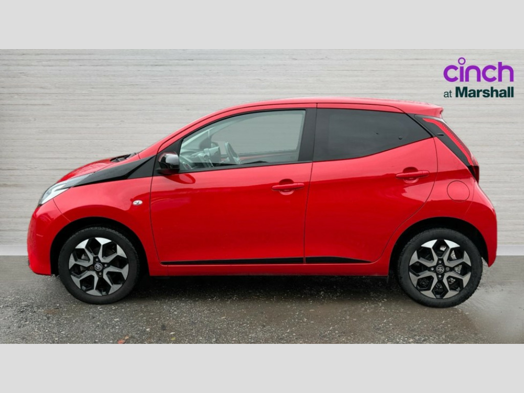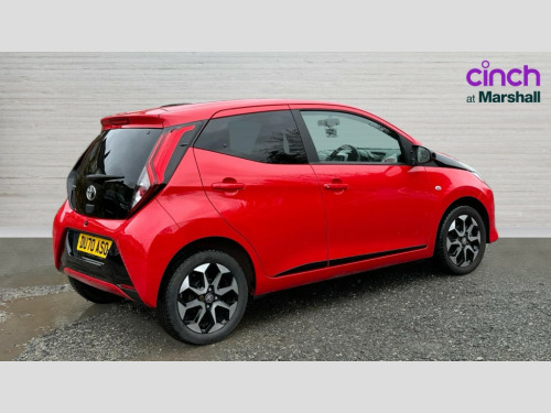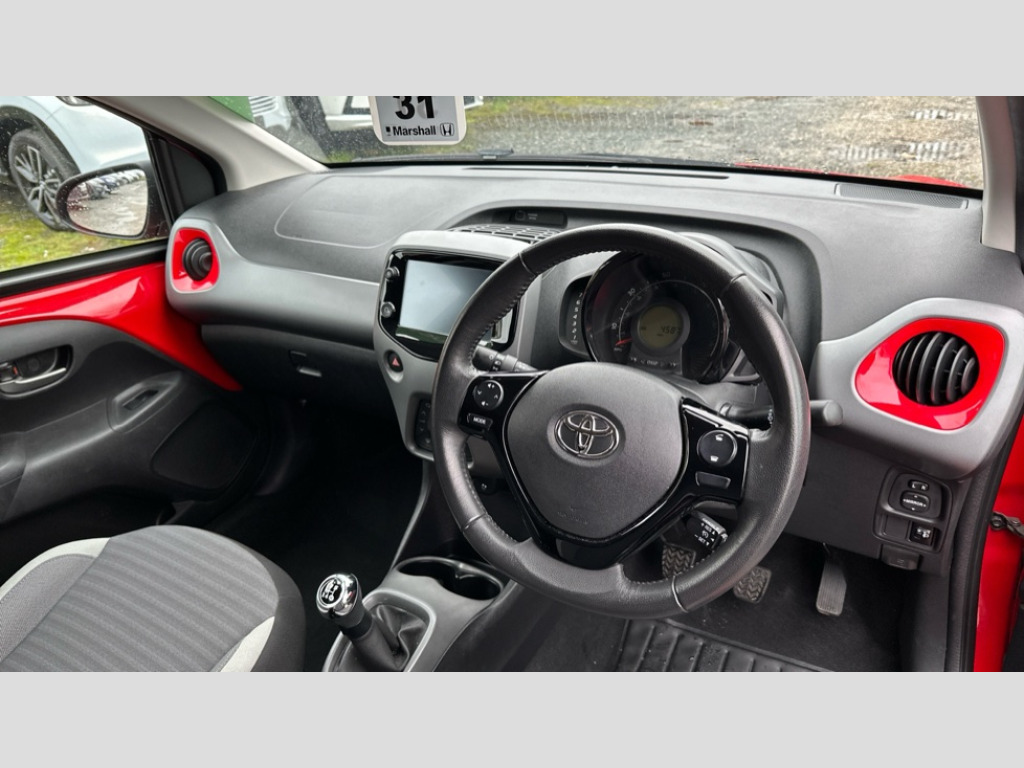 Toyota AYGO 1.0 VVT-i X-Trend 5dr 7" touch screen, Bluetooth system, Digital clock, Electric power steering, Fuel indicator with low level warning, Lights on warning, Rear view camera, Smartphone integration powered by pioneer compatible with Apple CarPlay and Android Auto, Speed limiter, Tachometer, Vehicle Stability Control (VSC), 4 speakers, Auxiliary input socket, DAB Digital radio, iPod connection, MP3 connection, Multimedia System, Stereo radio, USB connection, 2 speed wipers/variable intermittent/mist function, Automatic headlights, Body colour bumpers, Body colour door handles, Carbon rear diffuser, Electric adjustable door mirrors, Electric front windows, Electric headlamp adjustment, Front fog lights, Green tinted glass, Heated door mirrors, Heated rear windscreen, LED daytime running lights, LED rear lights, Manually dimming rear view mirror, Projector headlamps, Rear privacy glass, Rear spoiler, Rear window demister, Rear wiper, Red roof decal, Roof mounted aerial, 12V Accessory socket, 3 spoke leather steering wheel, 50/50 split folding rear seat, Air recirculation system, Auto air conditioning, Body colour instrument panel, Centre console storage, Chrome insert to gearknob, Chrome interior door handles, Cloth upholstery, Driver and passenger sunvisors, Driver's seat height adjuster, Driver/passenger seat recline/slide adjust, Driver/passenger vanity mirrors with covers, Front and rear door pockets, Front cupholder, Front map reading lights, Glovebox, Graphite cloth upholstery, Height adjustable front head restraints, Isofix system on outer rear seats, Leather gear knob, Pollen filter, Rear cupholders, Rear headrests, Steering wheel mounted radio/phone controls, Stepless tilt adjustable steering column, Storage bins on all doors, Storage pockets in centre console, Tonneau cover, ABS, Driver and passenger airbags, Emergency brake assist, ESP, Fasten seatbelt reminder, Force limiting rear seatbelts, Front side airbags, Height adjustable front seatbelts with pre-tensioners and load limiters, Hill start assist, Passenger airbag deactivate switch, Rear child proof door locks, Side curtain airbags, Tyre pressure warning, Engine immobiliser, Lockable fuel cap, Remote central locking, Air vent surround in body colour, 15" 8 spoke alloy wheels, Space saver spare wheel