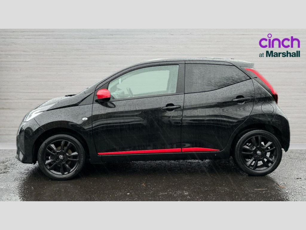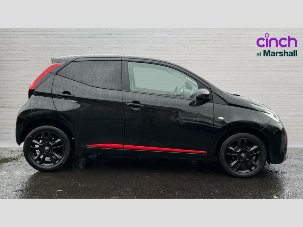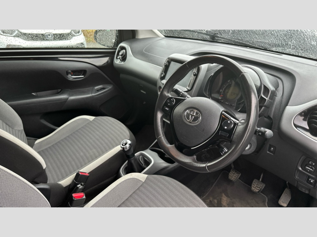 Toyota AYGO 1.0 VVT-i X-Trend 5dr 7" touch screen, Bluetooth system, Digital clock, Electric power steering, Fuel indicator with low level warning, Lights on warning, Rear view camera, Smartphone integration powered by pioneer compatible with Apple CarPlay and Android Auto, Speed limiter, Tachometer, Vehicle Stability Control (VSC), 4 speakers, Auxiliary input socket, DAB Digital radio, iPod connection, MP3 connection, Multimedia System, Stereo radio, USB connection, 2 speed wipers/variable intermittent/mist function, Automatic headlights, Body colour bumpers, Body colour door handles, Carbon rear diffuser, Electric adjustable door mirrors, Electric front windows, Electric headlamp adjustment, Front fog lights, Green tinted glass, Heated door mirrors, Heated rear windscreen, LED daytime running lights, LED rear lights, Manually dimming rear view mirror, Projector headlamps, Rear privacy glass, Rear spoiler, Rear window demister, Rear wiper, Red roof decal, Roof mounted aerial, 12V Accessory socket, 3 spoke leather steering wheel, 50/50 split folding rear seat, Air recirculation system, Auto air conditioning, Body colour instrument panel, Centre console storage, Chrome insert to gearknob, Chrome interior door handles, Cloth upholstery, Driver and passenger sunvisors, Driver's seat height adjuster, Driver/passenger seat recline/slide adjust, Driver/passenger vanity mirrors with covers, Front and rear door pockets, Front cupholder, Front map reading lights, Glovebox, Graphite cloth upholstery, Height adjustable front head restraints, Isofix system on outer rear seats, Leather gear knob, Pollen filter, Rear cupholders, Rear headrests, Steering wheel mounted radio/phone controls, Stepless tilt adjustable steering column, Storage bins on all doors, Storage pockets in centre console, Tonneau cover, ABS, Driver and passenger airbags, Emergency brake assist, ESP, Fasten seatbelt reminder, Force limiting rear seatbelts, Front side airbags, Height adjustable front seatbelts with pre-tensioners and load limiters, Hill start assist, Passenger airbag deactivate switch, Rear child proof door locks, Side curtain airbags, Tyre pressure warning, Engine immobiliser, Lockable fuel cap, Remote central locking, Air vent surround in body colour, 15" 8 spoke alloy wheels, Space saver spare wheel
