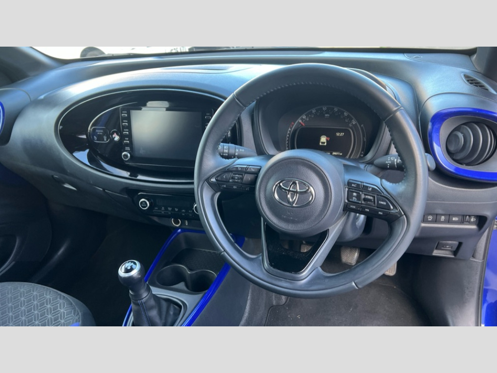 Toyota Aygo X 1.0 VVT-i Edge 5dr 4.2" TFT colour screen, Adjustable speed limiter, Analogue speedometer, Bluetooth connectivity, Digital tachograph, Driver attention alert system, eCall emergency call system, Electric power steering, Intersection turn assist, Key reminder warning, Noise reduction kit, Pre collision system with emergency steering assist, Reversing camera with static guide lines, Smart phone integration with Apple car play/Android Auto, Speed limit display, Start and stop, Vehicle Stability Control (VSC), 4 speakers, DAB digital audio broadcast, Toyota touch 2 multimedia System with 8" Screen display, USB connector, Auto headlights, Auto wipers, Automatic headlights cut-off, Bicycle towing hook, Black fog light surrounds, Black side protection mouldings, Black wheel arch mouldings, Body colour door handles, Body coloured front bumper, Boot door scuff plate, Eclipse black rear bumper, Electric heated door mirrors, Follow me home headlights, Front fog lights, Front power windows, Gloss black door mirrors, Gloss black upper front grille, Headlight cut-off reminder, LED daytime running lights, LED front light guide, LED High mounted stop lamp, Manual day/night rear view mirror, Manual headlight levelling, Pagoda roof, Power adjustable door mirrors, Privacy glass, Projector halogen headlights, Rain sensor, Rear combination lights LED bulb type, Rear side wing doors, Rear windscreen defogger, Rear windscreen wiper, Short antenna, Variable intermittent windscreen wipers, 12v power outlet - front, 2 seat bench in 2nd row, 3 spoke leather steering wheel, 50/50 split folding rear seat, Adhesive roof headlining, Adjustable speed limiter switch on steering wheel, Audio and telephone switches on steering wheel, Auto air conditioning, Black insert on steering wheel, Black roof lining, Boot light, Centre room light, Chrome interior door handles, Chrome surround on air conditioning buttons, Clean air filter, Fabric upholstery, Floor mats, Front and rear cup holders, Front head rest deco art, Front head restraints, Height adjustable driver seat, Intelligent adaptive cruise control switch on steering wheel, ISOFIX child restraint system on rear seats, Lane departure alert switch on steering wheel, Leather gearshift knob, Manual tilt steering wheel, Manually reclining and sliding driver seat, Manually reclining and sliding front passenger seat, Multimedia switches on steering wheel, Pollen filter, Rear door pockets, Rear head restraints, Satin silver insert on gear shift knob, Single compartment glovebox with lights, Single front passenger seat, Soft tonneau cover, Sun visors with mirror on driver and passenger side, Voice recognition switch on steering wheel, Toyota safety sense pack - Aygo X, Anti lock braking system + Electronic brake force distribution, Child safety door lock, Emergency brake light signal (EBS), Hill start assist control (HAC), Passenger airbag on/off switch, Seat belt reminder for front and rear seats, Supplement restraints system (SRS) - 6 airbags, Traction control, Tyre pressure warning system, Immobiliser, Remote power door locks, Black wheel centre caps, Tyre repair kit