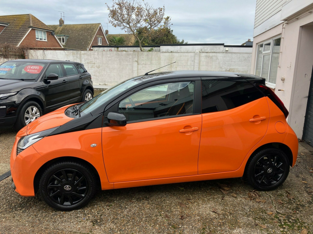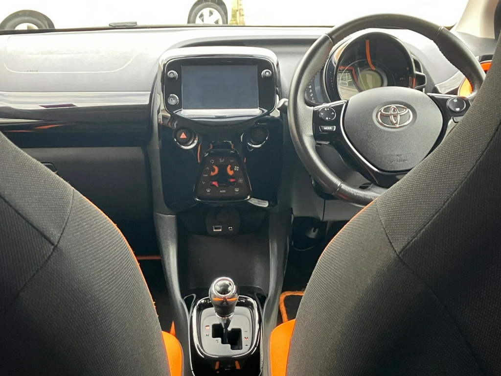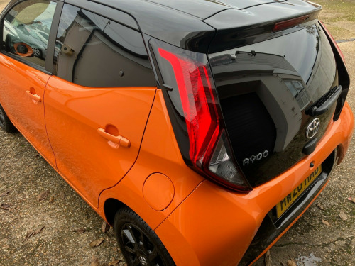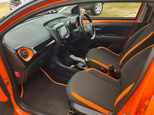 A Striking Toyota Aygo X-Cite 1.0 VVT-i 5 Dr Petrol Euro 6 (71 ps) X-Shift Auto with only 33,500 Miles from new. Fabulous looking, Bi-Tone paint option metallic orange with gloss black accents on the exterior/interior & featuring a 1.0L petrol engine with 71 horsepower. Funky fuel efficient car with it is a 5 Dr hatchback with distinctive X-Cite specific trim level that emphasizes a stylish & customized appearance. Styling including glossy black wheels & mirrors & comes with modern features like a touchscreen infotainment system with smartphone integration, a reversing camera & climate control, in alloy wheels - gloss black, black roof, chrome interior door handles, door handles - body coloured, door mirrors - gloss black, electric front windows, electrically adjustable heated door mirrors, integrated rear spoiler, rear privacy glass, rear window demister, space saver spare wheel, 3-spoke leather steering wheel, 4 seat capacity, automatic air conditioning, body coloured side air vent surround, carpet mats with orange highlights, chrome insert on gear shift, clean air filter, cupholder - front and rear, glovebox, leather gear shift, manual rear view mirror, manual tilt steering wheel, rear headrests x2, recline and slide adjustment - driver and front passengers, seats - 50-50 split folding rear, seats - drivers height adjustment, steering wheel - audio and telephone controls, storage - front door pockets, storage - rear door pockets, storage pocket in central console, tonneau cover, unique design air vents with colour surround, vanity mirror on driver and passengers sun visor, 7in x-touch multimedia system, dab digital radio, front 12v power outlet, smartphone integration - powered by pioneer, usb and aux connection, abs - anti lock braking system, emergency brake-light signal - ebs - hazard type, force limiters on rear seatbelts, front passenger airbag on-off switch, front seat belt reminder, hac - hill start assist control, isofix fixing points, rear seat belt reminder, seat belt - pre-tensioners and force limiters, supplemental restraint system - srs - airbags - 6 airbags, vsc - vehicle stability control, auto headlights, daytime running lights - led and rear leds, front fog lights, headlights - electronic levelling, led rear brake lights, projector halogen headlight with led tracer lights, electric power steering - eps, reversing camera, tyre pressure warning system