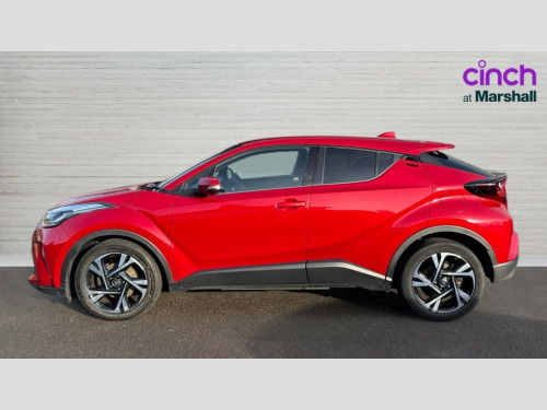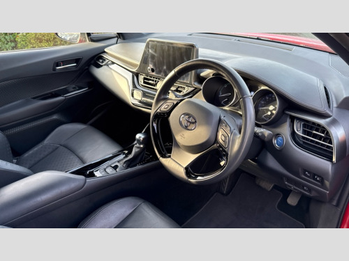 Toyota C-HR 1.8 Hybrid Design 5dr CVT 4.2" coloured TFT screen for multi-information display, Adaptive cruise control, Blind spot monitoring with rear cross traffic alert, Bluetooth connectivity, E-call, Electric power steering, Front parking sensors with ICS and auto braking, Hybrid system indicator, Lane departure alert with steering control, Lane trace assist, Push button tailgate release, Rear parking sensors with ICS, Remote boot door release in cabin, Remote boot door release in key, Reversing camera, Road sign assist - RSA, Simple Intelligent parking assist, Smart entry and push button start, Smart voice assist, Touch 2 Go navigation system, Trip computer, Voice recognition, Wireless smartphone integration, Vehicle Stability Control (VSC), 6 speakers, AM/FM radio, DAB Radio (Digital Audio Broadcasting), Toyota touch 2 multimedia system with 8" display, USB connector, Wi-fi connectivity, Anti-jam protection on power windows, Auto dimming rear view mirror, Auto high beam, Auto up and down function on all power windows, Automatic headlights, Automatic headlights cut-off, Automatically retractable door mirrors, Black and body coloured rear bumper, Black lower front grille, Black upper front grille, Body colour door handles, Body colour door mirrors, Body colour front spoiler lip, Body coloured front bumper, Boot door release with push button, Electric heated door mirrors, Follow me home headlights, Front and rear power windows, Front fog lights, Headlight cut off reminder, Honeycomb lower front grille, LED daytime running lights, LED High mounted stop light, LED rear brake lights, LED rear combination lights, Manual headlight levelling, Noise reduction layer on front windows and windscreen, Power adjustable door mirrors, Privacy glass, Rain sensor, Rear side wing doors, Rear spoiler, Rear tailgate, Rear window defogger, Rear window wiper, Reflective LED headlights, Shark fin antenna, UV-filter on driver and passenger windows, UV-filter on rear windows, 12v power outlet - front, 3 rear headrests, 3 seat bench in 2nd row, 3 spoke leather steering wheel, 60/40 split folding rear seat, Adjustable rear headrests, Adjustable speed limiter switch on steering wheel, Assist grips front and centre pillar, Audio and telephone switches on steering wheel, Black front door assist grips, Blue ambient lighting on front cup holders, Blue ambient lighting on front doors, Boot light, Chrome interior door handles, Cloth upholstery, Driver and front passenger personal light, Driver and front passenger Whiplash Injury Lessening seats, Driver and passenger seatback pockets, Dual zone automatic air conditioning, Floor mats, Front cupholders, Front head restraints, Front sports seats, Glovebox with internal light, Hard tonneau cover, Heated driver and front passenger seats, Hooks for luggage holding net, Humidifying Nanoe air purifier, Illuminated entry system, Isofix attachments on outer rear seats, Leather gearshift, Light on driver sun visor, Light on passenger sun visor, Manual telescopic steering wheel, Manual tilt steering wheel, Manually height adjustable driver seat, Manually height adjustable front passenger seat, Manually reclining driver seat, Manually reclining front passenger seat, Manually sliding driver seat, Manually sliding front passenger seat, Microphone on front personal light, Mirror on driver sun visor, Mirror on passenger sun visor, Multimedia switches on steering wheel, Pollen filter, Power adjustable lumbar support on driver seat, Shopping bag hooks, Single front passenger seat, Slow opening on lower glovebox, Voice recognition switch on steering wheel, 16 Disk front wheel brake, 3x3 point rear seatbelts, ABS+EBD+Brake assist, Electronic parking brake, Front and rear seatbelt reminder, Front passenger airbag on/off switch, Hill start assist control (HAC), Pre collision system with pedestrian detection, Pre-tensioners and force limiters, Rear door child safety locks, SRS Airbags - Driver + Front passenger, front side, front and rear curtain and driver's knee airbags, Toyota safety sense, Tyre pressure monitoring system, Tyre pressure warning system, Acoustic vehicle alert system (AVAS), Glass-breaking alarm sensors, Immobiliser, Intrusion alarm, Intrusion sensor, Motion sensor alarm, Power door locks, Power passenger window lock, Remote central locking, Black lower dashboard, Black upper dashboard, Gunmetal deco line on upper dashboard, Piano black console, Tyre repair kit