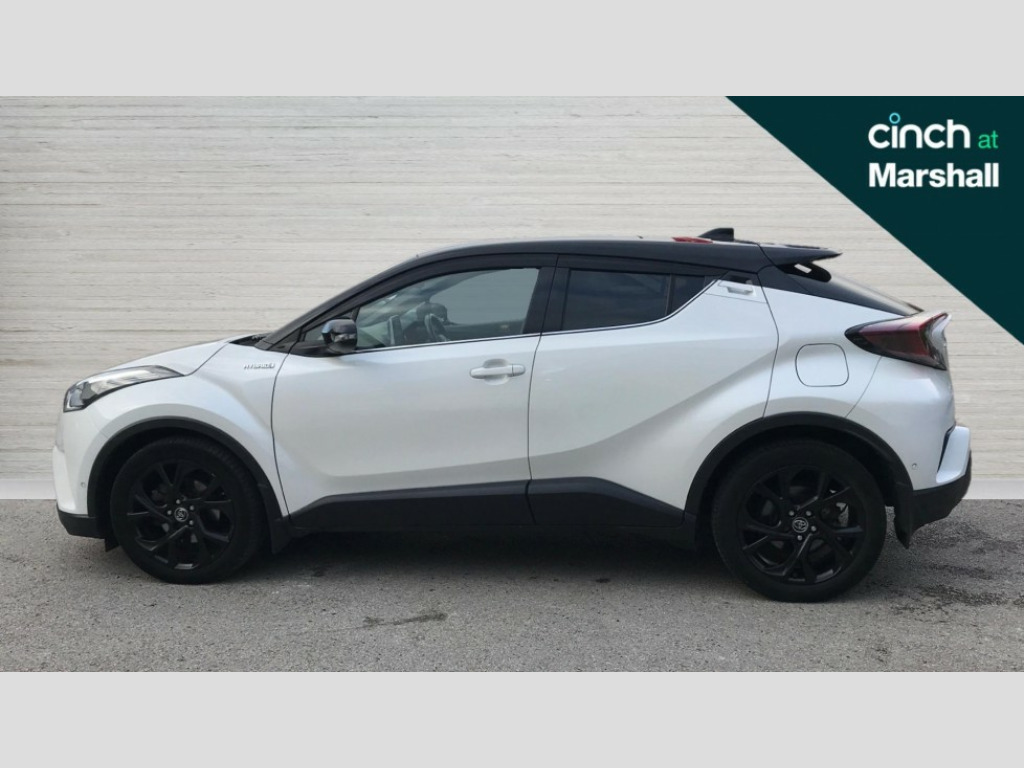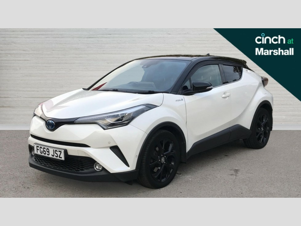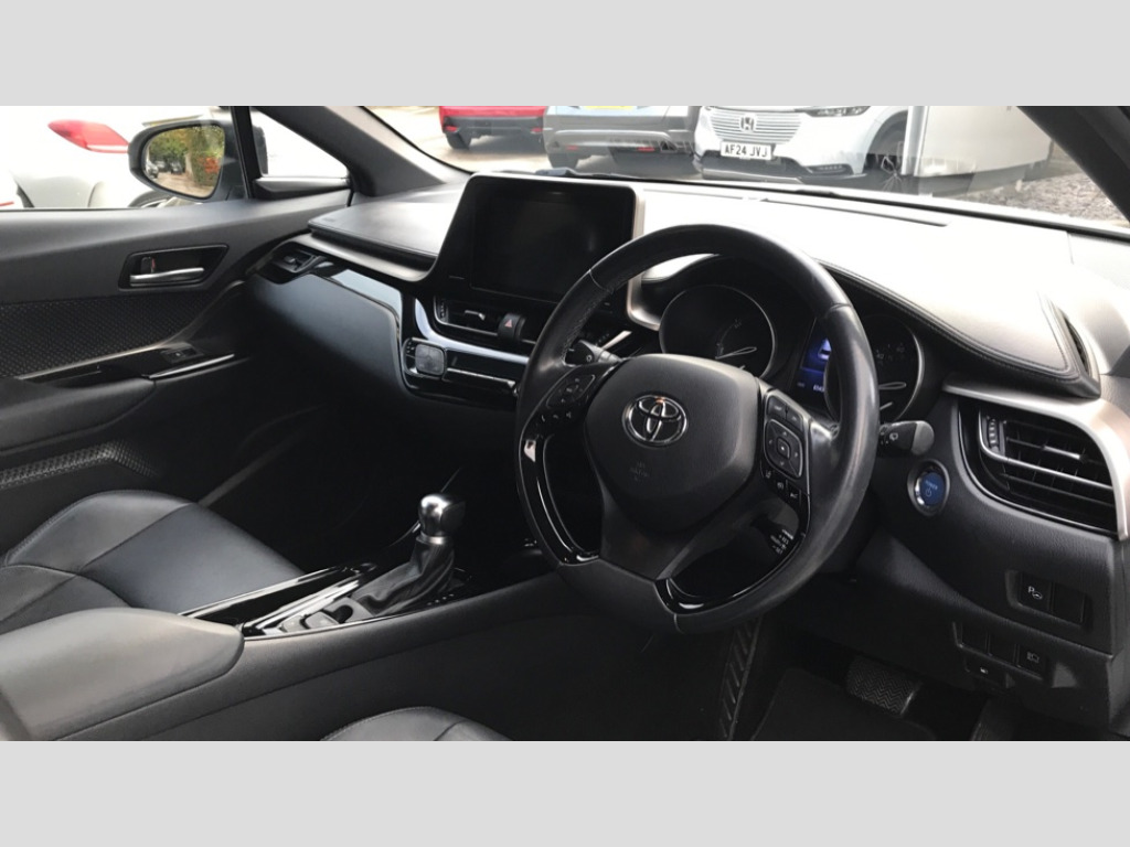 Toyota C-HR 1.8 Hybrid Dynamic 5dr CVT 7" Coloured TFT multi informational display, 8" touch screen, Adaptive cruise control, Adjustable speed limiter, Bluetooth connectivity, Electric power steering, Intelligent parking assist with front & rear parking sensors, Lane change assist and blind spot monitor, Lane departure alert with steering control, Lights on warning, Push button starter, Rear cross traffic alert, Reversing camera, Reversing camera display in audio screen, Road sign assist - RSA, Touch 2 Go navigation system, Trip computer, Voice recognition, Vehicle Stability Control (VSC), 6 speakers, DAB Radio (Digital Audio Broadcasting), Steering wheel mounted controls, USB and Aux in connectors + 12V front outlet, Wi-fi connectivity, Auto high beam, Automatic headlight levelling, Automatic headlights, Automatic retractable door mirrors, Bi-tone black roof, Body colour door handles, Body colour door mirrors, Body coloured bumpers, Boot door release with push button, Door mirror puddle lights, Electric folding/heated door mirrors with integrated indicators, Electrochromatic rear view mirror, Follow me home headlights, Front and rear electric windows, Heated rear windscreen, Intermittent wipe, LED daytime running lights, LED front fog lights, LED headlights with sequential LED indicators, LED High mounted stop lamp, LED rear brake lights, LED rear lights, Rain sensitive windscreen wipers, Rear privacy glass, Rear spoiler, Rear wiper, Shark fin antenna, Trailer sway control, 12V Accessory socket, 3 spoke leather steering wheel with multimedia switches, Ambient lighting, Chrome interior door handles, Clean air filter, Cloth upholstery, Driver + front passenger electric lumbar support, Driver and front passenger personal light, Driver and front passenger Whiplash Injury Lessening seats, Driver/passenger sunvisors and illuminated vanity mirrors, Dual zone automatic air conditioning, Folding rear seats, Front and rear door pockets, Front console box and front cupholders, Front cupholders x 2, Front head restraints, Gear shift indicator, Glovebox with internal light, Hard tonneau cover, Heated driver and front passenger seats, Illuminated door sills, Illuminated entry system, Isofix seat fixing, Leather effect padded armrest on front console box, Leather gearshift, Light blue ambient lighting on front doors, Pollen filter, Rear headrests, Tilt/telescopic steering column, Parking pack - C-HR, 3x3 point rear seatbelts, ABS+EBD+Brake assist, Electronic parking brake, ESP + traction control, Front and rear seatbelt reminder, Front passenger airbag on/off switch, Hill start assist control (HAC), Pre collision system with pedestrian detection, Rear child proof door locks, Road sign information display, Supplemental restraint system (SRS) airbags - 7 airbags including driver, front passenger, curtain, side and knee airbags, Toyota safety sense, Tyre pressure monitoring system, Immobiliser, Intrusion alarm, Motion sensor alarm, Remote central locking, Smart entry + Smart start, Silver dash inserts, 18" 5 double spoke matt black alloy wheels, Tyre repair kit