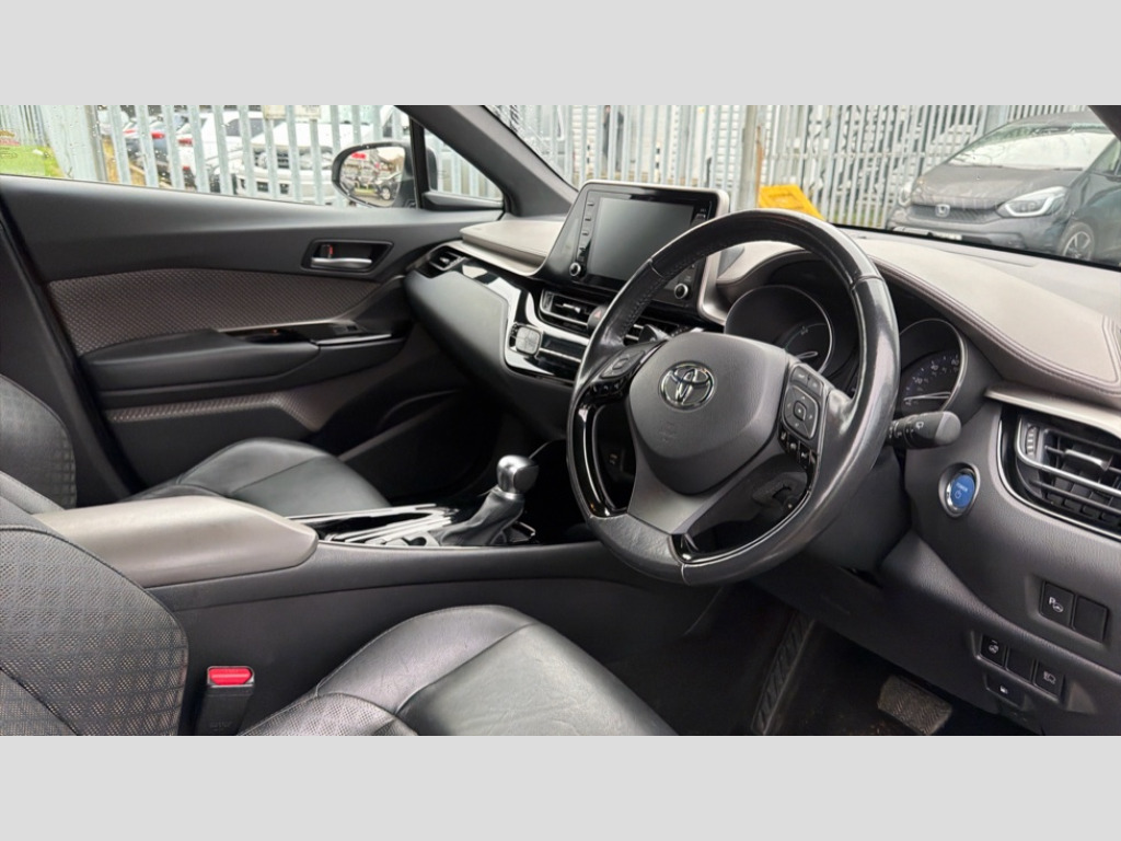 Toyota C-HR 1.8 Hybrid Excel 5dr CVT 4.2" coloured TFT screen for multi-information display, Adaptive cruise control, Bluetooth connectivity, Electric power steering, Hybrid system indicator, Lane departure alert with steering control, Remote boot door release in cabin, Remote boot door release in key, Reversing camera, Road sign assist - RSA, Simple Intelligent parking assist, Touch 2 Go navigation system, Trip computer, Voice recognition, Vehicle Stability Control (VSC), 6 speakers, Aux connectors + 12V front outlet, DAB Radio (Digital Audio Broadcasting), Toyota touch 2 multimedia system with 8" display, USB connector integrated with radio and CD player, Wi-fi connectivity, Adaptive front light system, Adaptive LED Headlights, Anti-jam protection on power windows, Auto high beam, Auto up and down function on all power windows, Automatic headlight levelling, Automatic headlights, Automatic headlights cut-off, Automatic wipers with heated folding mirrors, Black and body coloured rear bumper, Black front bumper, Black upper front grille, Body colour door handles, Body colour door mirrors, Boot door release with push button, Electric heated door mirrors, Follow me home headlights, Front and rear power windows, Front spoiler, Honeycomb lower front grille, LED daytime running lights, LED fog lights, LED front light guide, LED High mounted stop light, LED rear brake lights, LED rear combination lights, Noise reduction layer on front windows and windscreen, Power adjustable door mirrors, Privacy glass, Rear spoiler, Rear tailgate, Rear window defogger, Rear window wiper, Shark fin antenna, UV-filter on driver and passenger windows, UV-filter on rear windows, 12v power outlet - front, 3 rear headrests, 3 spoke leather steering wheel, 60/40 split folding rear seat, Adjustable rear headrests, Adjustable speed limiter switch on steering wheel, Assist grips front and centre pillar, Audio and telephone switches on steering wheel, Black front door assist grips, Blue ambient lighting on front cup holders, Blue ambient lighting on front doors, Boot light, Chrome interior door handles, Driver and front passenger personal light, Driver and front passenger Whiplash Injury Lessening seats, Driver and passenger seatback pockets, Dual zone automatic air conditioning, Floor mats, Front cupholders, Front head restraints, Front sports seats, Glovebox with internal light, Hard tonneau cover, Heated driver and front passenger seats, Heated steering wheel, Hooks for luggage holding net, Humidifying Nanoe air purifier, Illuminated entry system, Isofix attachments on outer rear seats, Leather gearshift, Light on driver sun visor, Light on passenger sun visor, Manual telescopic steering wheel, Manual tilt steering wheel, Manually height adjustable front passenger seat, Manually reclining front passenger seat, Manually sliding front passenger seat, Microphone on front personal light, Mirror on driver sun visor, Mirror on passenger sun visor, Multimedia switches on steering wheel, Pollen filter, Power adjustable lumbar support on driver seat, Power height adjustable driver seat, Power reclining driver seat, Power sliding driver seat, Power tilting cushion on driver seat, Shopping bag hooks, Slow opening on lower glovebox, Voice recognition switch on steering wheel, Leather pack - C-HR, Tech with parking sensor pack - C-HR, 16 Disk front wheel brake, 3x3 point rear seatbelts, ABS+EBD+Brake assist, Electronic parking brake, ESP + traction control, Front and rear seatbelt reminder, Front passenger airbag on/off switch, Hill start assist control (HAC), Pre collision system with pedestrian detection, Pre-tensioners and force limiters, Rear door child safety locks, SRS Airbags - Driver + Front passenger, front side, front and rear curtain and driver's knee airbags, Toyota safety sense, Tyre pressure monitoring system, Glass-breaking alarm sensors, Immobiliser, Intrusion alarm, Intrusion sensor, Motion sensor alarm, Power door locks, Power passenger window lock, Remote central locking, Remote door lock, Black lower dashboard, Black lower driver dashboard, Dark brown upper dashboard, Piano black console, Silver deco line on upper dashboard, Tyre repair kit