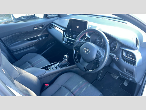 Toyota C-HR 1.8 Hybrid GR Sport 5dr CVT 4.2" coloured TFT screen for multi-information display, Adaptive cruise control, Apple car play and Android auto, Bluetooth connectivity, E-call, Electric power steering, Hybrid system indicator, Lane departure alert with steering control, Lane trace assist, Push button tailgate release, Remote boot door release in cabin, Remote boot door release in key, Reversing camera, Road sign assist - RSA, Simple Intelligent parking assist, Smart voice assist, Touch 2 Go navigation system, Trip computer, Voice recognition, Wireless smartphone integration, Vehicle Stability Control (VSC), 6 speakers, AM/FM radio, DAB Radio (Digital Audio Broadcasting), Toyota touch 2 multimedia system with 8" display, USB connector, Wi-fi connectivity, Adaptive front light system, Adaptive LED Headlights, Anti-jam protection on power windows, Auto high beam, Auto up and down function on all power windows, Automatic headlight levelling, Automatic headlights, Automatic headlights cut-off, Black and body coloured rear bumper, Black upper front grille, Body colour door handles, Body colour door mirrors, Body coloured front bumper, Boot door release with push button, Chrome front lower bumper, Electric heated door mirrors, Follow me home headlights, Front and rear power windows, Front spoiler lip in black, Headlight cut off reminder, Honeycomb lower front grille, LED daytime running lights, LED fog lights, LED front light guide, LED High mounted stop light, LED rear brake lights, LED rear combination lights, Noise reduction layer on front windows and windscreen, Power adjustable door mirrors, Privacy glass, Rain sensor, Rear sequential indicators, Rear side wing doors, Rear spoiler, Rear tailgate, Rear window defogger, Rear window wiper, Shark fin antenna, UV-filter on driver and passenger windows, UV-filter on rear windows, Variable front intermittent wipers, 12v power outlet - front, 3 rear headrests, 3 seat bench in 2nd row, 3 spoke perforated leather steering wheel, 60/40 split folding rear seat, Adjustable rear headrests, Adjustable speed limiter switch on steering wheel, Assist grips front and centre pillar, Audio and telephone switches on steering wheel, Black front door assist grips, Blue ambient lighting on front cup holders, Blue ambient lighting on front doors, Boot light, Chrome interior door handles, Cloth upholstery, Driver and front passenger personal light, Driver and front passenger Whiplash Injury Lessening seats, Driver and passenger seatback pockets, Dual zone automatic air conditioning, Floor mats, Front cupholders, Front head restraints, Front sports seats, Glovebox with internal light, Hard tonneau cover, Heated driver and front passenger seats, Hooks for luggage holding net, Humidifying Nanoe air purifier, Illuminated entry system, Isofix attachments on outer rear seats, Leather gearshift, Light on driver sun visor, Light on passenger sun visor, Manual telescopic steering wheel, Manual tilt steering wheel, Manually height adjustable driver seat, Manually height adjustable front passenger seat, Manually reclining driver seat, Manually reclining front passenger seat, Manually sliding driver seat, Manually sliding front passenger seat, Microphone on front personal light, Mirror on driver sun visor, Mirror on passenger sun visor, Multimedia switches on steering wheel, Pollen filter, Power adjustable lumbar support on driver seat, Shopping bag hooks, Single front passenger seat, Slow opening on lower glovebox, Voice recognition switch on steering wheel, Tech with parking sensor pack - C-HR, 16 Disk front wheel brake, 3x3 point rear seatbelts, ABS+EBD+Brake assist, Electronic parking brake, Front and rear seatbelt reminder, Front passenger airbag on/off switch, Hill start assist control (HAC), Pre collision system with pedestrian detection, Pre-tensioners and force limiters, Rear door child safety locks, SRS Airbags - Driver + Front passenger, front side, front and rear curtain and driver's knee airbags, Toyota safety sense, Tyre pressure monitoring system, Tyre pressure warning system, Acoustic vehicle alert system (AVAS), Glass-breaking alarm sensors, Immobiliser, Intrusion alarm, Intrusion sensor, Motion sensor alarm, Power door locks, Power passenger window lock, Remote central locking, Black lower dashboard, Black upper dashboard, Piano black console, Silver deco line on upper dashboard, 19" Black machined alloy wheels, Tyre repair kit