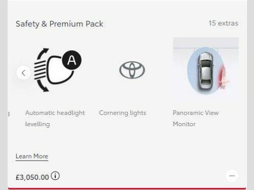 The vehicle also features Front & rear Dashcams, intelligent adaptive cruise control, including adaptive functionality, and heated front seats for added comfort. These features indicate how this vehicle is better equipped than other similar vehicles. Premium and Safety Pack, Nextbase Front and Rear Facing Dash Camera, Suede and Synthetic Leather - Black, 12.3in Digital Combimeter, 12.3in Multimedia Display Screen, 20in Alloy Wheels - 5-Double-Spoke Black Machined-Face, 3-Spoke Synthetic Leather Steering Wheel, 4 Rear Parking Sensors, ABS - Anti Lock Braking System, Acceleration Suppression at Low Speeds, Adjustable Rear Headrests, Adjustable Speed Limiter - ASL, Airbags - Driver Knee, Airbags - Driver and Passenger - Side, Anti-Jam Protection on Power Windows, Audio and Telephone Switches on Steering Wheel, Auto Dimming Rear View Mirror, Auto Headlights, Auto Up and Down Function on Power Windows, Auto Wipers, Automatic Headlight Cut-Off, Automatic High Beam, Automatic Rear Flashing Hazard Lights, Automatically Retractable Power-Adjustable Heated Door Mirrors, Aux-In Connector, Black Bi-Tone Roof, Black Centre Air Vent, Black Rear Spoiler, Black Side Air Vents, Black Wheel Arch Moulding, Blind Spot Monitor - BSM, Bluetooth Connectivity, Body Coloured Door Handles, Body-Coloured Front Bumper, Boot Door Release with Push Button, Boot Light, Boot Underfloor Storage, Child Safety Door Locks, Coat Hooks - 2x Rear, Customisable Multi-Ambient Illuminated Entry System, Customisable Multi-Ambient Lighting on Front Doors, Dark Grey Interior Door Handles, Digital Audio Broadcast - DAB, Digital Speedometer, Digital Tachometer, Driver and Front Passenger Personal Lights, Driver and Front Passenger Whiplash Lessening - Headrest, Dual-Zone Automatic Air Conditioning, EBD - Electronic Brakeforce Distribution, EBS - Emergency Brake Signal, Electric Power Steering - EPS, Electronic Parking Brake, Emergency Driving Stop System, Emergency Steering Assist, Floor Mats, Flush Front and Rear Door Handles, Follow Me Home Headlights, Front 12V Power Outlet, Front Console Box, Front Cup Holders, Front Door Pockets, Front Fog Lights - LED, Front LED Light Guide, Front Pillar Assist Grips, Front Power Windows, Front Room Light, Front USB Type-C Connector, Front to Front Oncoming Car and Motorbike Daytime Detection, Full Flat Loading, G-mesh Front Side Grille, GR SPORT Scuff Plates, Glass-Breaking Alarm Sensors, Gloss Black Lower Front Grille with Dark Grey Surround, Glovebox with Light, HAC - Hill Start Assist Control, Hard Tonneau Cover, Head Up Display, Headlight Cut-Off Reminder, Heat Pump System with Humidifier, Heated Driver and Front Passenger Seat, Hooks for Luggage Holding Net, Hybrid System Indicator, ISOFIX Seat Fixing - Rear, Immobiliser, Intelligent Adaptive Cruise Control, Intelligent Clearance Sonar - ICS, Intelligent Front Parking Sensors with Clearance Sonar and Automatic Braking, Intrusion Alarm, Intrusion Sensor, LED Daytime Running Lights, LED Headlights, LED High-Mounted Stop Light, LED Rear Brake Lights, LED Rear Combination Lights, LED Rear Fog Lights, Lane Departure Alert with Switches on Steering Wheel, Lane Trace Assist, Light on Driver Sun Visor, Light on Passenger Sun Visor, Luggage Compartment - 220V Power Outlet, Luggage Floor Board with Protection Mat, Manual Headlight Levelling, Manual Height Adjustable Front Passengers Seat, Manual Tilt Steering Wheel, Manually Reclining Front Passengers Seat, Manually Sliding Front Passenger Seat, Microphone on Front Personal Light, Mirror on Driver Sun Visor, Mirror on Passenger Sun Visor, Motion Sensor Alarm, Multimedia Switches on Steering Wheel, MyT Connected Services, Nanoe-X Air Purifier, Noise Reduction Layer on Front Windows, Noise Reduction Layer on Windscreen, PVC Gear Shift Knob, Passenger Airbag On-Off Switch, Passenger-only Seatback Pocket, Piano Black Door Belt Moulding, Piano Black Front Side Grille, Piano Black Rear Bumper Extension, Plug-in Charger - Fast Charge 32A Mennekes Cable, Pollen Air Filter, Power Adjustable Lumbar Support on Driver Seat, Power Door Locks, Power Height Adjustable Driver Seat, Power Operated Tailgate, Power Reclining Driver Seat, Power Sliding Driver Seat, Power-Tilting Cushion on Driver Seat, Pre-Collision System with Intersection Detection, Pre-Collision Warning System with Pedestrian Detection, Pre-Wiring for Towing Hook, Privacy Glass, Proactive Driving Assist - PDA, Puddle Lights, Rear Bumper with Dark Grey Insert, Rear Cross Traffic Alert - RCTA, Rear Door Pockets, Rear Headrests x3, Rear Passenger Personal Lights, Rear Power Windows, Rear Seats 60-40 Split Folding, Rear Window Defogger, Remote Air Conditioning System, Remote Boot Door Release in Cabin, Remote Door Locking, Reversing Camera, Road Events, Road Sign Assist, Safe Exit Assist, Satin Chrome Insert on Centre Air Vents, Satin Chrome Insert on Side Air Vents, Satin Chrome Side Air Vents Surrounds, Scuff Plates - Aluminium, Seat Belt - Pre-Tensioners and Force Limiters, Seat Belt Reminder - Front and Rear, Seats - Drivers Memory Function, Seats - Front Premium Sport, Single Compartment Glovebox, Slow Opening Lower Glovebox, Smart Entry and Push-Button Start, Smart Voice Assist, Smartphone Remote Door Lock, Smartphone Remote Hazard Lights, Static Guide Lines on Reversing Camera, Steering Wheel - Heated, Steering Wheel - Manual Telescopic Adjustment, Suede Front Door Trim, Suede Rear Door Armrests, Supplemental Restraint System - SRS - Airbags - 3 Airbags, Toyota Safety Sense with Over-the-Air Updates, Toyota Smart Connect Multimedia System, Toyota Touch 2 with Go Navigation, Turning Signal Integrated in Door Mirrors - LED, Tyre Pressure Warning System, Tyre Repair Kit, USB Connector - Rear, UV-Filter on Drivers and Front Passenger Windows, UV-Filter on Rear Windows, VSC - Vehicle Stability Control, Variable Intermittent Windscreen Wipers, Voice Recognition, Voice Recognition Switch on Steering Wheel, Wireless Mobile Phone Charger, Wireless Smartp