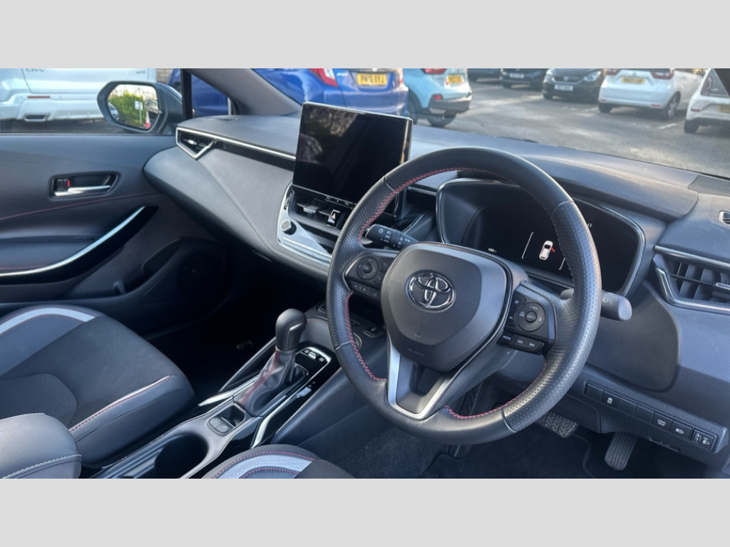 Toyota Corolla 1.8 Hybrid GR Sport 5dr CVT 10.5" Multimedia display screen, Bluetooth telephone connectivity, Connected car functionality upgrade, tracker, remote status and e-care, Drive mode select (Eco, Normal), E-call, Electrically assisted power steering, EV drive indicator, Front and rear parking sensors, Full Digital 12.3" TFT Digital Combimeter, Intelligent clearance sonar, Key reminder warning, Lane Departure Alert (LDA) switch on steering wheel, Memory on adjustable speed limiter, MyT connected services, Proactive driving assist (PDA), Reversing camera, Smart entry and push button start with GR Logo, Smartphone integration with Apple CarPlay and wired android auto, Tailgate, Toyota remote services, Toyota smart connect navigation, Wireless charger, Gasoline particulate filter, Vehicle Stability Control (VSC), 6 speakers, AM/FM radio, DAB Digital radio, Front USB-C in centre console, Front USB-C in dashboard, Smart voice assist/ Voice recognition, USB and Aux in connectors + 12V front outlet, Anti-jam protection on power windows, Auto up and down function on all power windows, Automatic folding mirrors, Automatic headlights with high beam assist, Black centre and side air vents, Black toyota logo in front, Body coloured bumpers, Body coloured door mirrors, Body coloured outside door handles, Dark chrome lower grille, Electrochromatic mirror, Follow me home headlights, GR Sport dark chrome front mesh grille and black rear grille, GR Sport exclusive under guard, GR sport scuff plates, LED daytime running lights, LED dual beam projector headlights, LED front fog lights, LED High mounted stop light, LED rear combi lights with LED lightguide, Manual headlight levelling system, New grille pattern, Noise reduction layer on windscreen, Piano black diffuser, Power adjustable heated door mirrors, Power front windows, Power rear windows, Privacy glass with UV filter, Rain sensing wipers, Rear side wing doors, Rear window defogger, Rear window wiper, Reverse tilting door mirrors, Rocker and door lower moulding, Roof spoiler, Satin chrome insert on front air vents, Satin chrome insert on front door assist grips, Satin silver front spoiler, Shark fin antenna, Tailgate release with push button, Time adjustment on intermittent wiper, Turning signal integrated indicators in door mirrors, Unique lower skirt, Unique side rocker with black insert, UV-filter on driver and passenger windows, 2 Shopping bag hooks in luggage compartment, 3 rear headrests, 3 seat bench in 2nd row, 3 spoke steering wheel with satin insert and red stitching, 4 tie down hooks in luggage compartment, 60/40 split folding rear seat, Adaptive cruise control (ACC) switch on steering wheel, Adjustable speed limiter switch on steering wheel, Audio, multimedia and telephone switches on steering wheel, Black armrest on centre console box, Black gear shift console, Boot light, Centre room light, Driver and front passenger personal light, Driver and passenger assist grip, Driver and passenger seatback pockets, Driver and passenger sun visor with mirror and light, Dual zone automatic air conditioning with ECO mode switch, Electric lumbar support for passenger, Fabric/synthetic leather upholstery, Front and rear cup and bottle holders, Front door pockets, Front head restraints, Front passenger seat, Front sliding synthetic leather armrest, Gear knob, GR Sports seats with partial leather bolsters, Heated front seats, Illuminated entry system in room lamp, ISOFIX seat fixing (2 fixings on rear outer seats), Manual height adjustable for driver and front passenger seat, Manually tilt with sliding driver and front passenger seat, Nanoe-X air purifier, Parcel shelf, Pollen filter, Power adjustable lumbar support on driver seat, Power window switches with satin chrome inserts, Rear armrest with 2 cupholders, Rear passenger coat hooks (2), Red stitching on gear shift, Remote air conditioning, Satin chrome inside door handles, Satin chrome surround on speedometer, Sliding armrest on centre console box, Slow opening glovebox with lights, Textile floor mats, Tilt/telescopic steering column, Voice recognition switch on steering wheel, Whiplash Injury Lessening (WIL) feature (active headrest) for seats, White ambient lighting on open tray and front cup holder, Toyota safety sense 3 pack - Corolla, 3x3 point rear seatbelts, Adjustable driver and front passenger seat belt extender to top anchor point, Anti lock braking system + Electronic brake force distribution, Brake assist function, Child locks on rear doors, Downhill Assist Control (DAC), Electronic parking brake, Emergency brake light signal (EBS), Front passenger airbag on/off switch, Front seatbelt reminder, HAC - Hill start assist control, Rear seat belt reminder, Seatbelt pretensioners and force limiters, Supplemental restraint system (SRS) 7 airbags - dual driver, dual side curtain, side impact and driver knee airbags, Traction control, Tyre pressure warning system, Acoustic vehicle alert system (AVAS), Alarm with motion sensor and immobilizer, Power passenger window lock, Remote central locking + deadlocks, GR Sport interior and exterior styling, Satin chrome dash trim, Soft touch texture on upper dashboard, Stitching on lower dashboard, 18" 10 spoke black machined face alloy wheels, Tyre repair kit, Unique wheel finish with red wheel cap