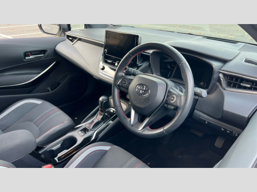 Toyota Corolla 2.0 VVT-i Hybrid GR Sport 5dr CVT 7" Multi information display screen, Bluetooth telephone connectivity, Connected car functionality upgrade, tracker, remote status and e-care, Dynamic radar cruise control (with RSA) including switch on steering wheel, E-call, Electrically assisted power steering, EV drive indicator, Head up Display, Intelligent park assist, Lane Departure Alert (LDA) switch on steering wheel, Memory on adjustable speed limiter, Push button start, Reversing camera, Smartphone integration with Apple CarPlay and Android auto, Gasoline particulate filter, Vehicle Stability Control (VSC), 6 speakers, 8" Touchscreen with MM19 Multimedia system and voice recognition, AM/FM radio, DAB Digital radio, Toyota touch 2 with go navigation system, USB and Aux in connectors + 12V front outlet, USB charging port in centre storage box, Anti-jam protection on power windows, Auto dimming inside rear view mirror, Auto up and down function on all power windows, Automatic folding mirrors, Automatic headlights with high beam assist, Black toyota logo in front, Body colour rear spoiler, Body coloured bumpers, Body coloured door mirrors, Body coloured outside door handles, Dark chrome aluminium roof rails, Follow me home headlights, GR sport scuff plates, LED daytime running lights, LED front fog lights, LED Headlights, LED High mounted stop light, LED rear combi lights with LED lightguide, Noise reduction layer on front windows, Piano black surround on lower front grille with dark chrome mesh effect, Power adjustable heated door mirrors, Power front windows, Power rear windows, Privacy glass, Rain sensing wipers, Rear side wing doors, Rear window defogger, Rear window wiper, Reverse tilting door mirrors, Shark fin antenna, Time adjustment on intermittent wiper, Turning signal integrated indicators in door mirrors, Unique lower skirt, Unique side rocker with black insert, UV-filter on driver and passenger windows, 12v power outlet - luggage side, 3 rear headrests, 3 seat bench in 2nd row, 3 spoke leather steering wheel + gear knob, 60/40 split folding rear seat, Adjustable speed limiter switch on steering wheel, Alcantara/partial leather upholstery, Audio, multimedia and telephone switches on steering wheel, Boot light, Boot underfloor storage, Clean air filter, Driver and front passenger personal light, Driver and passenger assist grip, Driver and passenger seatback pockets, Driver and passenger sun visor with mirror and light, Dual sided deck board in boot, Dual zone automatic air conditioning with ECO mode switch, Fabric armrests, Front and rear cup and bottle holders, Front and rear door pockets, Front head restraints, Front passenger seat, Heated driver and front passenger seats, Illuminated entry system in room lamp, ISOFIX seat fixing (2 fixings on rear outer seats), Leather gear shift with satin chrome on gear shift console, Luggage utility boot rails, Manual height adjustable for driver and front passenger seat, Paddle shifts, Pollen filter, Power adjustable lumbar support on driver seat, Power window switches with satin chrome inserts, Rear armrest with 2 cupholders, Rear passenger air vents, Rear passenger coat hooks (2), Rear passenger personal lights, Retractable tonneau cover with luggage partition net, Satin chrome inside door handles, Shopping bag hooks in luggage compartment, Sliding armrest on centre console box, Slow opening glovebox with lights, Sports seats, Tilt/telescopic steering column, Tonneau cover with under floor storage, Voice recognition switch on steering wheel, Whiplash Injury Lessening (WIL) feature (active headrest) for seats, Parking pack - Corolla, Toyota safety sense 2 pack - Corolla, 3x3 point rear seatbelts, Adjustable driver and front passenger seat belt extender to top anchor point, Anti lock braking system + Electronic brake force distribution, Brake assist function, Child locks on rear doors, Downhill Assist Control (DAC), Electronic parking brake, Emergency brake light signal (EBS), Front passenger airbag on/off switch, Front seatbelt reminder, HAC - Hill start assist control, Rear seat belt reminder, Seatbelt pretensioners and force limiters, Supplemental restraint system (SRS) 7 airbags - dual driver, dual side curtain, side impact and driver knee airbags, Traction control, Tyre pressure warning system, Acoustic vehicle alert system (AVAS), Alarm with motion sensor and immobilizer, Remote central locking + deadlocks, Smart entry, Satin chrome dash trim, Soft touch texture on upper dashboard, Stitching on lower dashboard, Stitching on upper dashboard, Tyre repair kit, Unique wheel finish with red wheel cap